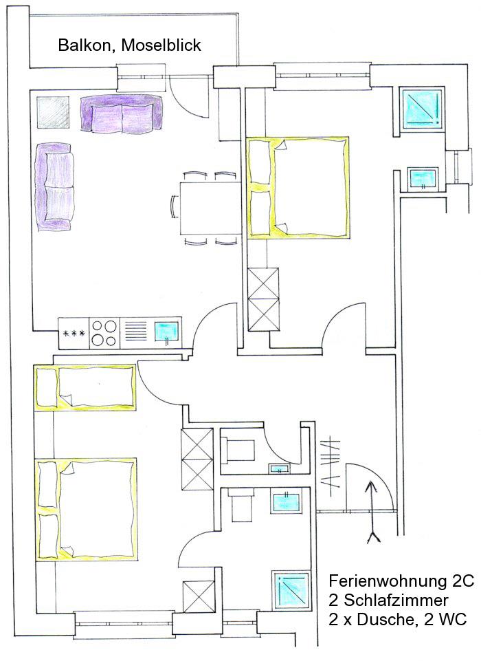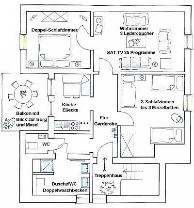 Ferienwohnungen für 2 bis 8 Personen in einer ruhigen Seitenstraße mit Blick zur Burg und/oder Mosel. Kurze Wege, innerhalb weniger Gehminuten erreichen Sie Bus, Bäcker, Edeka-Supermarkt, Weinstuben, Cafés, Restaurants und die Mosel-Fahrrad- und Wanderwege.