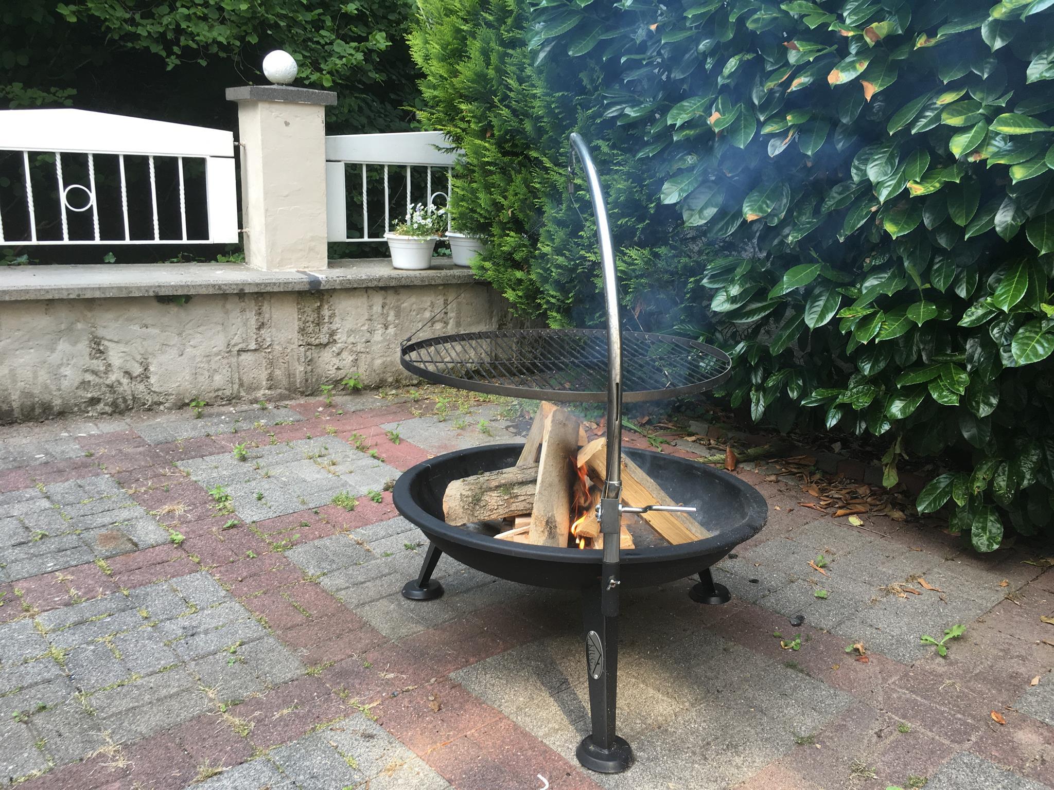 Terrasse mit Sauna, Gartenmöbeln, Rutsche, Sandkasten, Schwenkgrill.