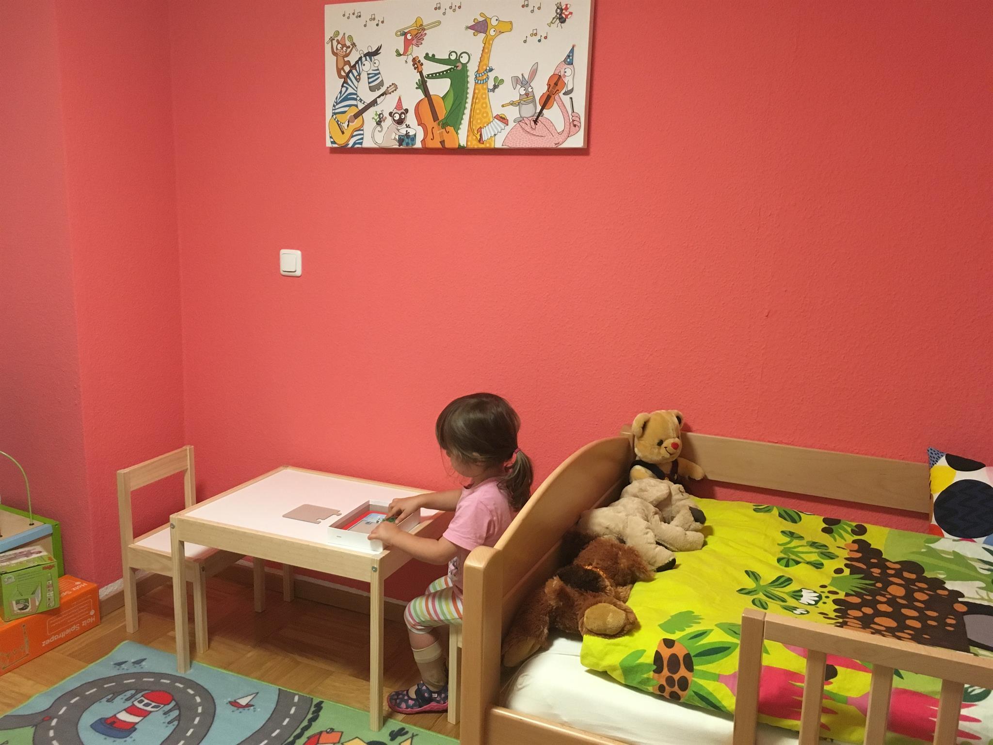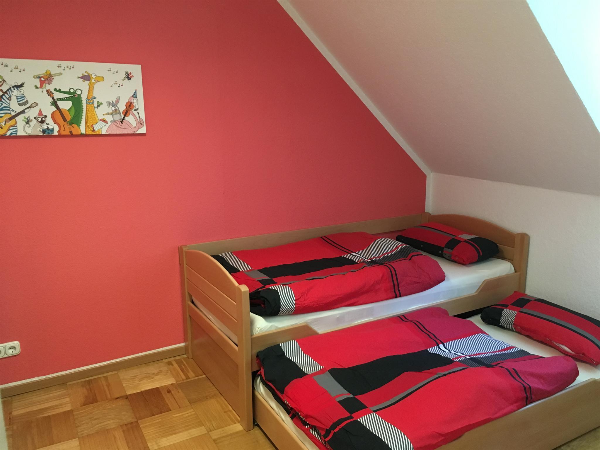 1 Kinderschlafzimmer mit Ausziehbett (2 Einzelbetten 90x200cm und 90x190cm), auch für 2 Erwachsene geeignet;