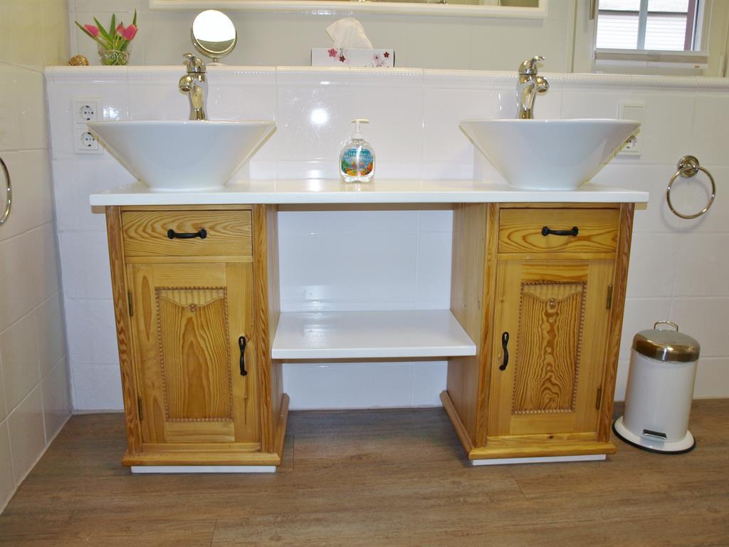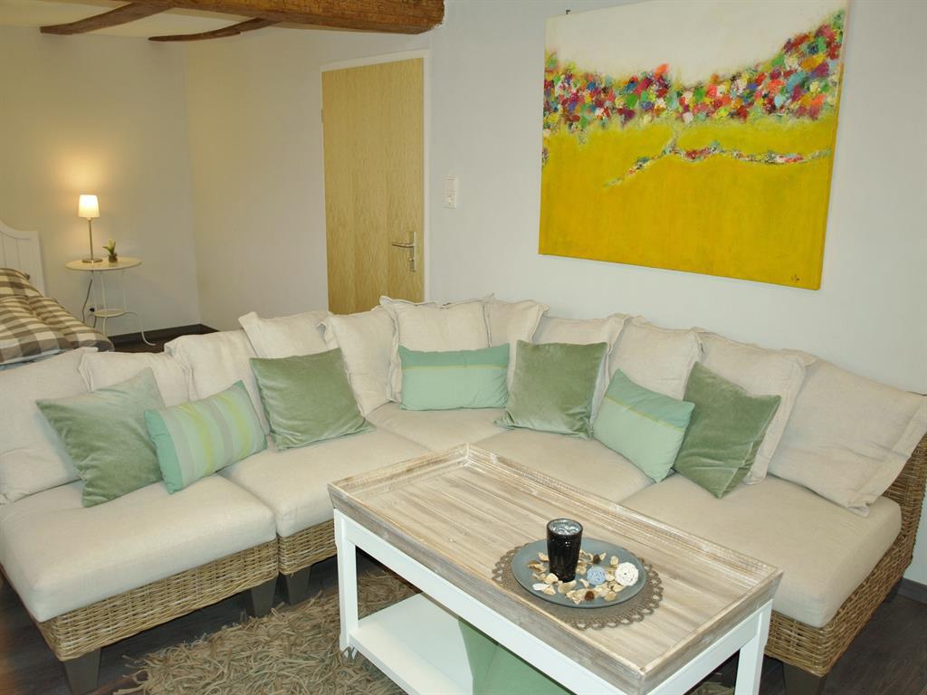 In der ersten Etage finden Sie: das Wohn-/Schlafzimmer mit Doppelbett, Rattansitzgruppe und TV, ein Doppelzimmer und ein Bad mit Doppelwaschbecken, bodengleicher Dusche, WC für Damen und Herren.