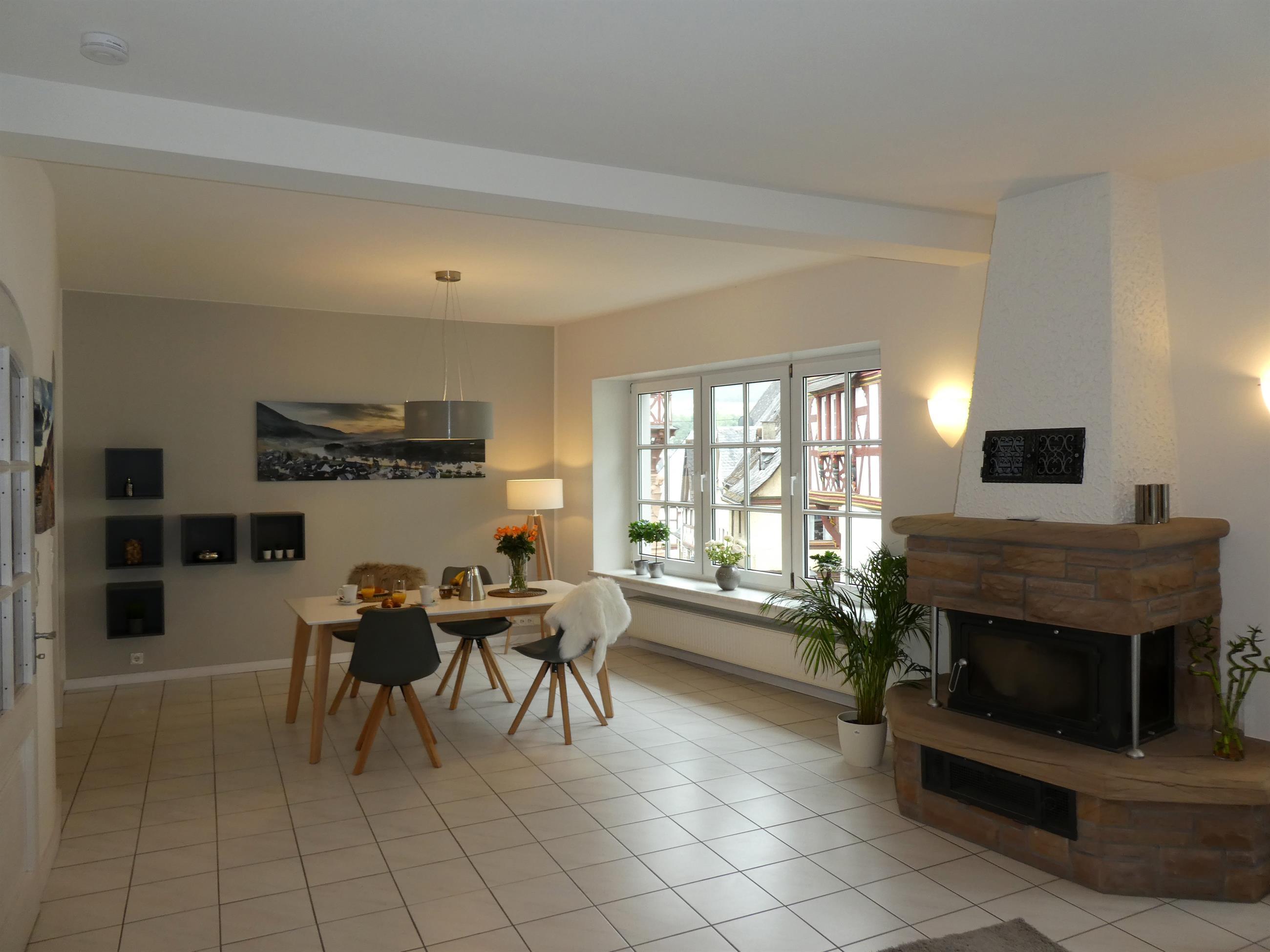 Das Ferienapartment 'Rathausplatz Nr. 9' ist mit seinen 85 qm die ideale Wohlfühloase für zwei bis vier Personen. Das Apartment wurde Anfang 2020 frisch renoviert und erstrahlt mit seinen bequemen und modernen Möbeln im neuen Glanz. Das Highlight ist der großzügige Wohn-und Essbereich: Der Essplatz lädt zum ausgedehnten Frühstück ein; lesen und verweilen Sie im gemütlichen Relax-Sessel; gönnen Sie sich eine Auszeit mit dem 58 Zoll schwenkbaren TV-Gerät; genießen Sie kuschelige Stunden auf der bequemen Couch. Die vielen Fenster durchfluten den Wohnbereich mit Tageslicht. Schauen Sie raus, Sie erwartet ein toller Blick auf den Rathausplatz von Ürzig mit seinen historischen Fachwerkhäusern.
