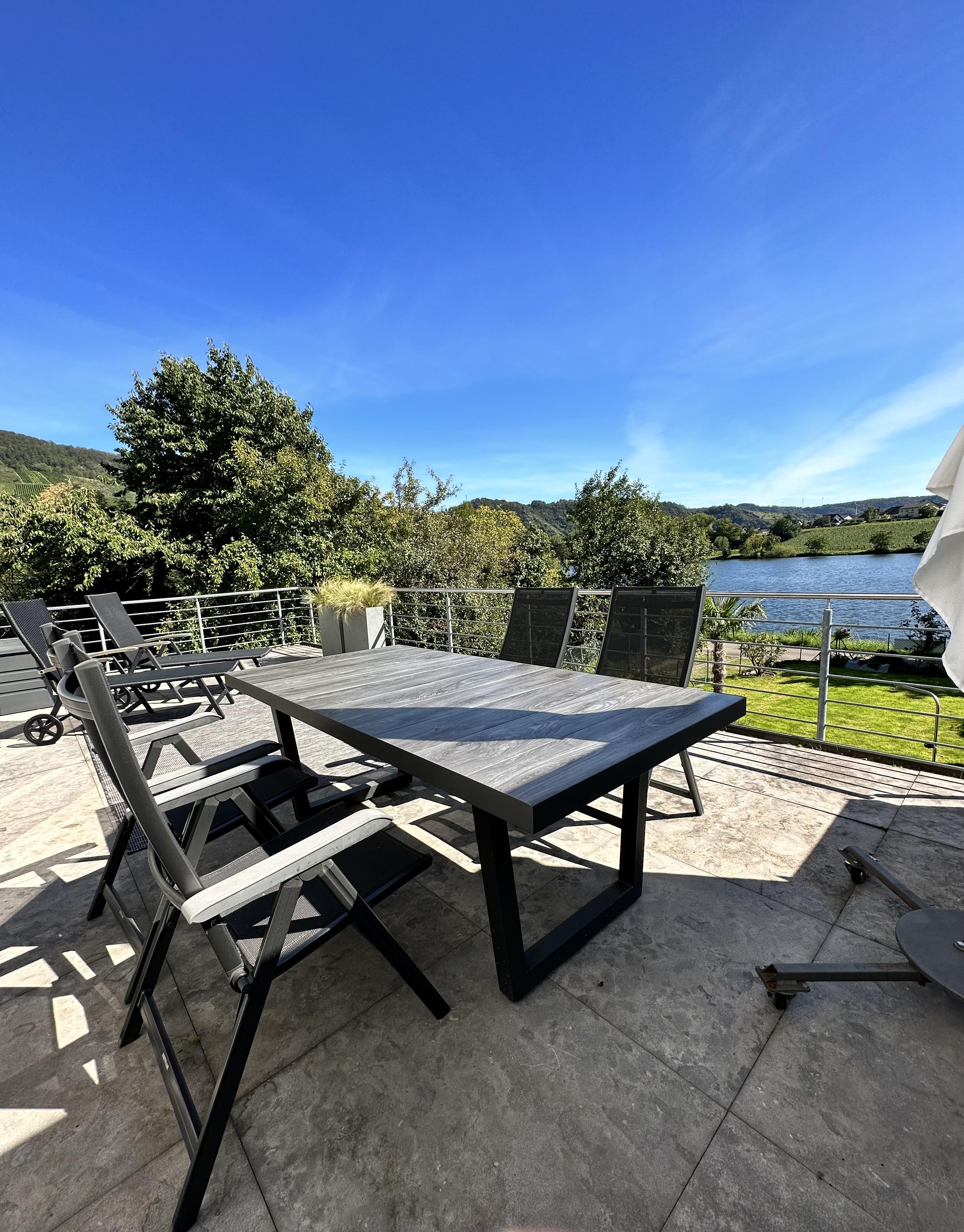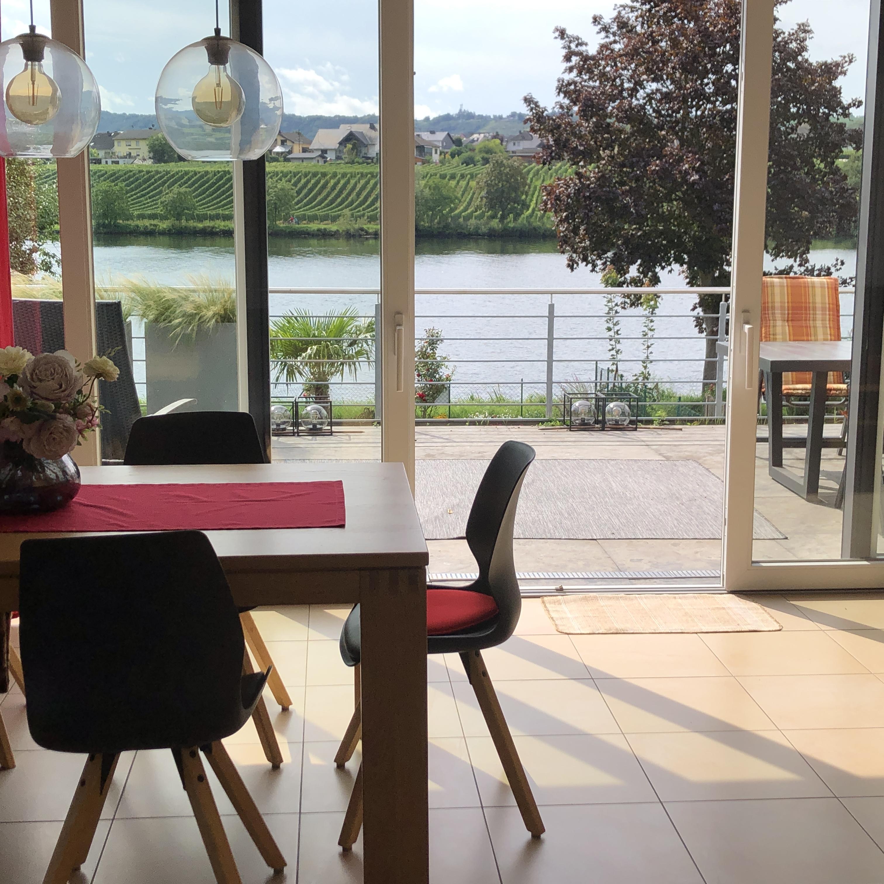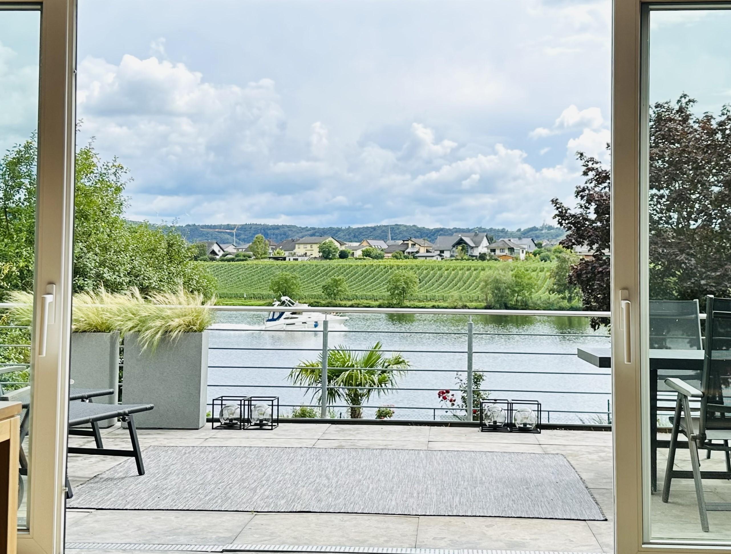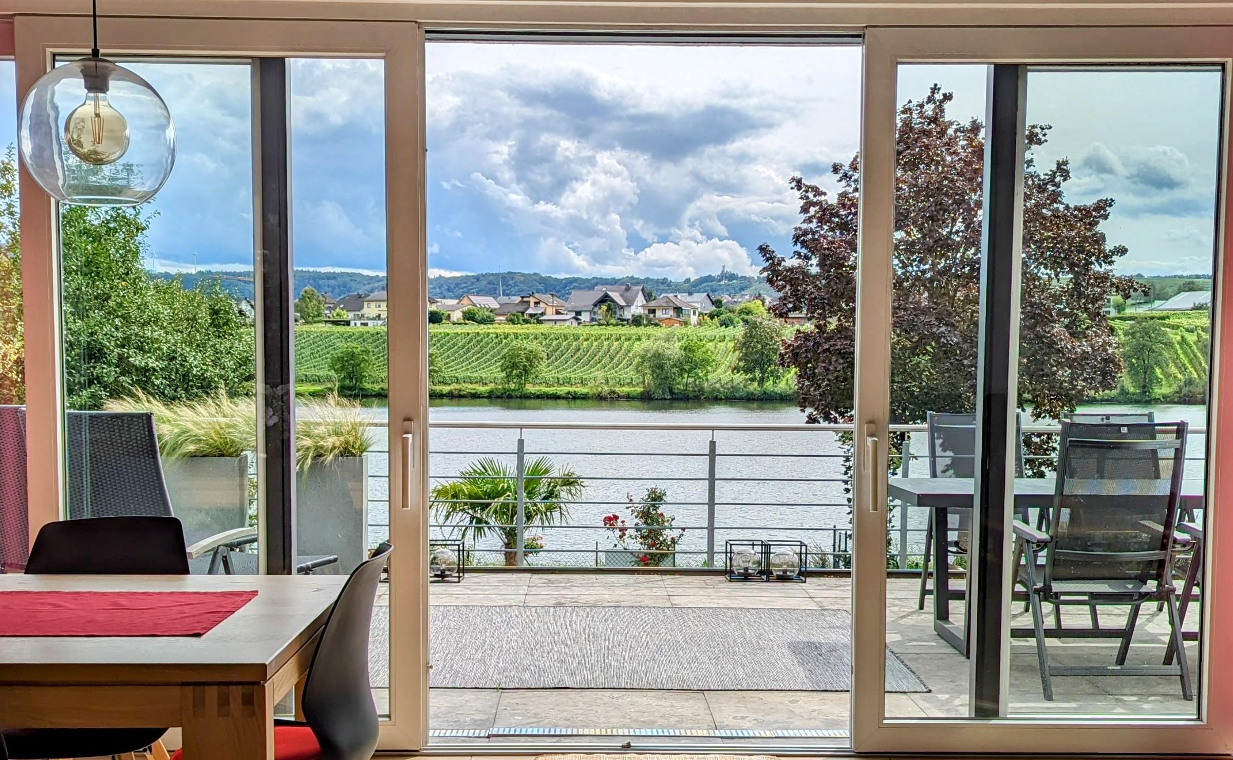 NEU -Direkt an der Mosel gelegen. Sehr große Terrasse mit freiem Blick auf die Mosel, auch aus dem Wohnzimmer heraus. Die moderne, wunderschöne helle Wohnung - barrierearm und mit kompletter Ausstattung - liegt im Erdgeschoß eines 2-Familienhauses. Ein Traum zu jeder Jahreszeit! Ruhige Lage mit eigenem, kostenfreien Parkplatz und abschließbarem Fahrradraum. Wander- und Fahrradwege führen direkt am Haus vorbei. Das Haus liegt am Ortsrand, die berühmten Weinberge von Piesport grenzen direkt daran an. Restaurants, Cafés, Straußwirtschaften und die Schiffsanlegestelle sind in wenigen Minuten zu Fuß zu erreichen. Den modernen Edeka-Markt auf der anderen Moselseite erreichen Sie in 4 Min mit dem Auto. - In der Nähe Bernkastel-Kues (20 Auto-Min.), Trier (30 Auto-Min.),