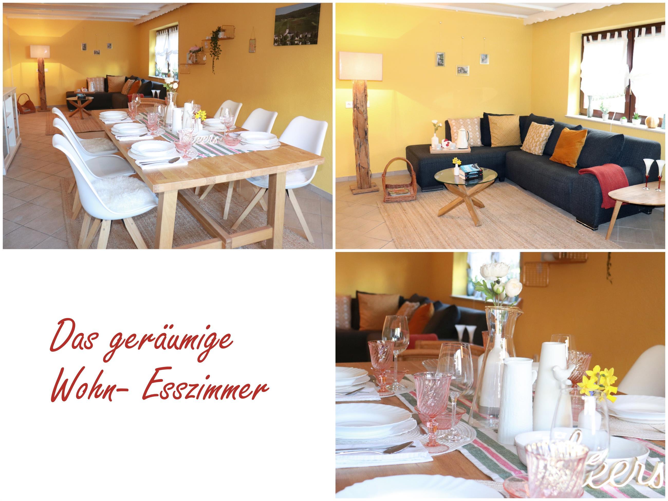 Das geräumige und gemütlich eingerichtete Wohn- Esszimmer bietet Platz für Freunde und die ganze Familie! Eine kleine Auswahl an Büchern und Gesellschaftsspielen liegt für Sie bereit.