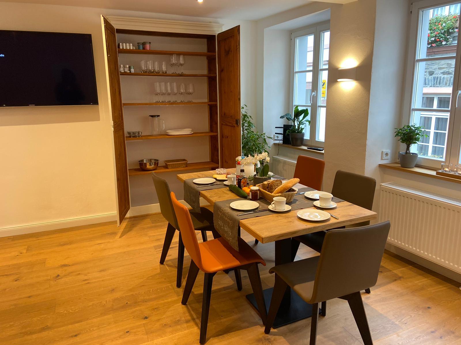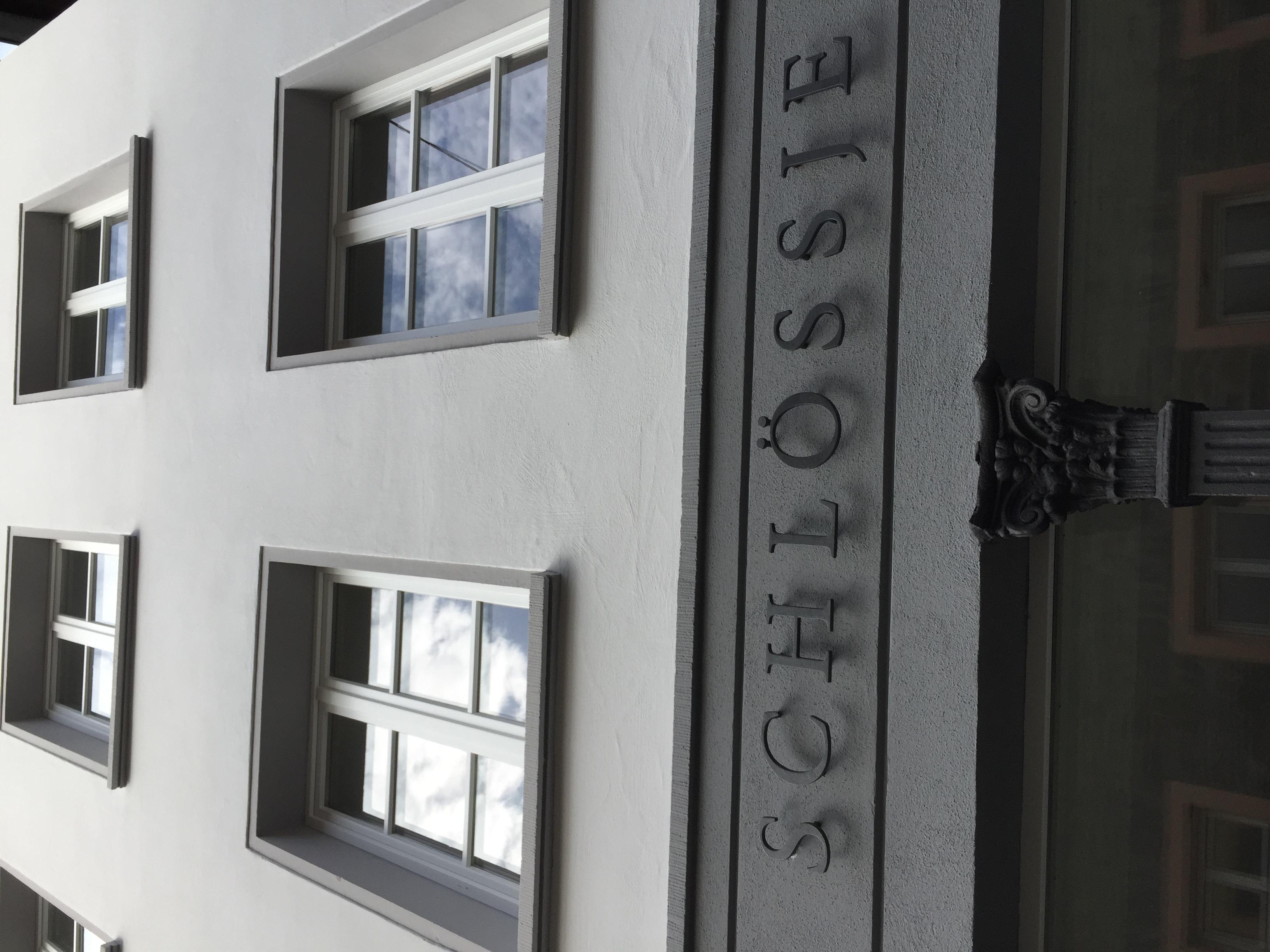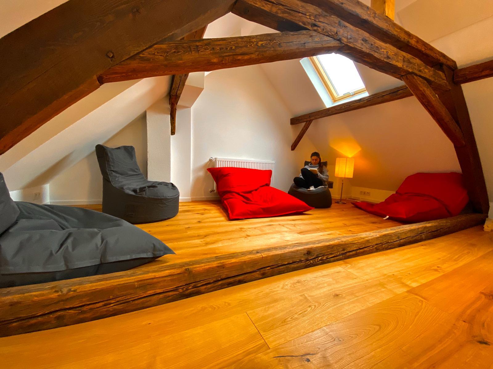 Den Kern bilden vier romantische Doppelzimmer, jeweils mit Ankleide und Bad, die über einer gemütlichen Beletage mit großzügiger Küche und Hauswirtschaftsraum liegen. Eine verträumte Lese-Galerie unterm Dachgebälk schließt das Schlössje nach oben und eine Velogarage im Erdgeschoss nach unten ab. Letztere ist so gemütlich, dass sich hier nicht nur Fahrräder wohlfühlen. Und die Aussichten? Sind geradezu städtisch. Auf Briefkasten und Bäcker gleich gegenüber, auf das Treiben rund um den nahegelegenen Marktplatz, auf die benachbarten Dächer samt Kirche.