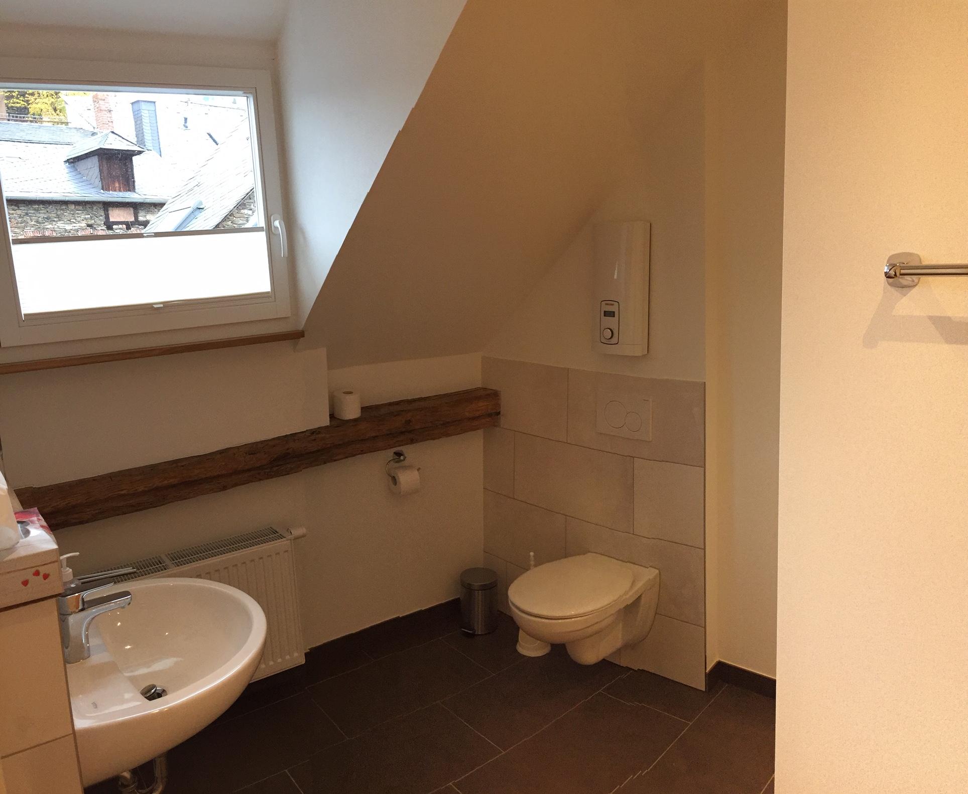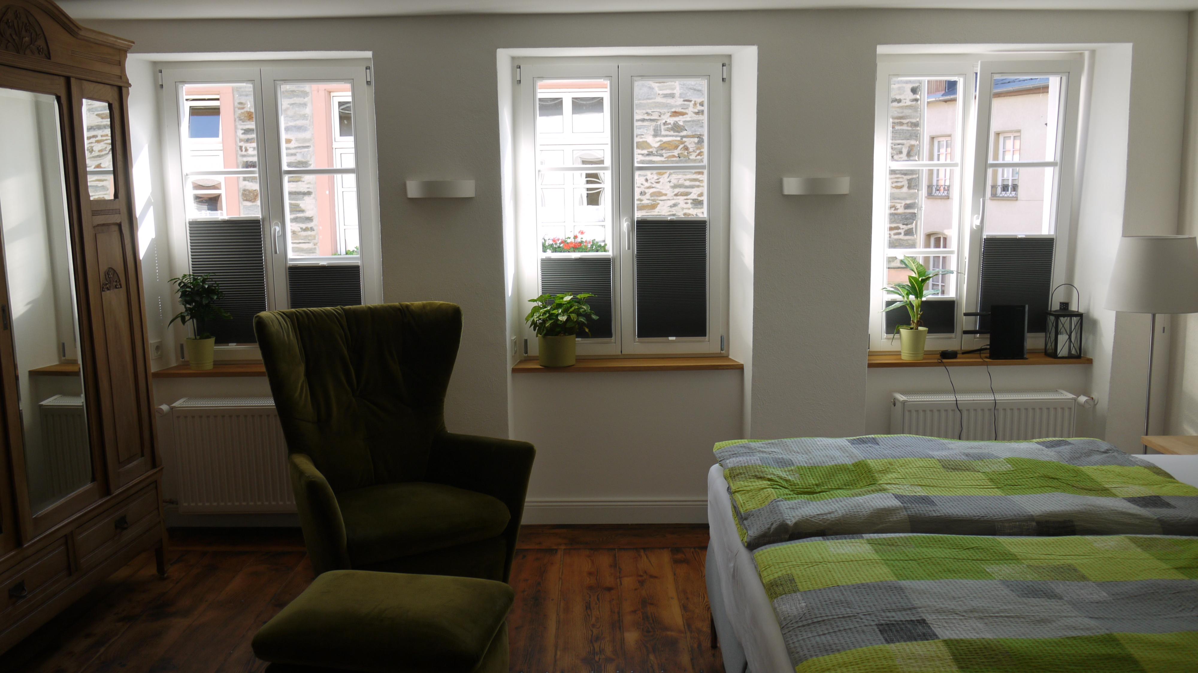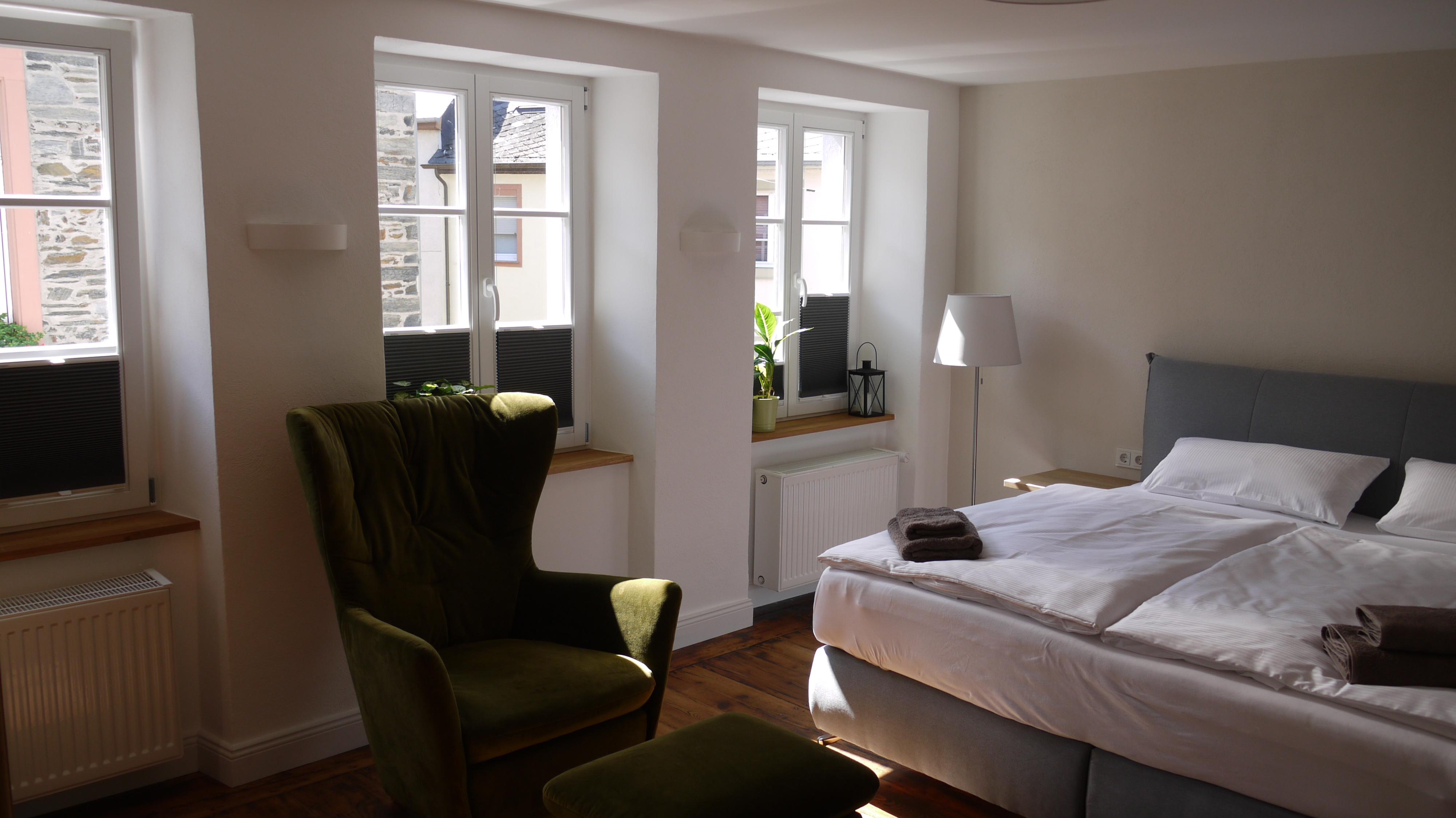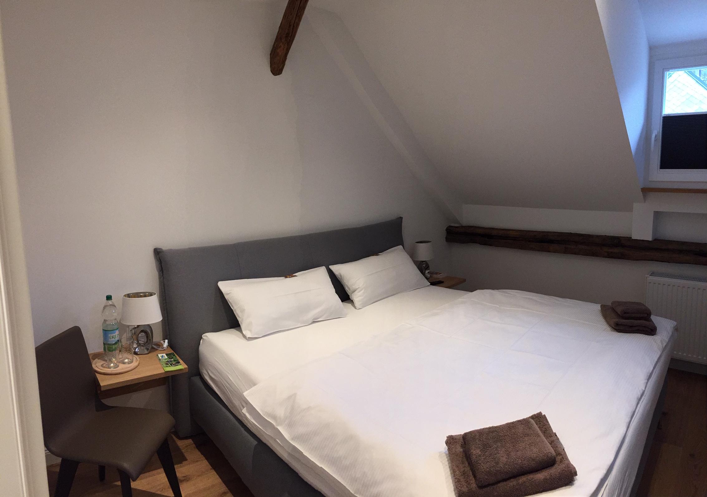 Den Kern bilden vier romantische Doppelzimmer, jeweils mit Ankleide und Bad, die über einer gemütlichen Beletage mit großzügiger Küche und Hauswirtschaftsraum liegen. Eine verträumte Lese-Galerie unterm Dachgebälk schließt das Schlössje nach oben und eine Velogarage im Erdgeschoss nach unten ab. Letztere ist so gemütlich, dass sich hier nicht nur Fahrräder wohlfühlen. Und die Aussichten? Sind geradezu städtisch. Auf Briefkasten und Bäcker gleich gegenüber, auf das Treiben rund um den nahegelegenen Marktplatz, auf die benachbarten Dächer samt Kirche.