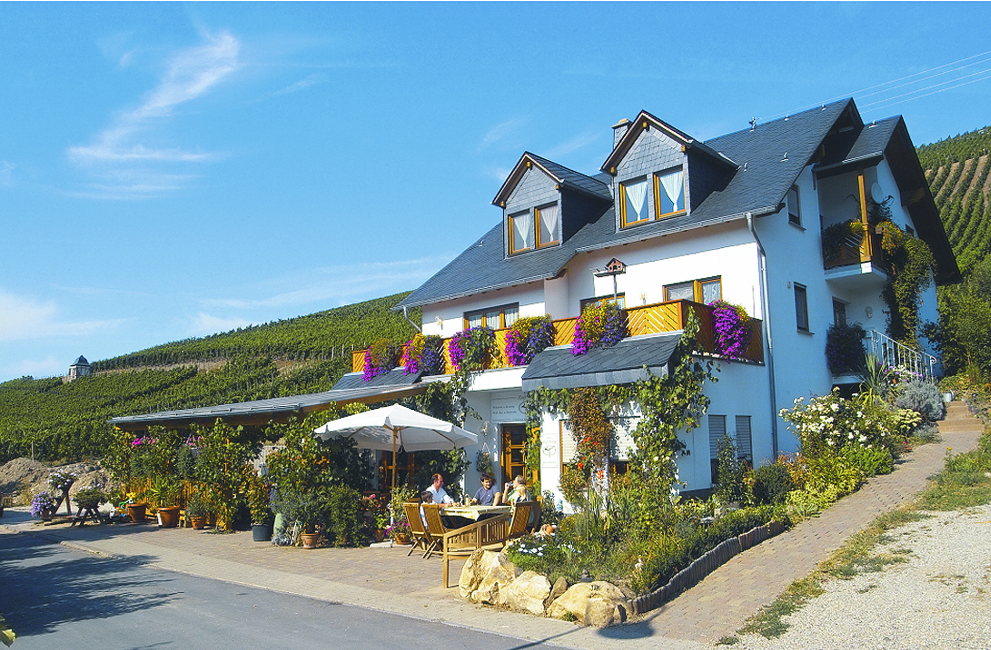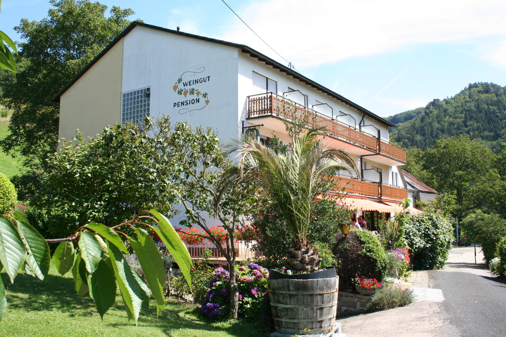Ruhig gelegene Familienpension mit großer Sonnenterrasse und Liegewiese. Geniessen Sie den Blick in den nahegelegenen Wald bei einer guten Tasse Kaffee und selbstgebackenem Kuchen in unserem Café. Große Auswahl an Rieslingweinen.