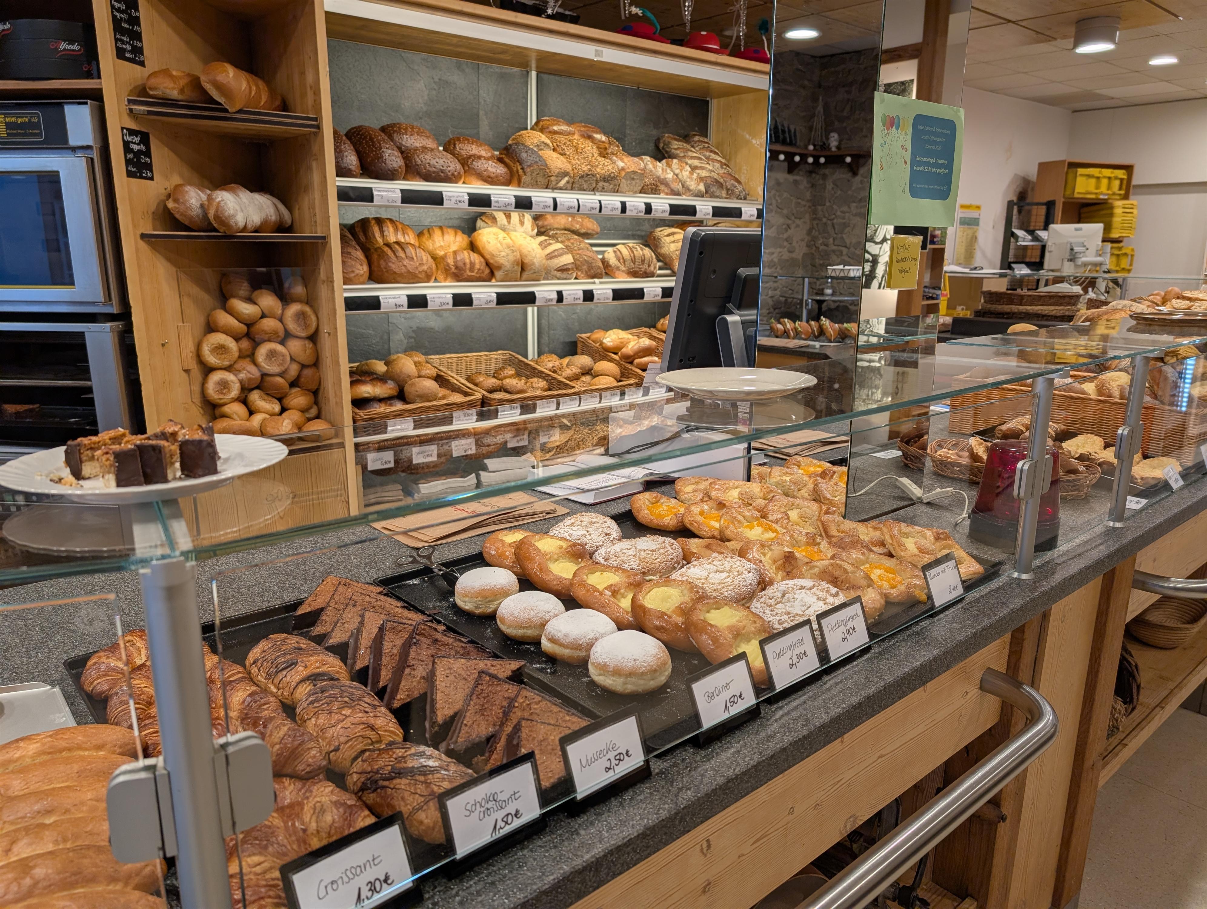 Das Geschäft lädt mit Sitzmöglichkeiten auch zum Verwielen ein. Gemütlich einen Kaffee trinken und ein leckeres Stück Kuchen essen. Oder Backwaren für den täglichen Bedarf einkaufen, fische Brote, Brötchen, Teilchen und mehr.