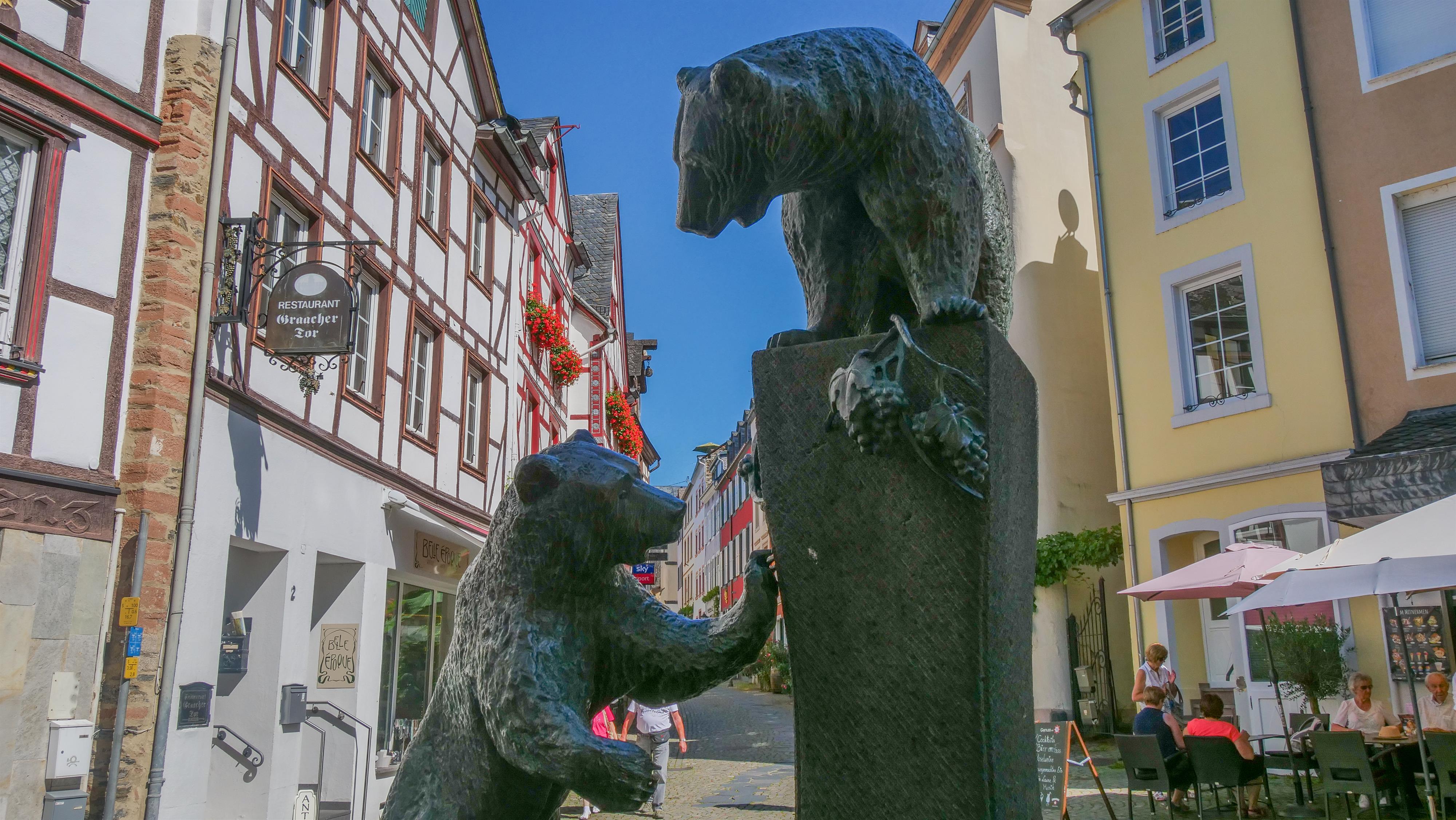 Der Rauschepütz mit Bär an der Graacherstraße wurde 1899 abgebrochen. Seit 1968 steht hier ein neuer Bärenpütz, ein imposantes Werk von Hanns Scherl aus Wittlich: zwei lebensgroße Bären - die Wappentiere der Stadt Bernkastel - auf mächtigem Brunnenbecken aus grauem Basalt.