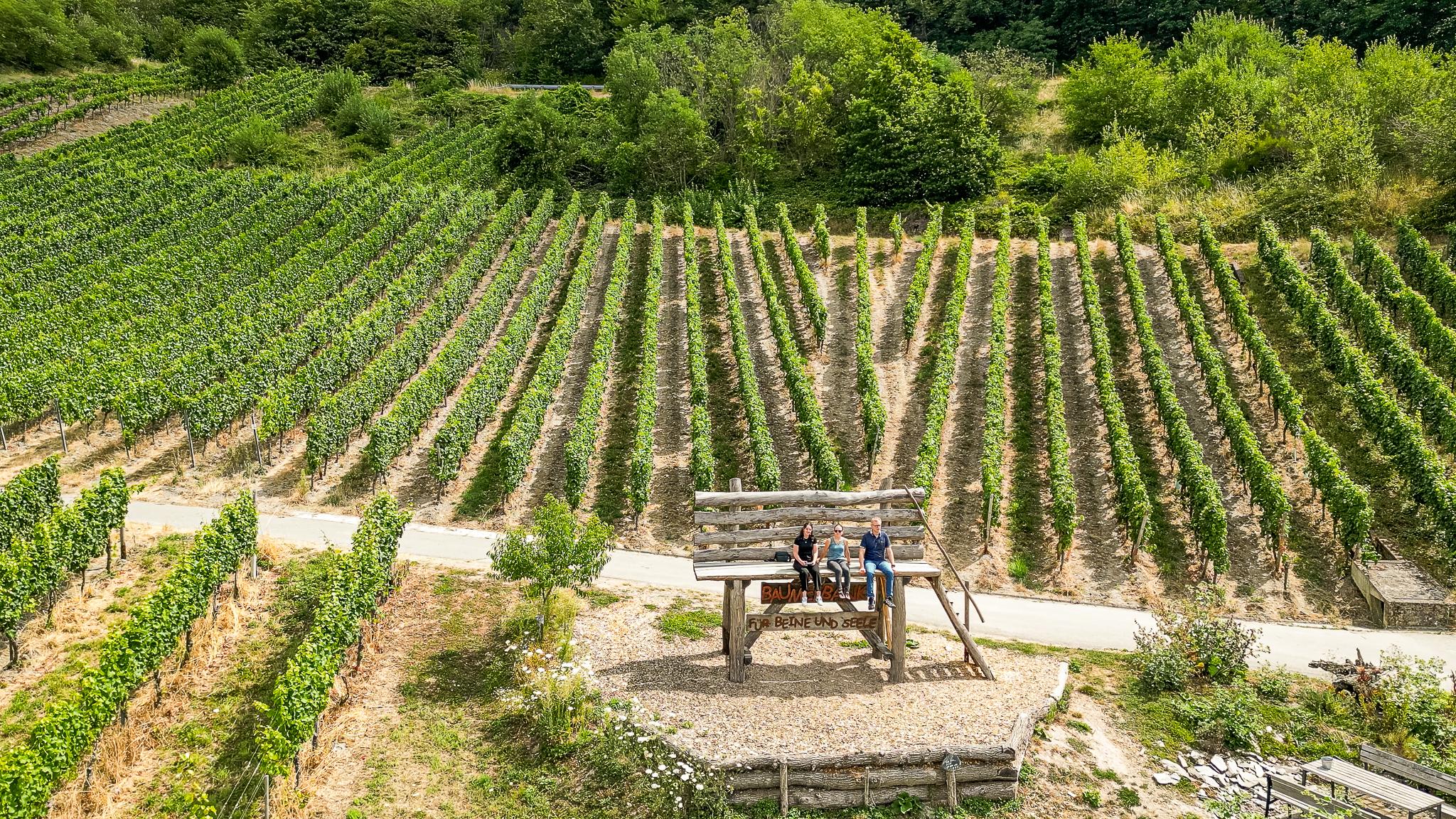 Die Baumelbank liegt auf der rechten Moselseite. Von der Brücke in Piesport ist sie in ca. 35 Minuten zu Fuß zu erreichen. Die Aussicht auf Piesport und die Region ist sehenswert - und das Sitzen etwas besonderes ...