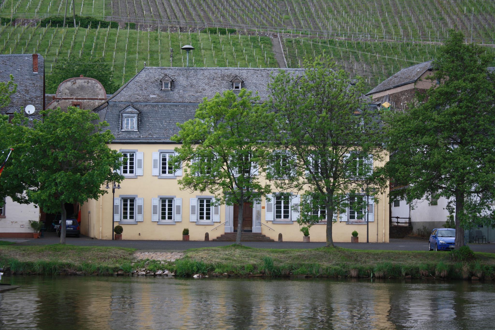 Ein Kreuzgewölbekeller (im rückwärtigen Gebäude) kann ebenfalls gemietet werden. Auskünfte erteilte die Ortsgemeinde Piesport, St. Martinstr. 27, 54498 Piesport, Tel. 06507/2028, Fax: 06507/2026. Ehemaliger Klausenhof: Im Kurstaat Trier, der nach der französischen Revolution sein Ende fand, bestimmte die Geistlichkeit die wirtschaftliche Entwicklung und Architektur. In Piesport zeigte sich dieser wichtige Einfluss auch in etlichen Wein- und Wirtschaftshöfen. Sie prägten das damalige Ortsbild. Der wohl größte Gebäudekomplex ist der ehemalige Hof des Augustinerstifts Klausen gewesen, das „Klausener Gehäus“. Es datiert auf das Jahr 1613. Am ältesten Teil befindet sich eine geschwungene Giebelfassade. Über der rundbogigen Toreinfahrt fallen durch Pfosten geteilte symmetrisch gesetzte Rechteckfenster auf. Die Gesamtanlage muss in seiner Blütezeit sehr imposant gewirkt haben. Die historischen Weinkeller deuten darauf hin, dass der Wein die Haupteinnahmequelle des Stiftsgutes bildete. Die erwirtschafteten Erträge standen der Mönchsgemeinschaft, den Hofleuten und dem Verwalter zu und dienten der klösterlichen Selbstversorgung. Ende des 18. Jahrhunderts entstand ein Vorbau als Wohnhaus mit hohem Mansardendach. Im Portalaufbau steht ein steinernes Versperbild von 1530. In napoleonischer Zeit ersteigerte Josef Hein aus Trier den Klausenhof für 30.000 Francs. Das vorgesetzte Wohnhaus, mit den Initialen JH und der Jahreszahl 1806 am Portal, ging 1830 an die Gemeinde über. Sie nutzte es bis 1970 als Dorfschule. Heute dient das Gebäude als Bürgerhaus mit Festsaal. Das Kelterhaus und die Kellerräume kamen Mitte des 19. Jahrhunderts in den Besitz der Reichsgrafen von Kesselstatt und 1985 in den Besitz der Gemeinde Piesport.