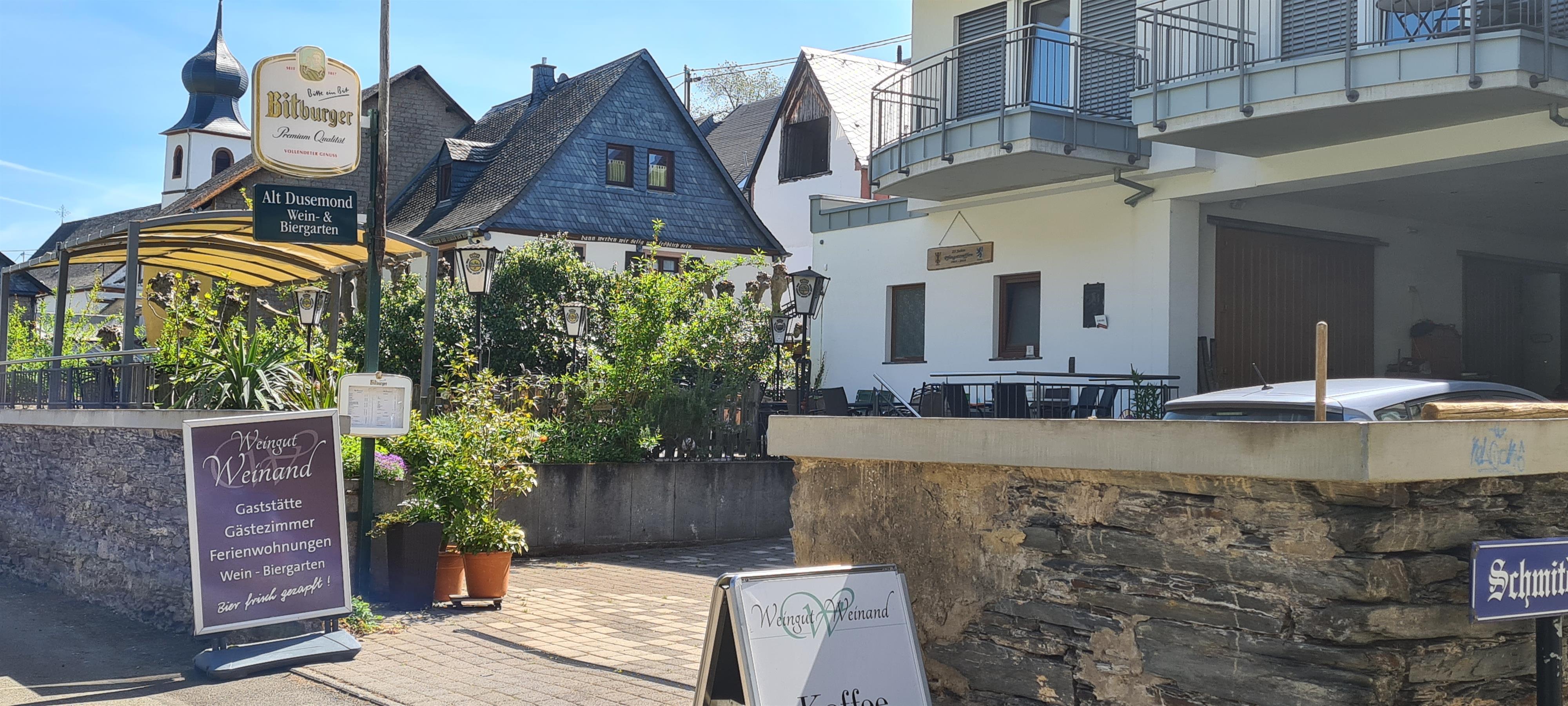 Im idyllischen Moselort Brauneberg liegt das Weingut Weinand. Seit 300 Jahren betreibt die Familie Weinbau an der Mosel. Auf rund einem Hektar Rebfläche wird in den Lagen Brauneberger Jufffer und Brauneberger Juffer-Sonnenuhr Wein angebaut. Dort beträgt die Steigung der Weinberge fast 80% und der Boden besteht aus Devonschiefer, sodass ein einzigartiges Mikroklima entsteht. Probieren können Sie die Weine auf der Terrasse des Weinguts nur wenige Meter von der Mosel entfernt. Oder Sie übernachten direkt beim Winzer, in einer der Gästezimmer des Weingutes.