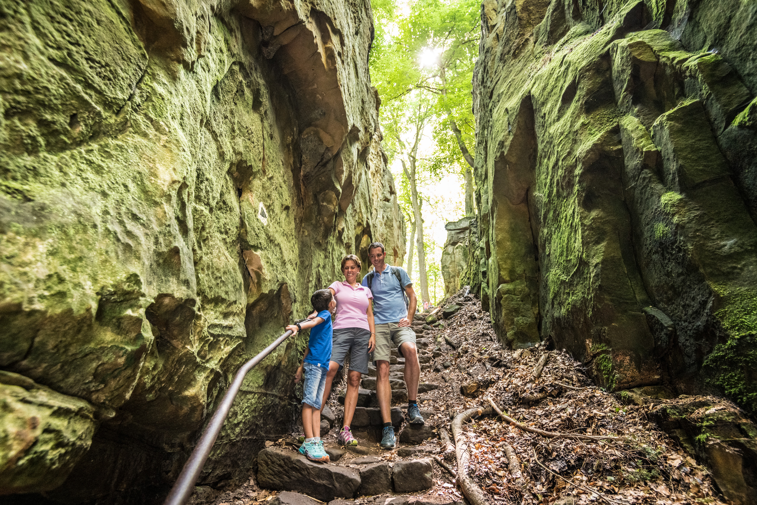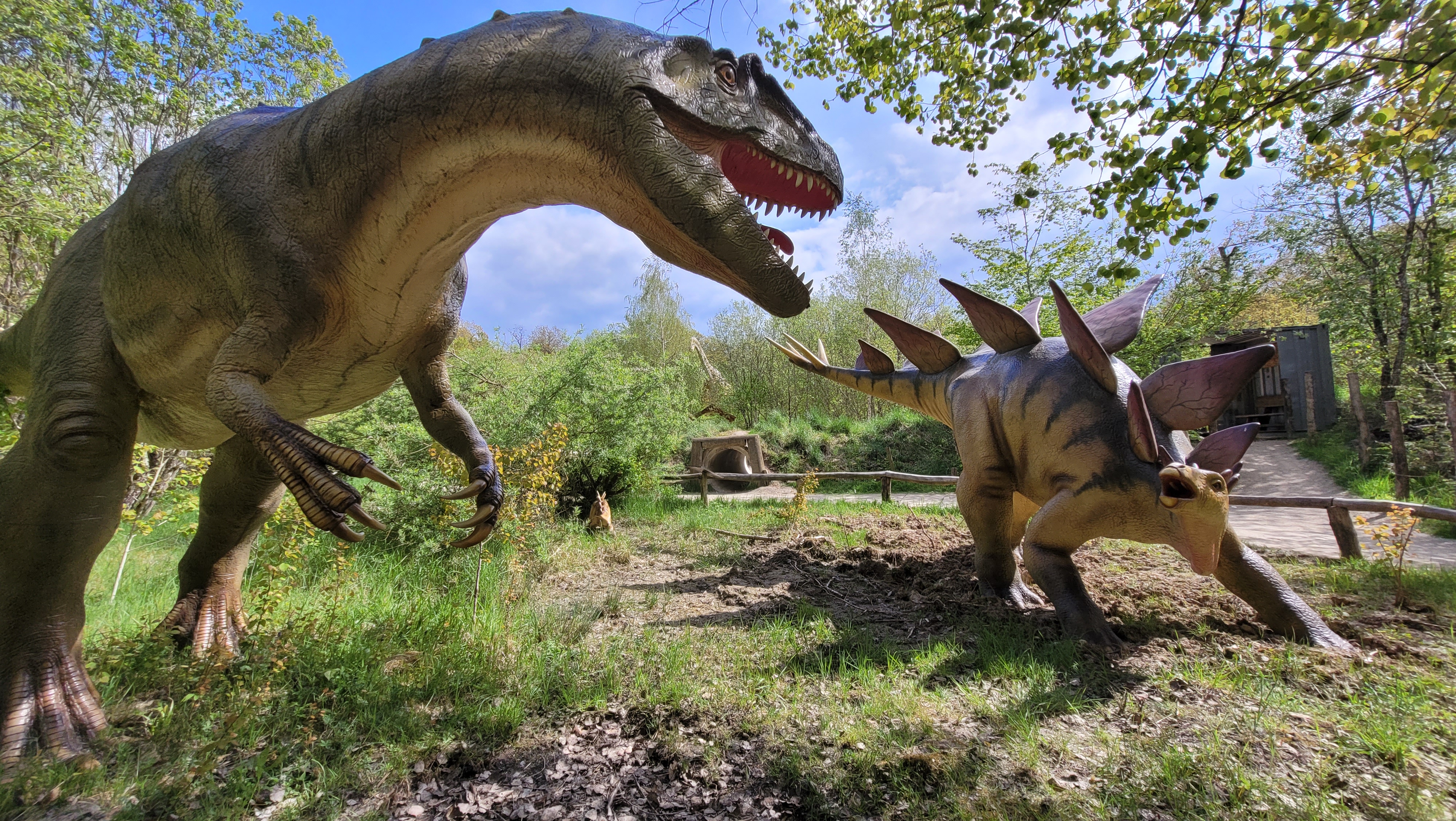 Im Dinosaurierpark Teufelsschlucht triffst du auf über 170 lebensgroße Modelle – vom ersten Landbewohner Ichthyostega bis zum Zukunftswesen Kletterkalmar. Die Expedition führt durch 620 Millionen Jahre Erdgeschichte: Vom Devon bis in eine mögliche Zukunft, mit beeindruckenden Dinosauriern wie T. Rex, Stegosaurus und dem regionalen Eifelosaurus.