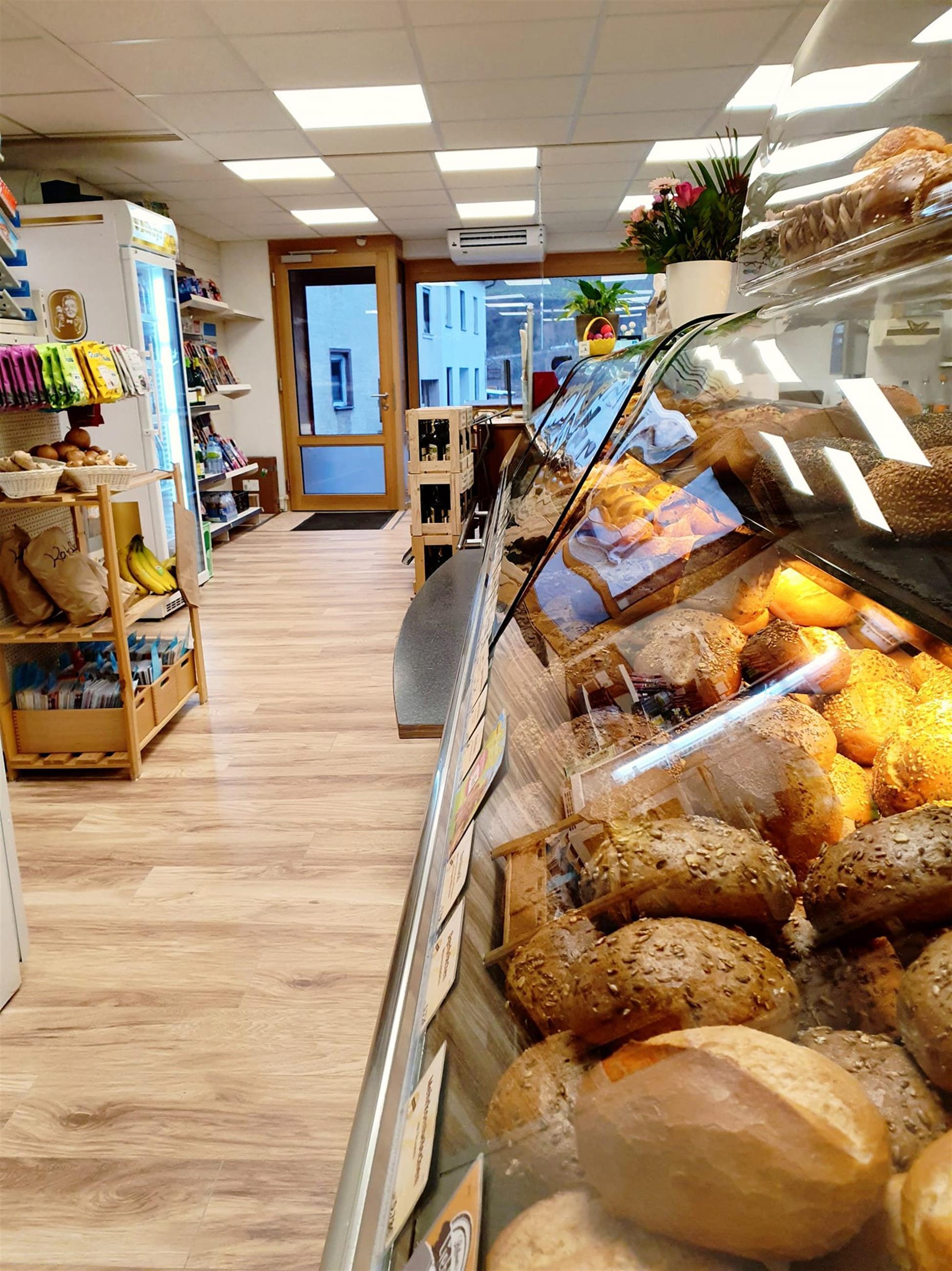 Kleiner Lebensmittelladen mit Backshop und Stehcafé.