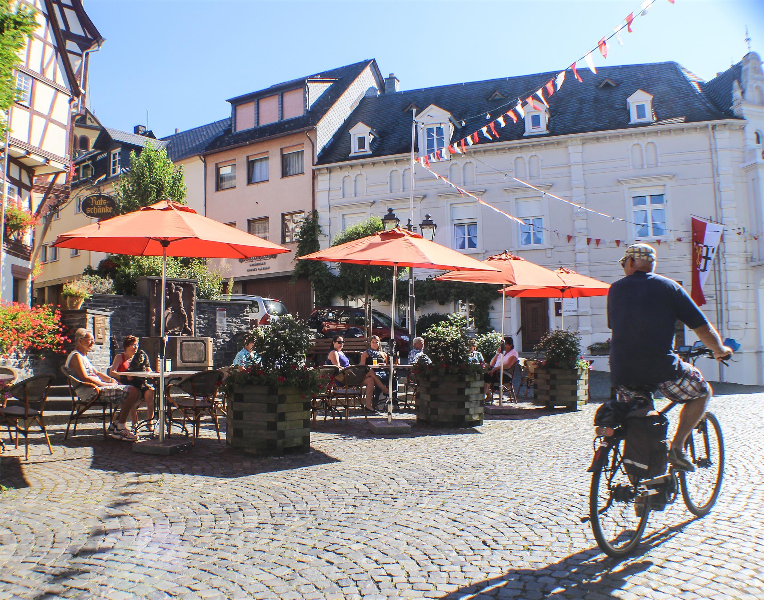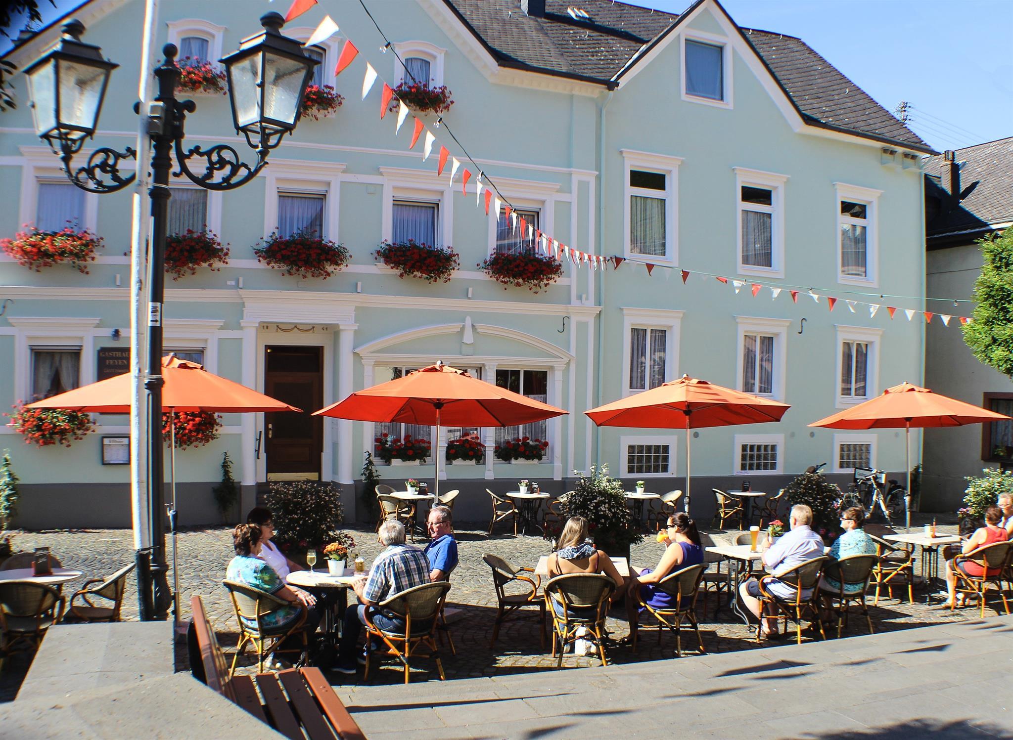 Genießen Sie Ihren Aufenthalt in unserem Haus in familiärer Atmosphäre. Unmittelbar am historischen Marktplatz von Zeltingen, wohnen Sie in gemütlich eingerichteten Gästezimmern. Ein reichhaltiges und abwechslungsreiches Frühstück erwatet Sie. Genießen Sie, bei gepflegten Getränken und Vesperkarte, die herrliche Atmosphäre des mittelalterlichen Marktplatzes oder unseres gemütlichen Lokals. Ausgezeichnet als Haus der besten Schoppen. Außenterrasse am historischen Marktplatz von Zeltingen.
