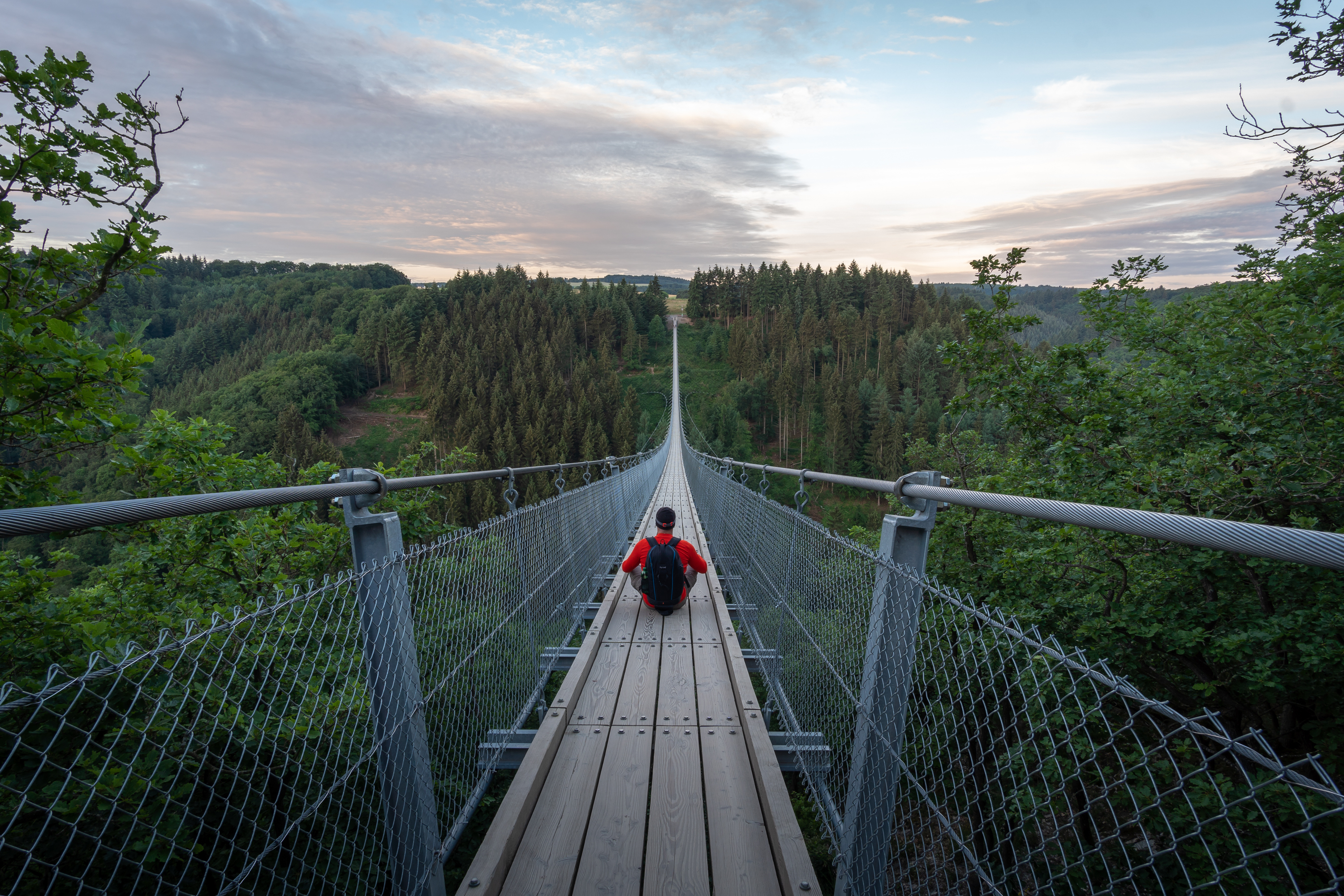 Mitten im Hunsrück zwischen Mörsdorf und Sosberg spannt sich die Geierlay – 360 Meter lang, 100 Meter hoch – als eine der schönsten Hängeseilbrücken Deutschlands über ein wildromantisches Tal. Ob bei klarer Sicht mit weitem Blick über die Hügel des Hunsrücks oder in mystischer Morgennebel-Stimmung: Die Geierlay garantiert unvergessliche Momente inmitten purer Natur.