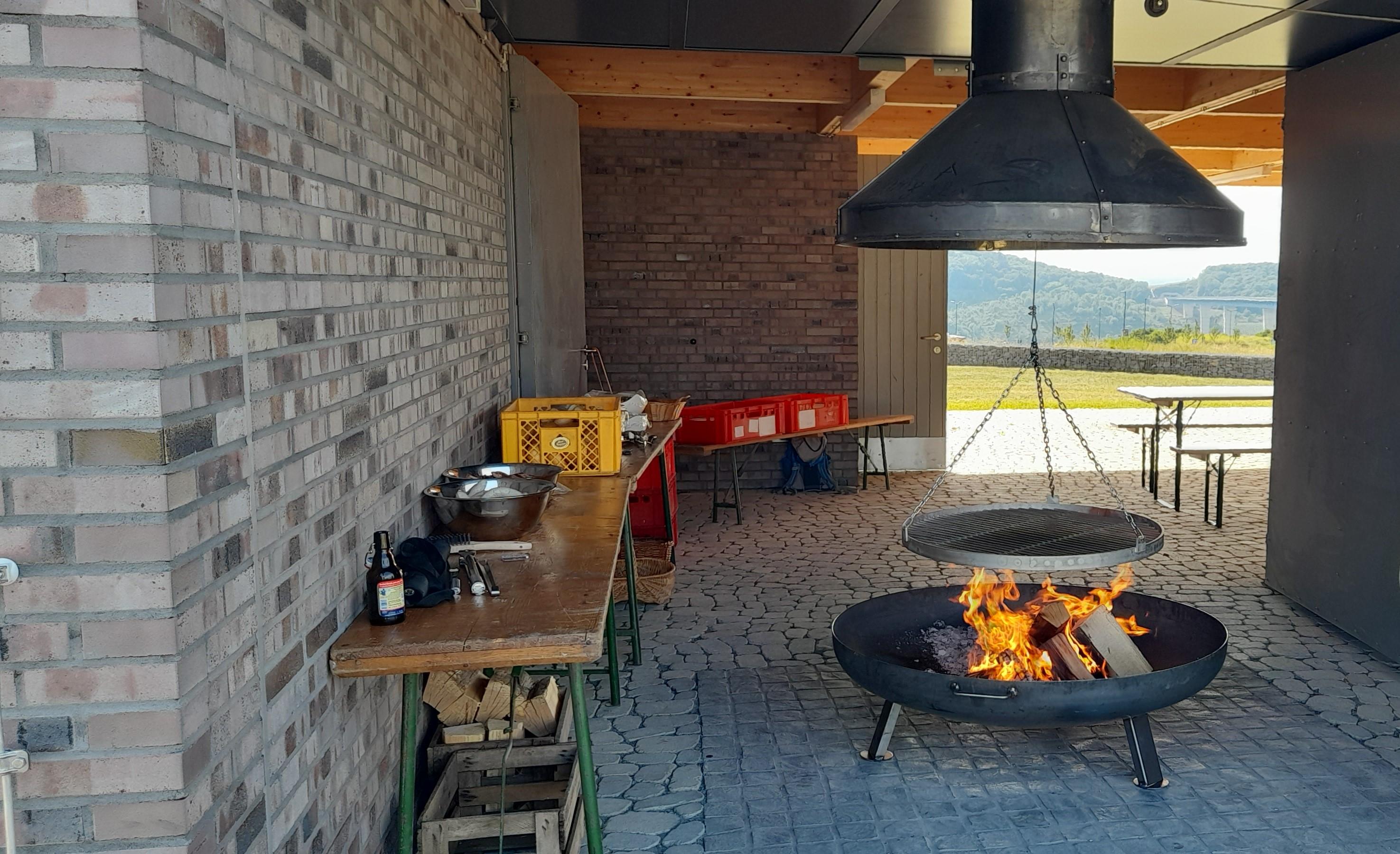 Grillhütte über den Parkplatz Moselblick mit Grillstelle, Spielplatz, Fußballplatz, Zeltfläche, Parkplätze und Toiletten. Grillstelle und Toiletten sind nur nutzbar, wenn die Hütte gemietet wird.