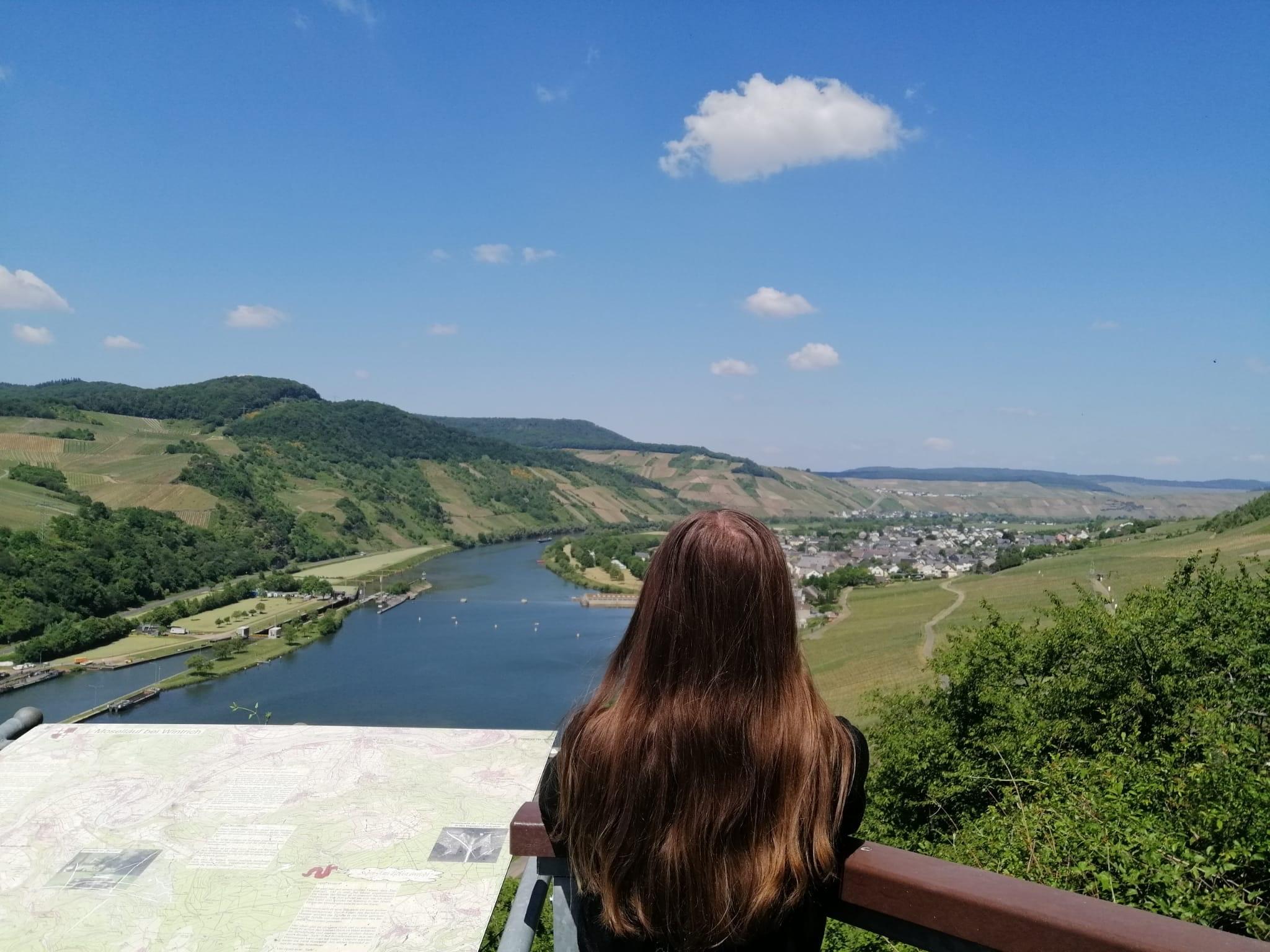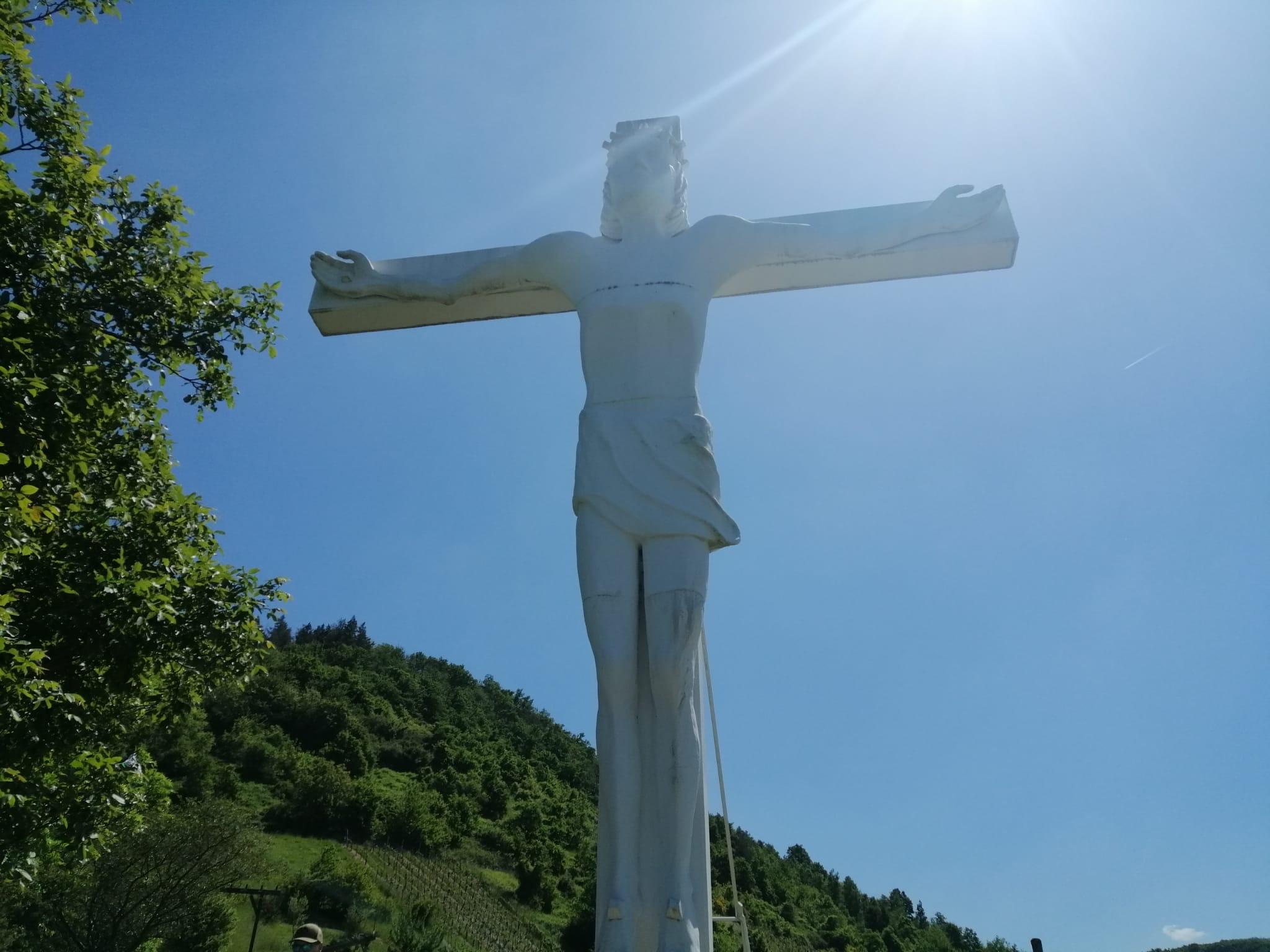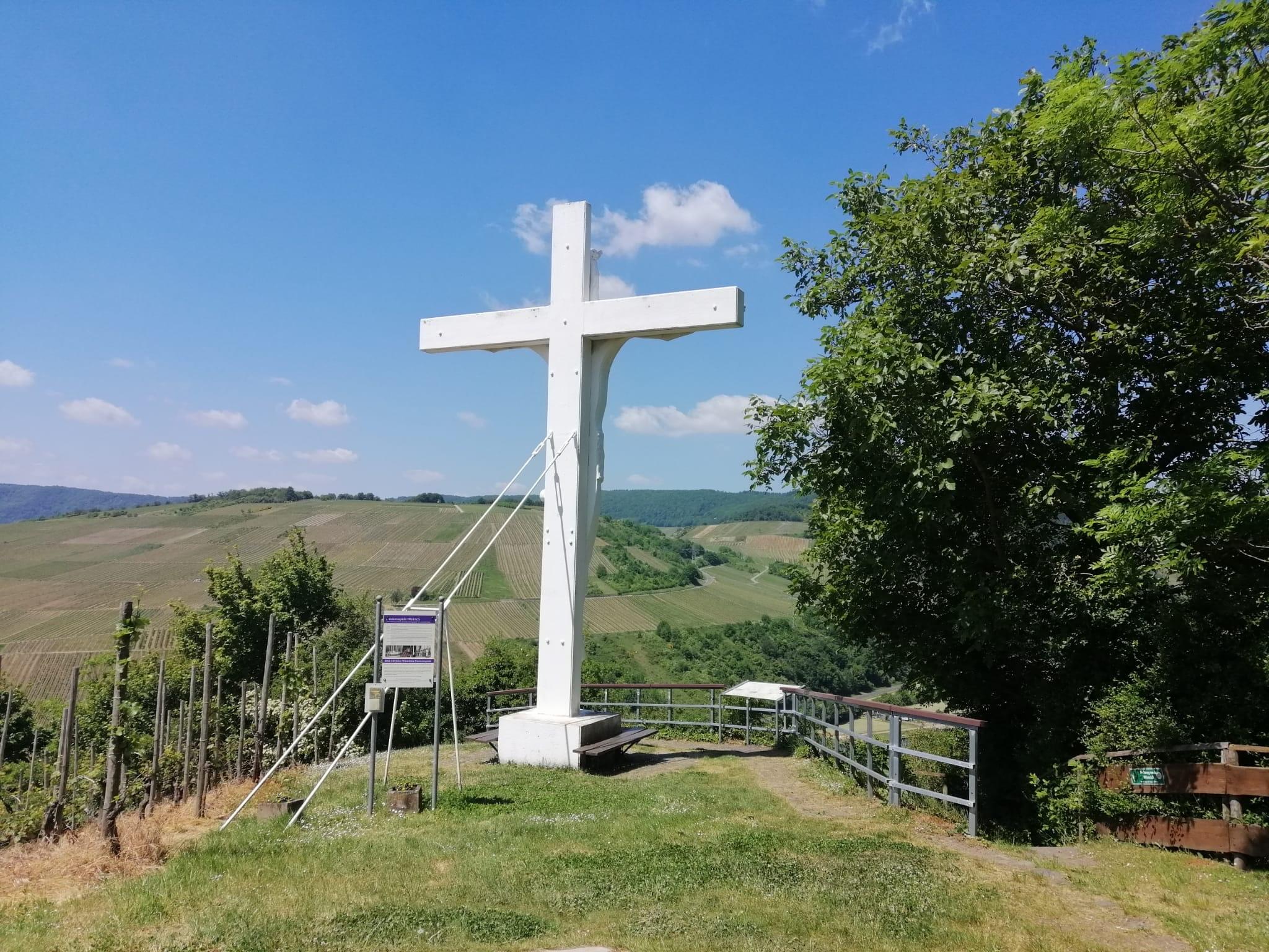 "Seit mehr als 50 Jahren steht der „Große Herrgott“ weithin sichtbar auf dem Geierskopf hoch über Wintrich. Das beliebte Wahrzeichen ist mit einer Höhe von 8,07 Metern und einer Breite von 5,25 Metern wohl eines der größten Kreuze in Rheinland-Pfalz. 1968 erhielt die Gemeinde Wintrich die mächtige steinerne Christusfigur als Geschenk. Die Statue wurde von der Künstlerin Lucy Hillebrand geschaffen und stand zunächst in einer Kirche in Wiesbaden, doch sie gefiel den Kirchenoberen nicht und wurde rasch in den Keller verbannt. Der Wintricher Josef Reinhard die in Einzelteile zerlegte Steinfigur. Er störte sich nicht an dem vermeintlich zu großen Kopf und dem schmalen Leib, sondern war begeistert und brachte den Christuskorpus nach Wintrich. Auf einem Betonkreuz steht er seither als Sinnbild „Großer Herrgott“ inmitten dieser Weinbergslage, die neben dem Ohligsberg die beste Wintrichs ist und dank des Schieferbodens besonders fruchtige und mineralisch geprägte Weine beschert. Ihren Namen hat die Weinlage „Wintricher Großer Herrgott“ übrigens nicht von der Statue. Früher befand sich oberhalb von Wintrich eine kleine Kapelle mit Kruzifix. Immer wenn sich die Leute dorthin begaben, gingen sie redensartlich „zum großen Herrgott“. Aus dieser Wendung entstand 1830 eine Katasterlage, doch erst 100 Jahre später trug auch der Wein offiziell den Namen „Wintricher Großer Herrgott“. Als Aussichtspunkt bietet der ""Große Herrgott"" einen einmaligen Blick über Wintrich, die Staustufe und das Moseltal. Ein idealer Rastplatz für Wanderer, die auf dem Weinlehrpfad, Glasweg, Flaschenweg, Herrgotts‘ Wanderweg oder 5-Täler-Weg unterwegs sind. Im angrenzenden ""Königinnenweinberg"" pflanzt jede Wintricher Weinkönigin anlässlich der „Wintricher Weinblütenwanderung“ eine der Weinrebe. Wer mag kann einen kleinen Abstecher zu den etwas oberhalb gelegenen Bildstöcke „Sieben Schmerzen Marias“ machen."