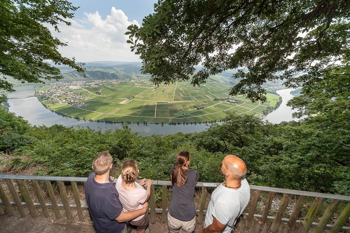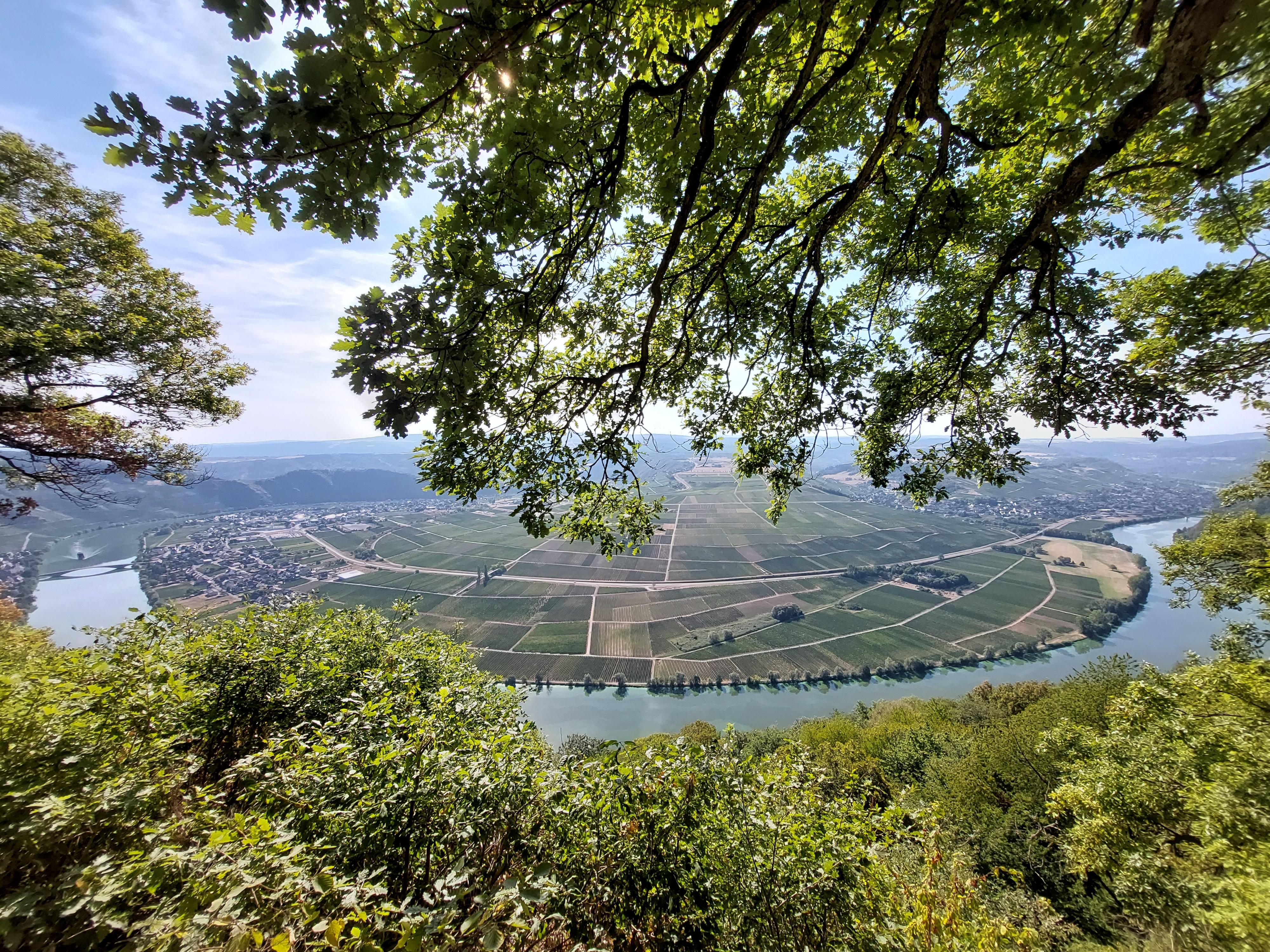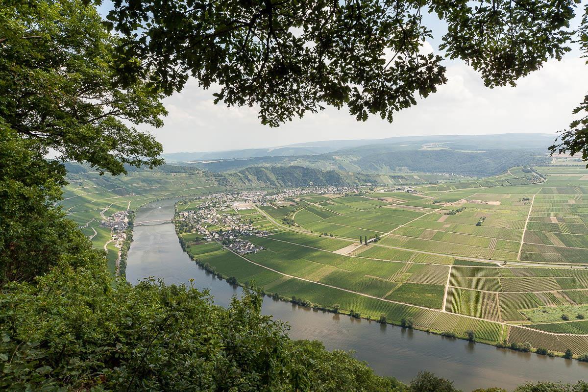 Besonders gut zu sehen sind die geologischen Charakteristika der Moselschleifen: der Gleithang mit flachen Rebengärten - vom Hunsrück sanft zum Moselufer abfallend, der Prallhang mit steilen Wingerten - besonders anschaulich am linken Moselufer von Piesport.