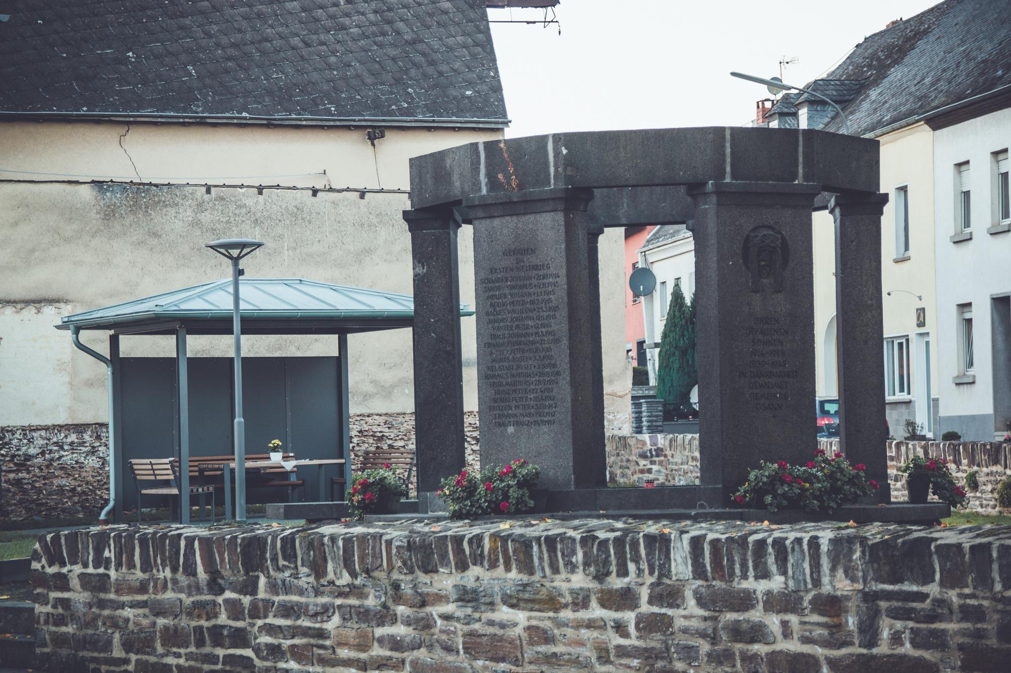 Die Inschriften des Denkmals erinnern an die Gefallenen und Opfer beider Weltkriege aus dem Ort. Im Zuge der Dorferneuerung wurde der Bereich um das Ehrenmal im Jahr 2015 neu gestaltet. Hinter dem Denkmal entstand eine erweiterte Aufenthaltsfläche mit Grünbereich und Sitzgelegenheiten als ruhiger Rückzugsort im Ortskern. Ergänzt wird dieser Treffpunkt durch einen offenen Pavillon. Den oberen Abschluss des Platzes bildet eine imposante Linde, die als Naturdenkmal geschützt ist.