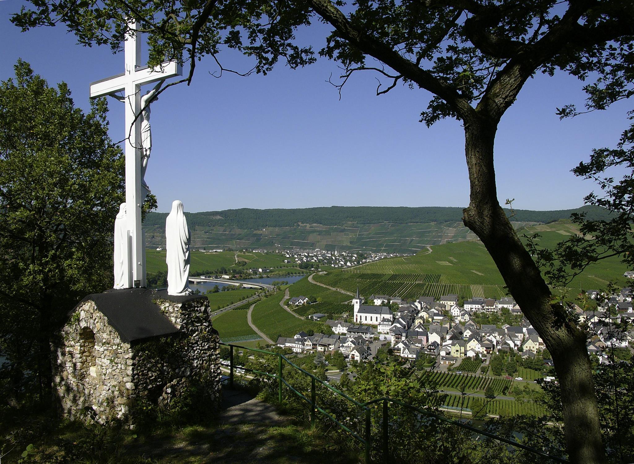 Vom Kreuz bietet sich ein herrliches Panorama auf die Minheimer Moselschleife. Die gedachte Achse, die der Minheimer Kirchturm mit den Kirchtürmen von Piesport bildet, wird "Drei-Kirchturm-Blick" genannt.
