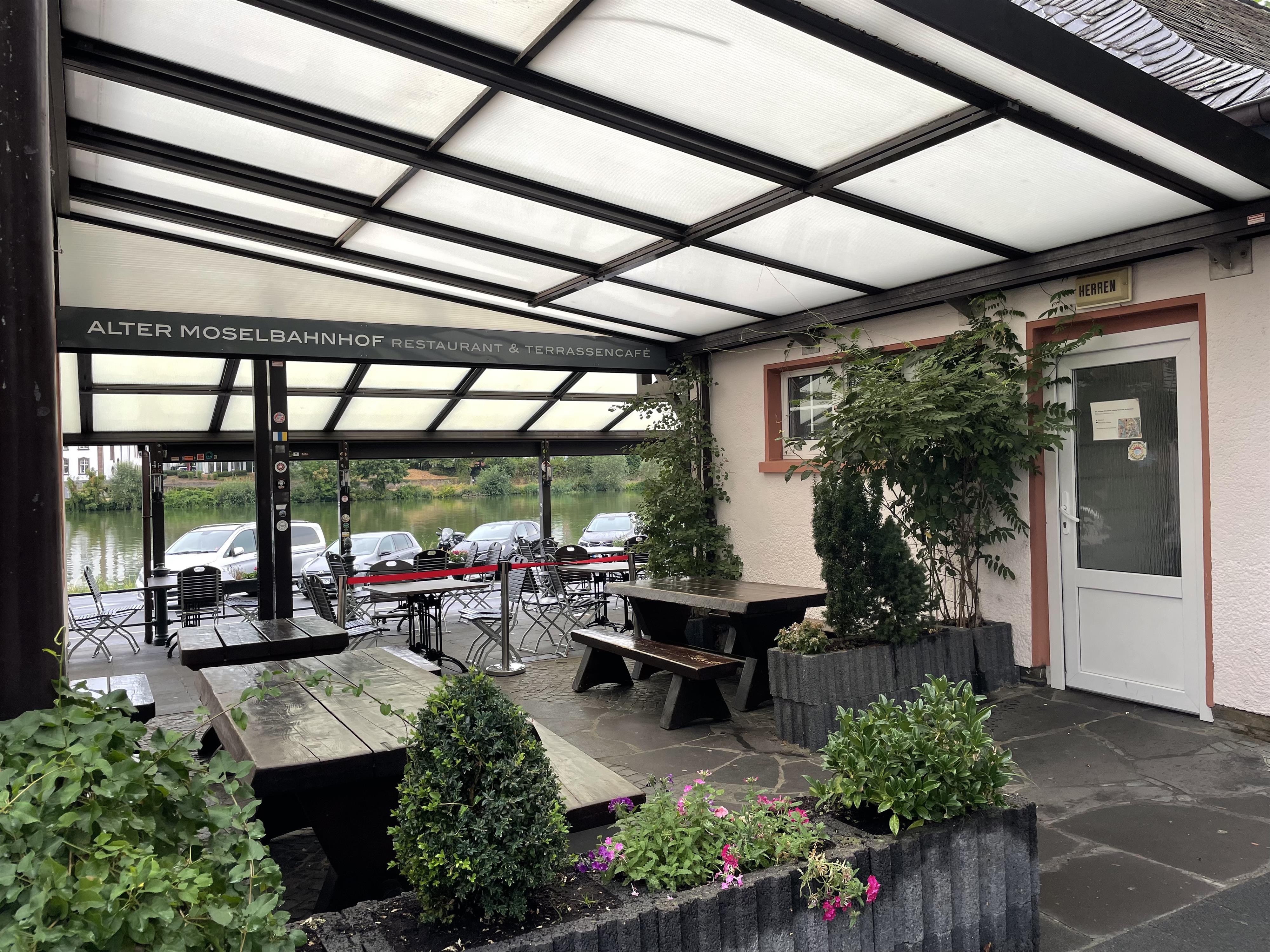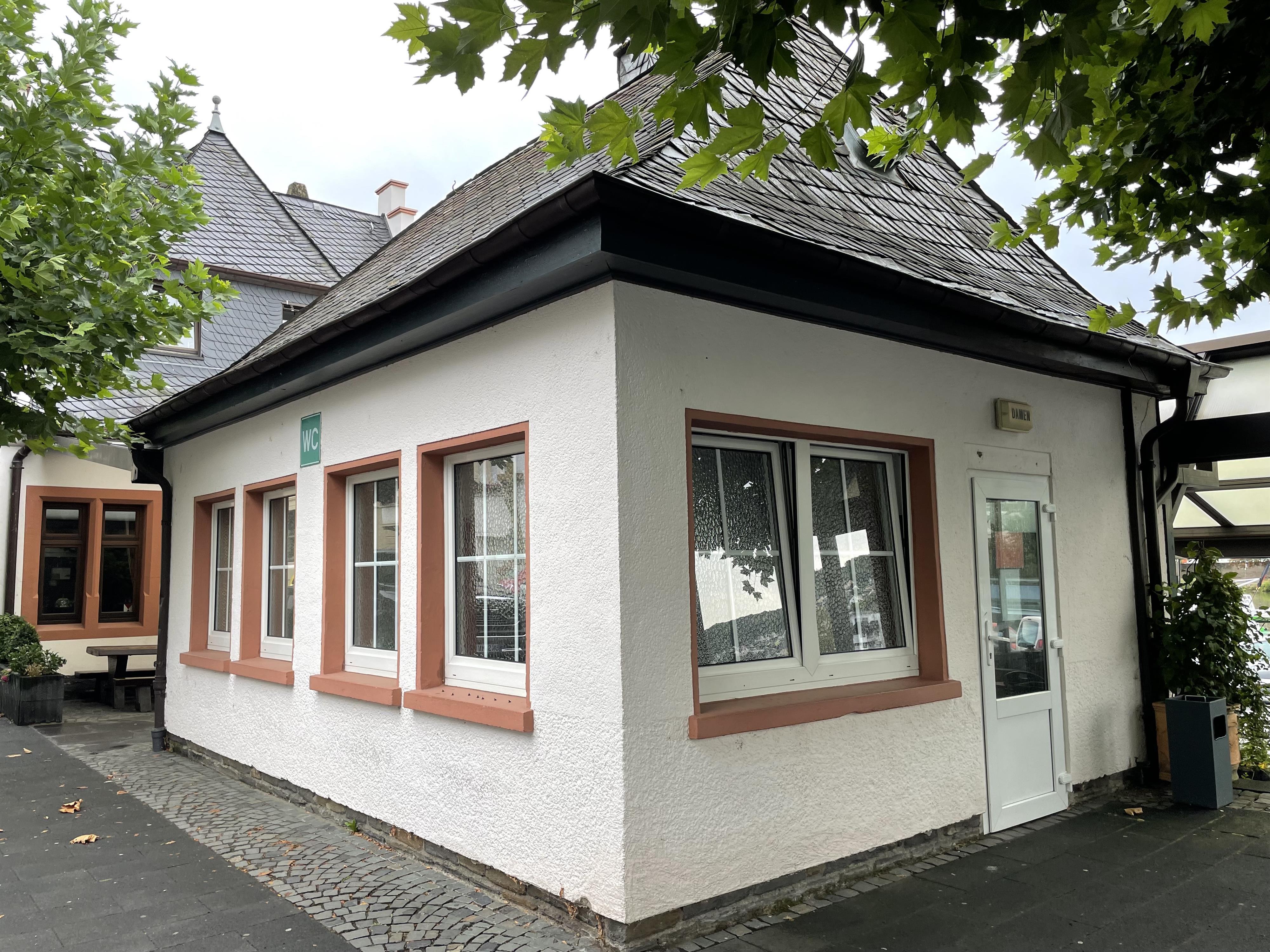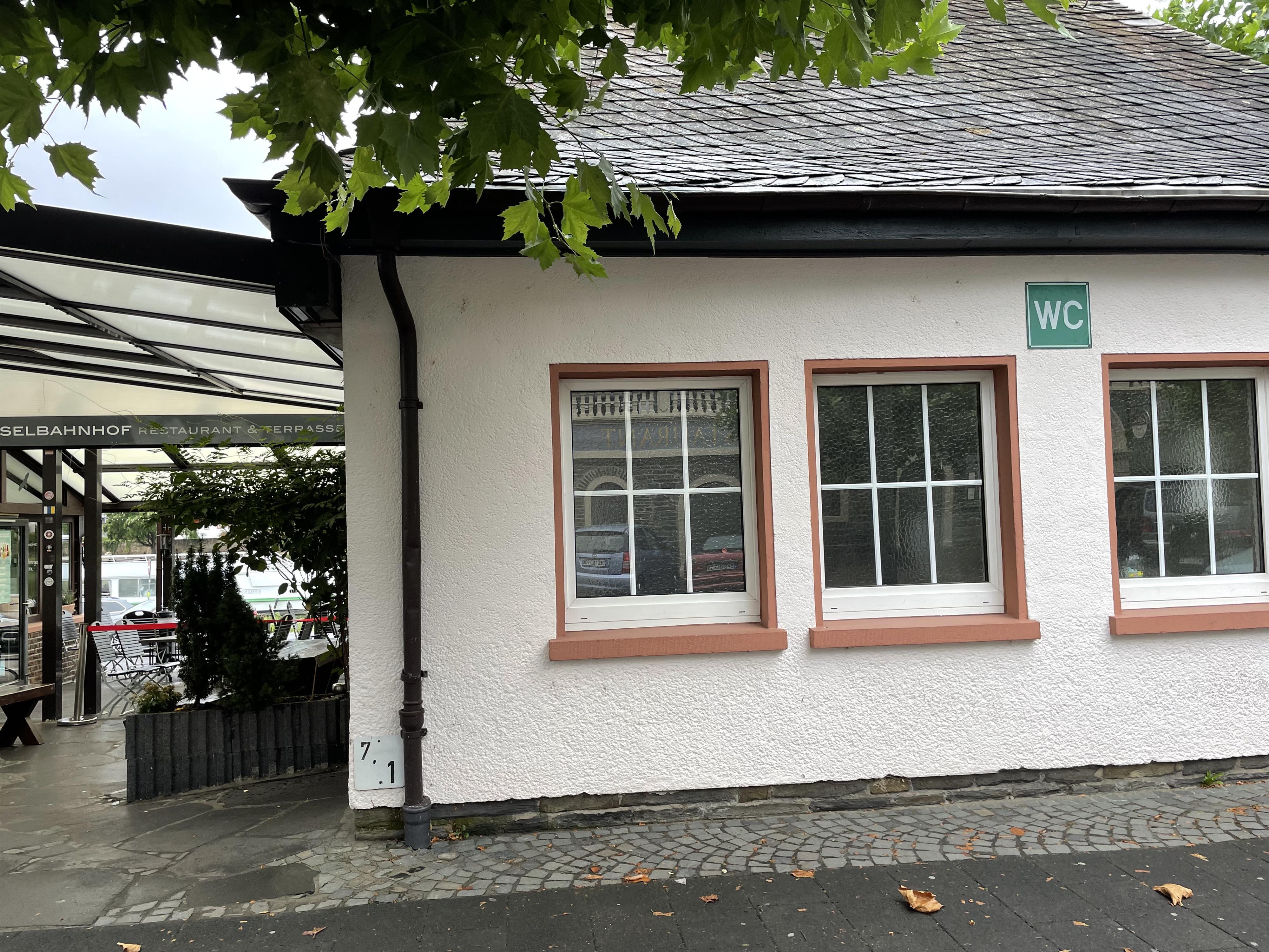 Die öffentliche Toilette befindet sich neben der Gaststätte "Alter Bahnhof" am Moselufer in Bernkastel, direkt am Parkplatz.