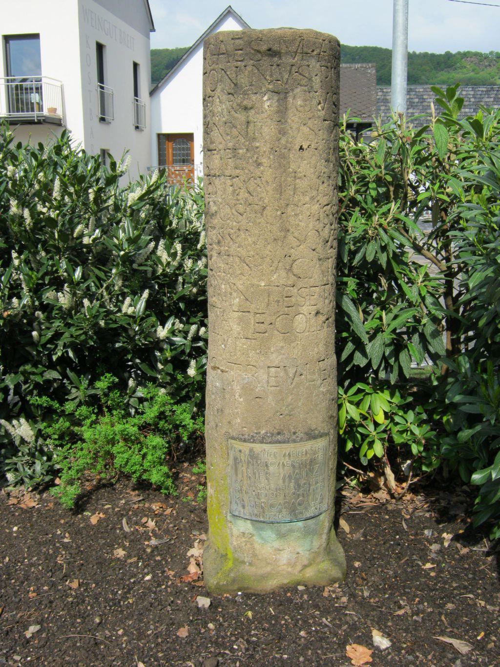 Der Kaiser Marcus Aurelius Antonius, der Fromme, Glückliche und Erhabene, der mächtige Besieger der Parther und Britanier, Oberpriester, Volkstribun zum 2. mal, Konsul zum 3. Mal, tapferer und großer Fürst, Befrieder des Erdkreises hat die vom Alter zerstörten Brücken und Straßen wieder hergestellt, von Trier 18 Leugen Vor sich sehen Sie eine Replik - das Original ist im Rheinischen Landesmuseum Trier zu sehen.