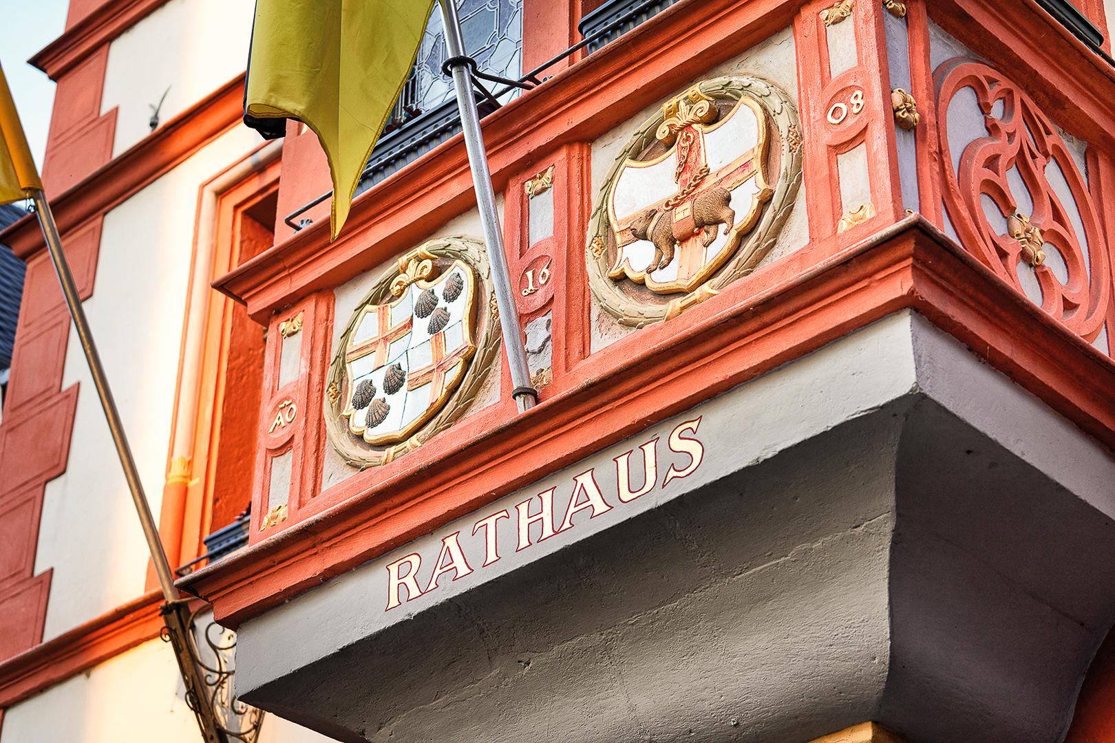 Die Fassade des Rathauses gilt als prächtiges Beispiel der deutschen Spätrenaissance. Besonders auffällig ist das Wappen des Erzbischofs Lothar von Metternich, der als Gönner und Förderer des Baumeisters Hoffmann gilt, dem das Werk vermutlich zugeschrieben wird. Das Wappen zeigt die charakteristischen drei Muschelschalen und das kurtrierische Kreuz und befindet sich gemeinsam mit dem Bernkasteler Stadtwappen am reich verzierten Rathauserker auf der Außenseite. Dieser Erker, der in seiner Form einer kunstvollen Renaissance-Monstranz ähnelt, ruht auf einer einzelnen Basaltsäule, die vor dem zentralen Stützpfeiler des Erdgeschosses steht.