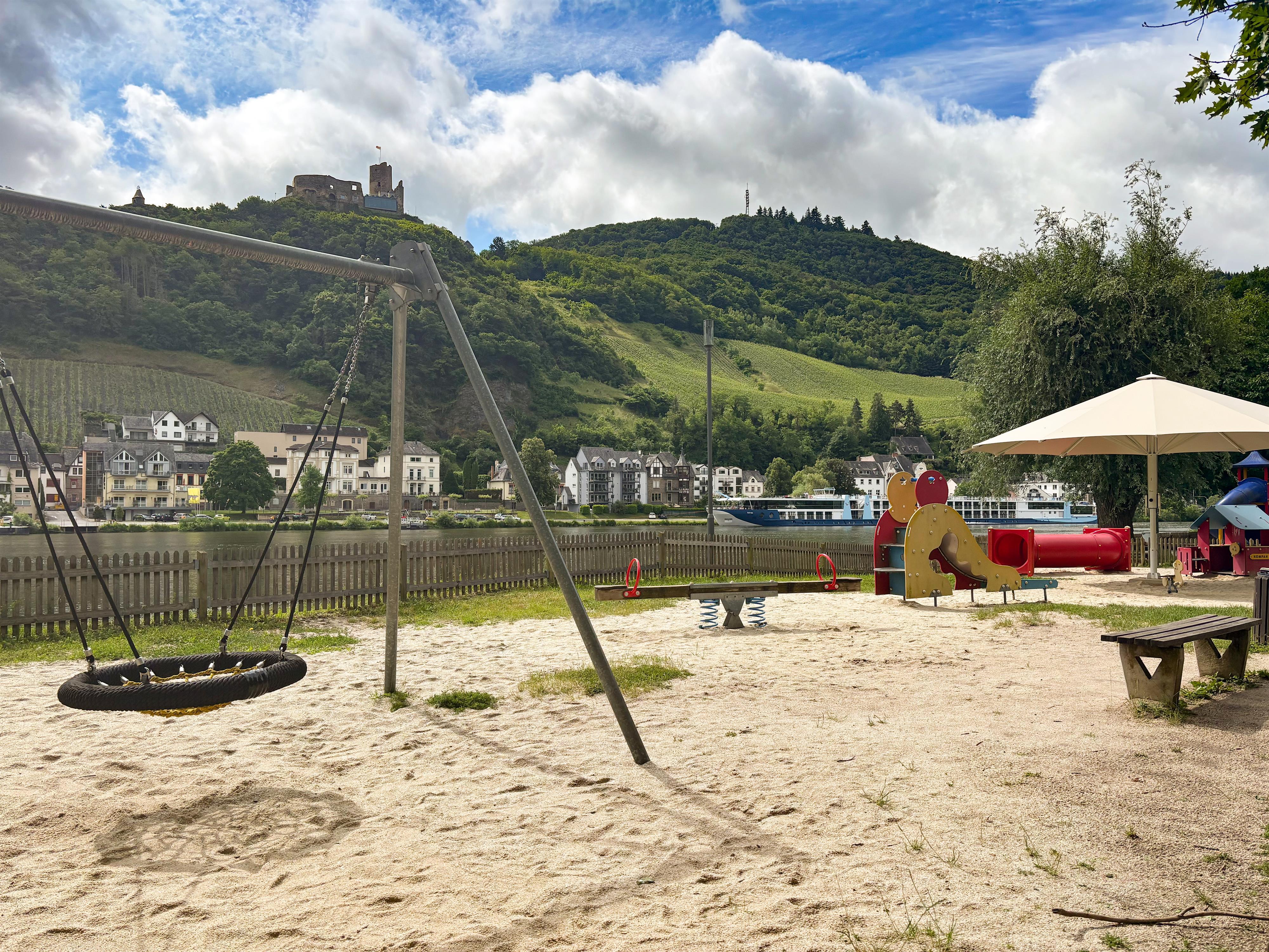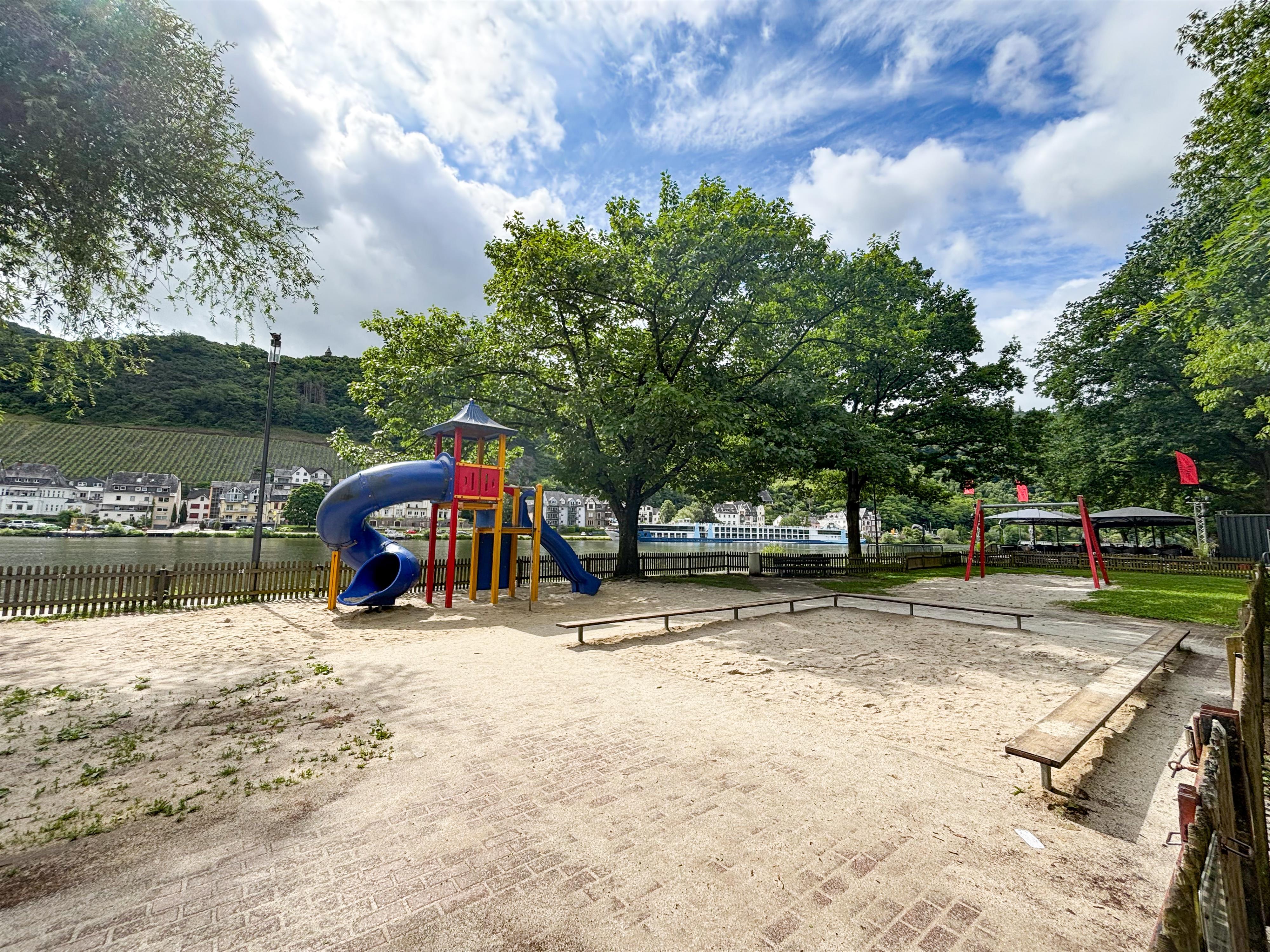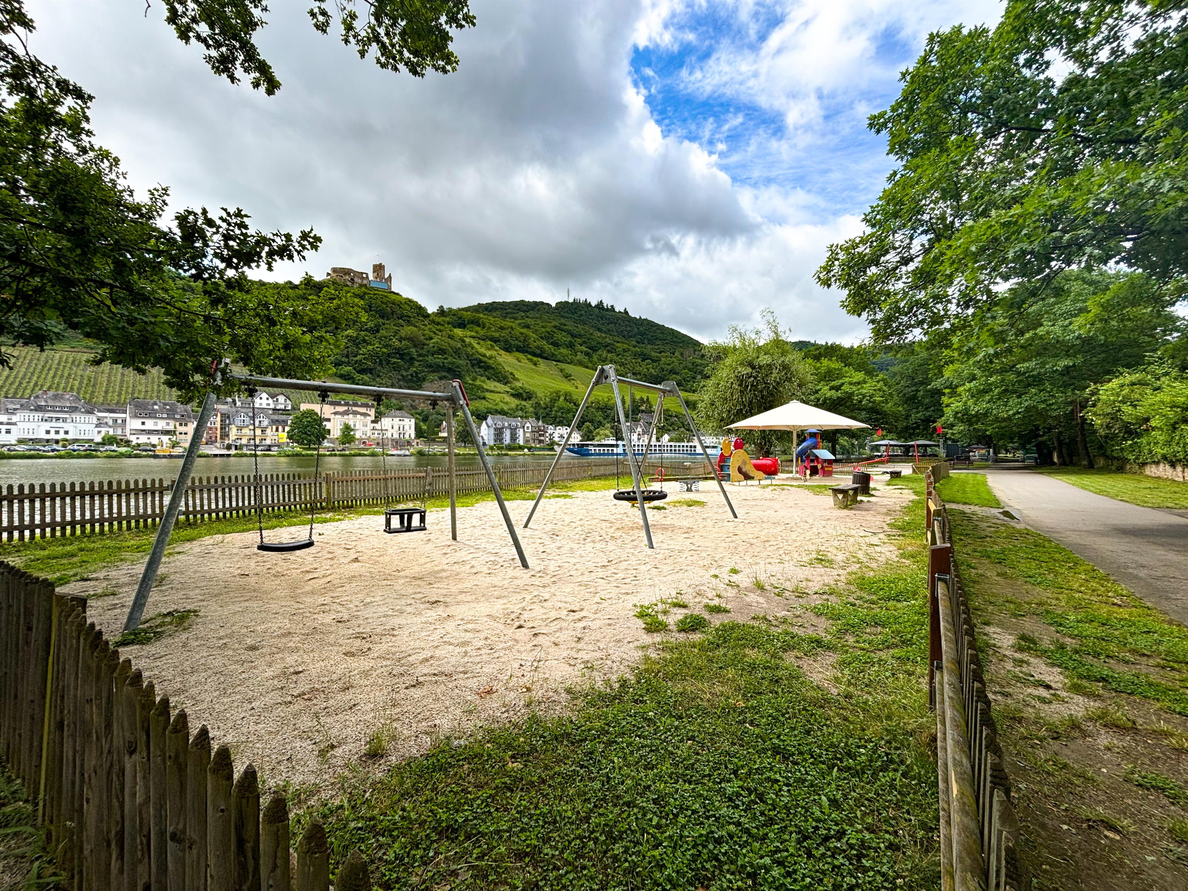 Die Kinder können spielen und die Eltern auf den Bänken sitzen und den schönen Blick auf die Mosel, den Stadtteil Bernkastel und besonders die über allem thronende Burg Landshut genießen.