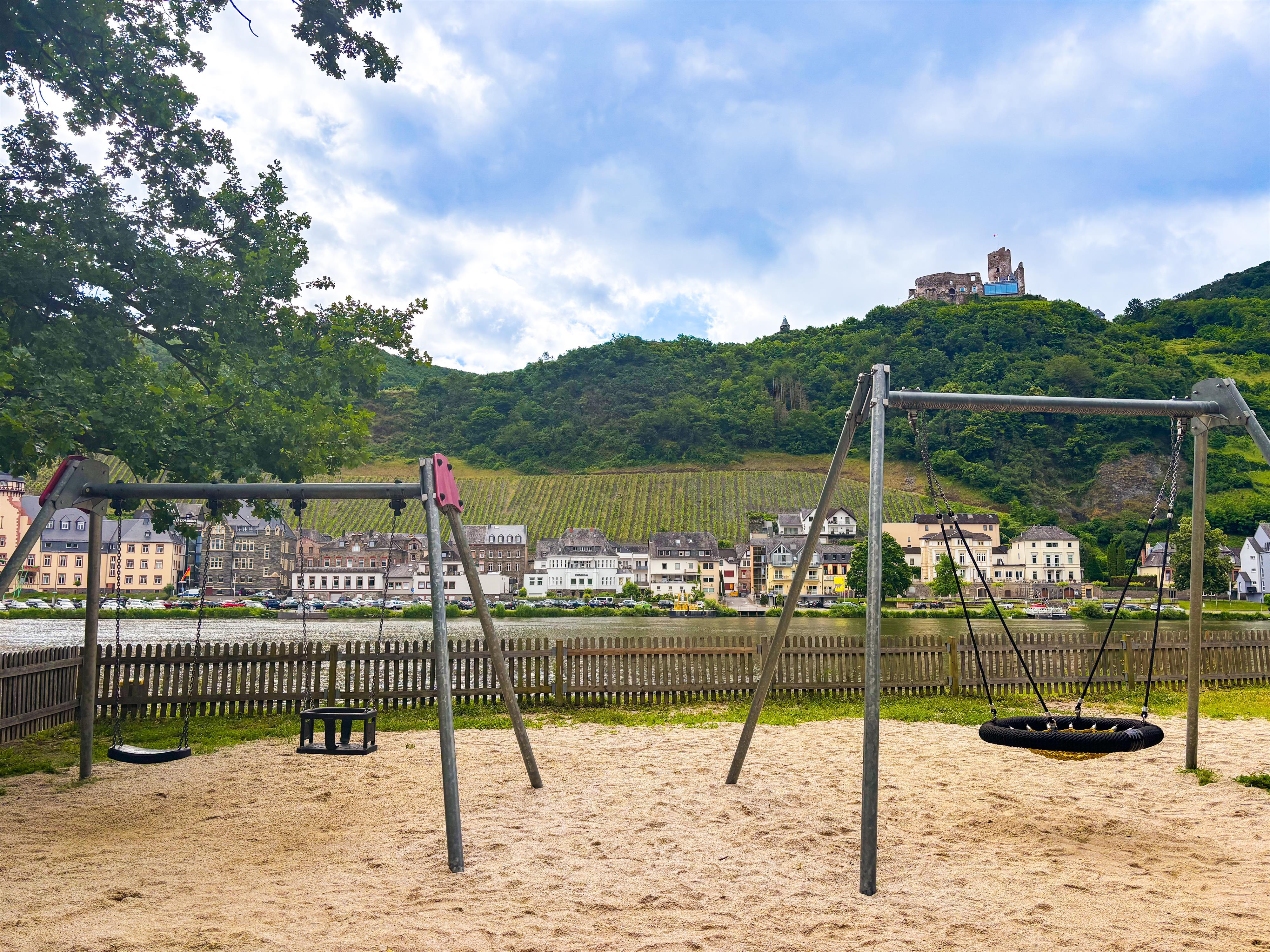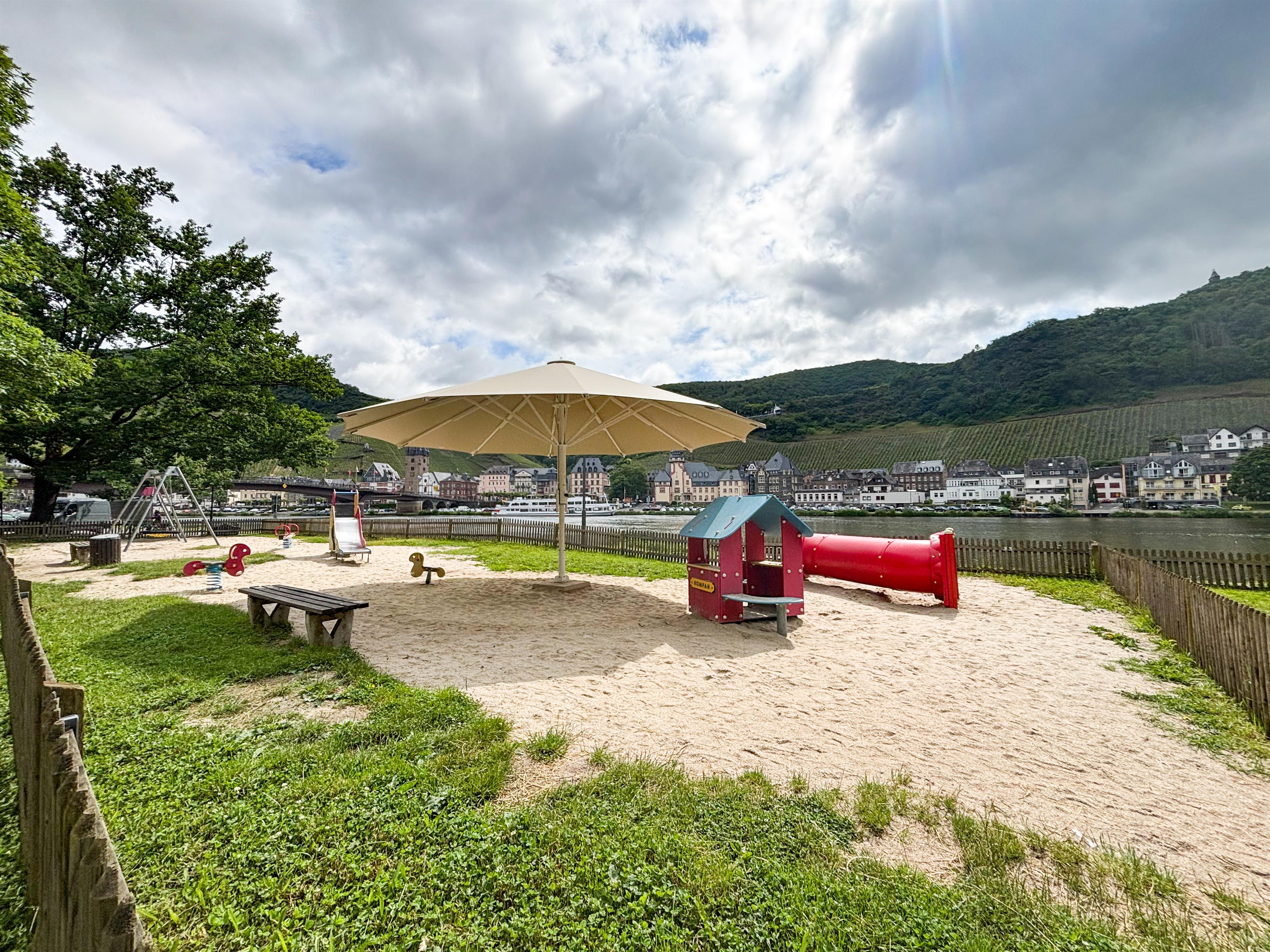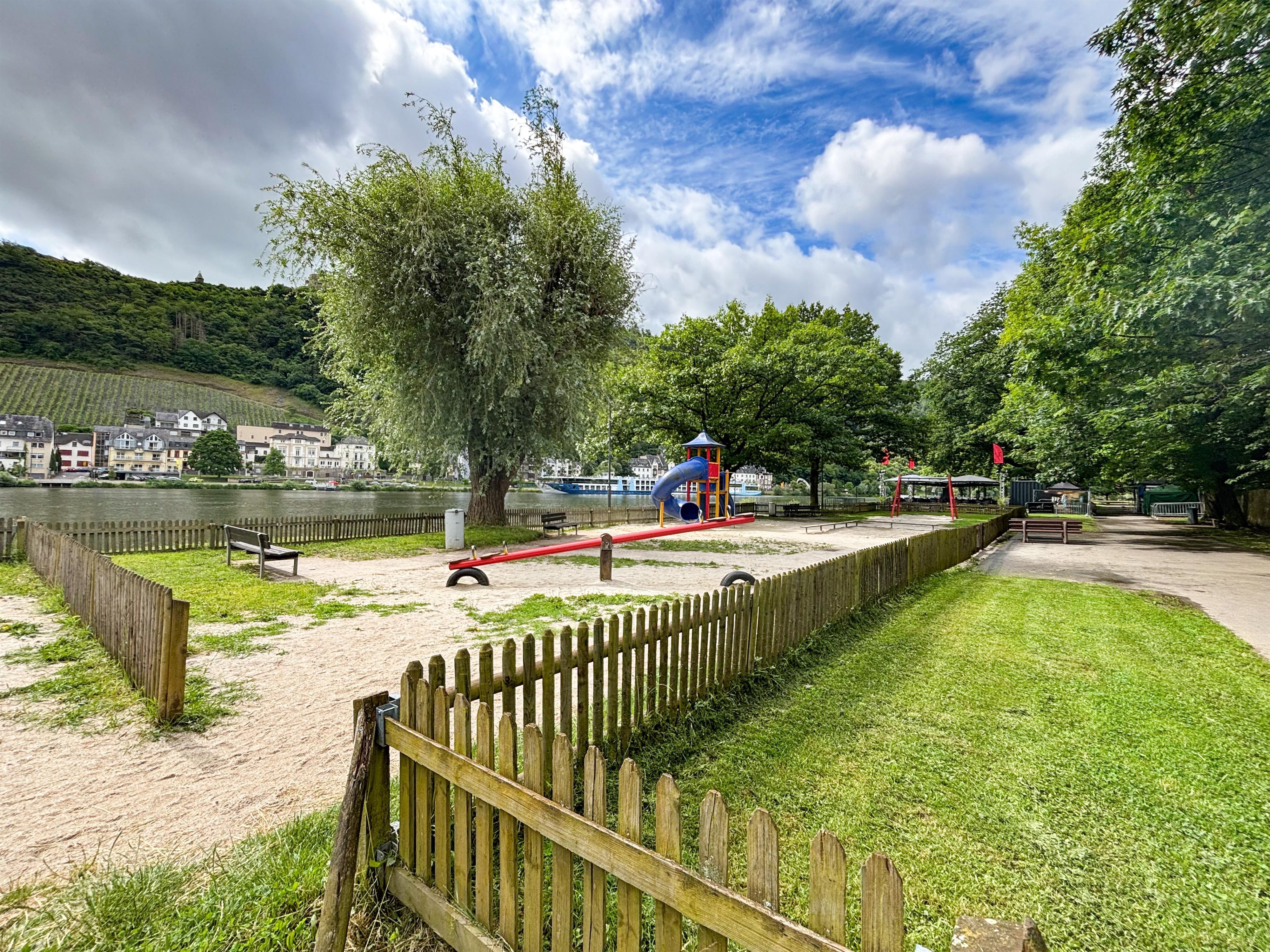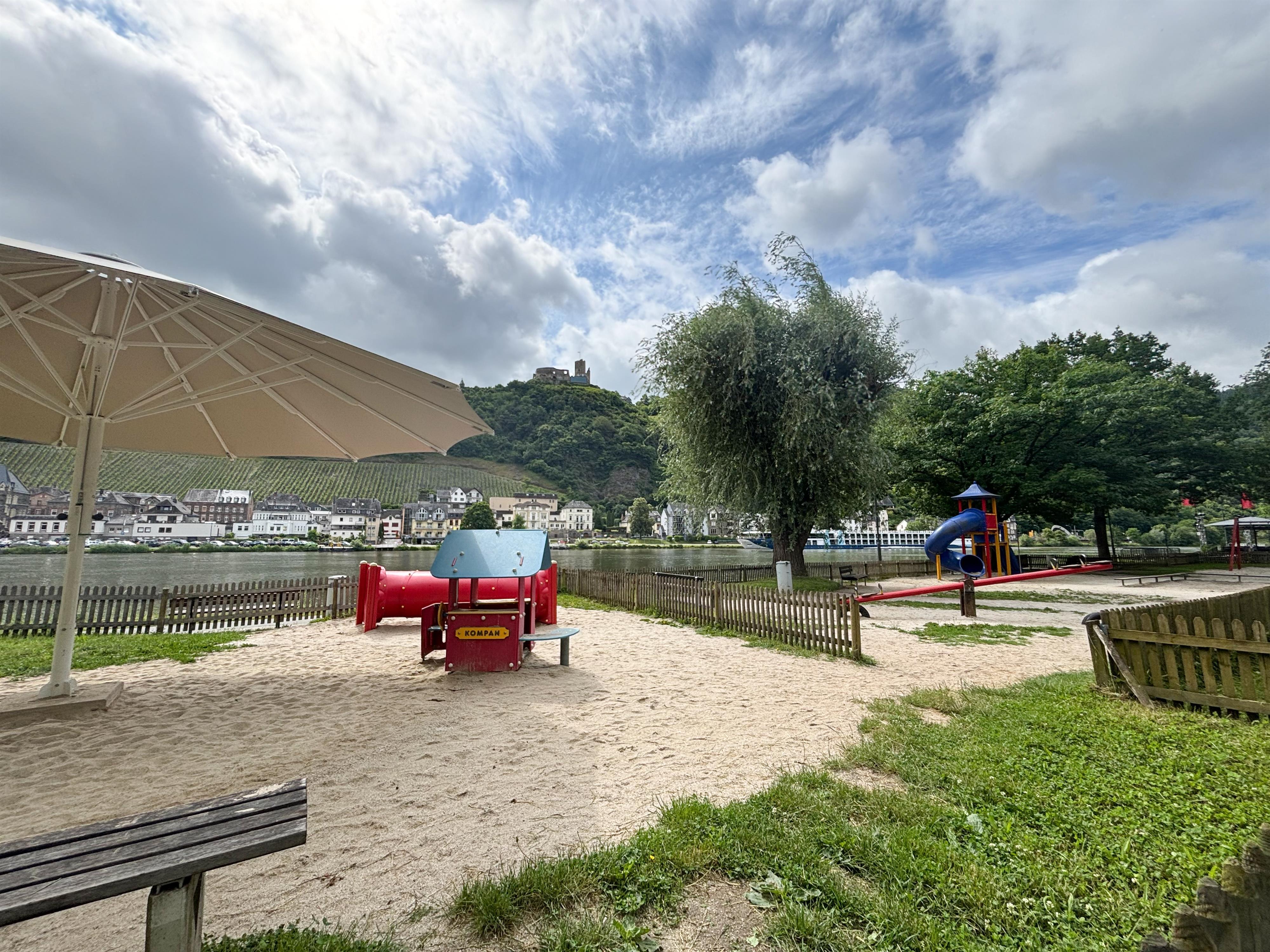 Die Kinder können spielen und die Eltern auf den Bänken sitzen und den schönen Blick auf die Mosel, den Stadtteil Bernkastel und besonders die über allem thronende Burg Landshut genießen.