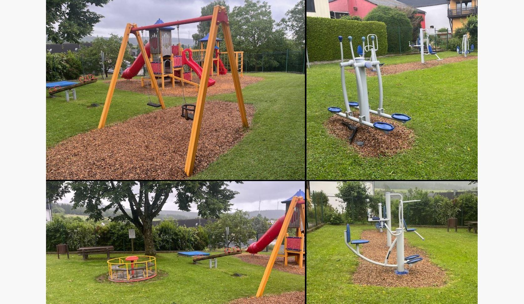 Der schöne Spielplatz bietet den Kindern viele Spieleräte: eine Schaukel, eine Wippe, ein Karussell, ein Sandkasten und ein großes Klettergerüst mit Rutschen.