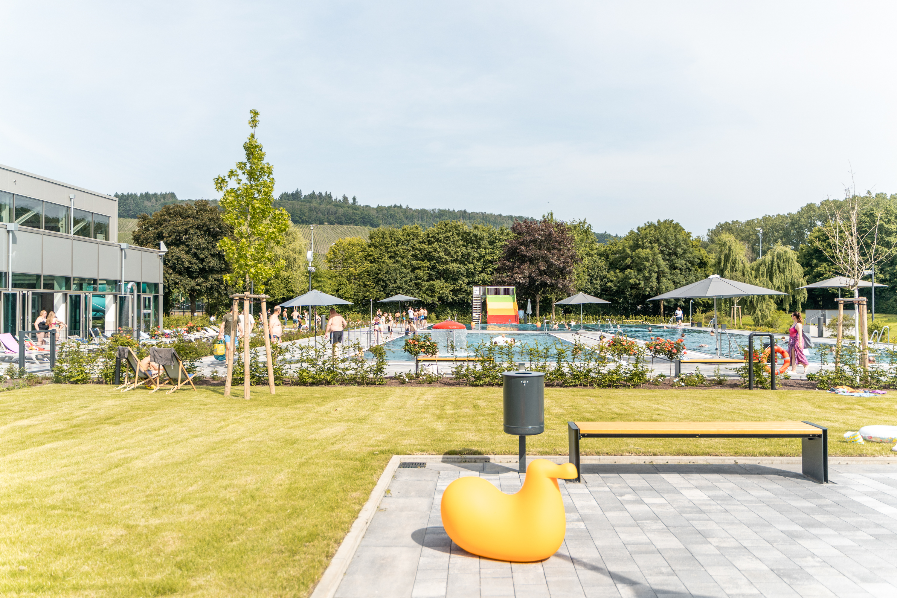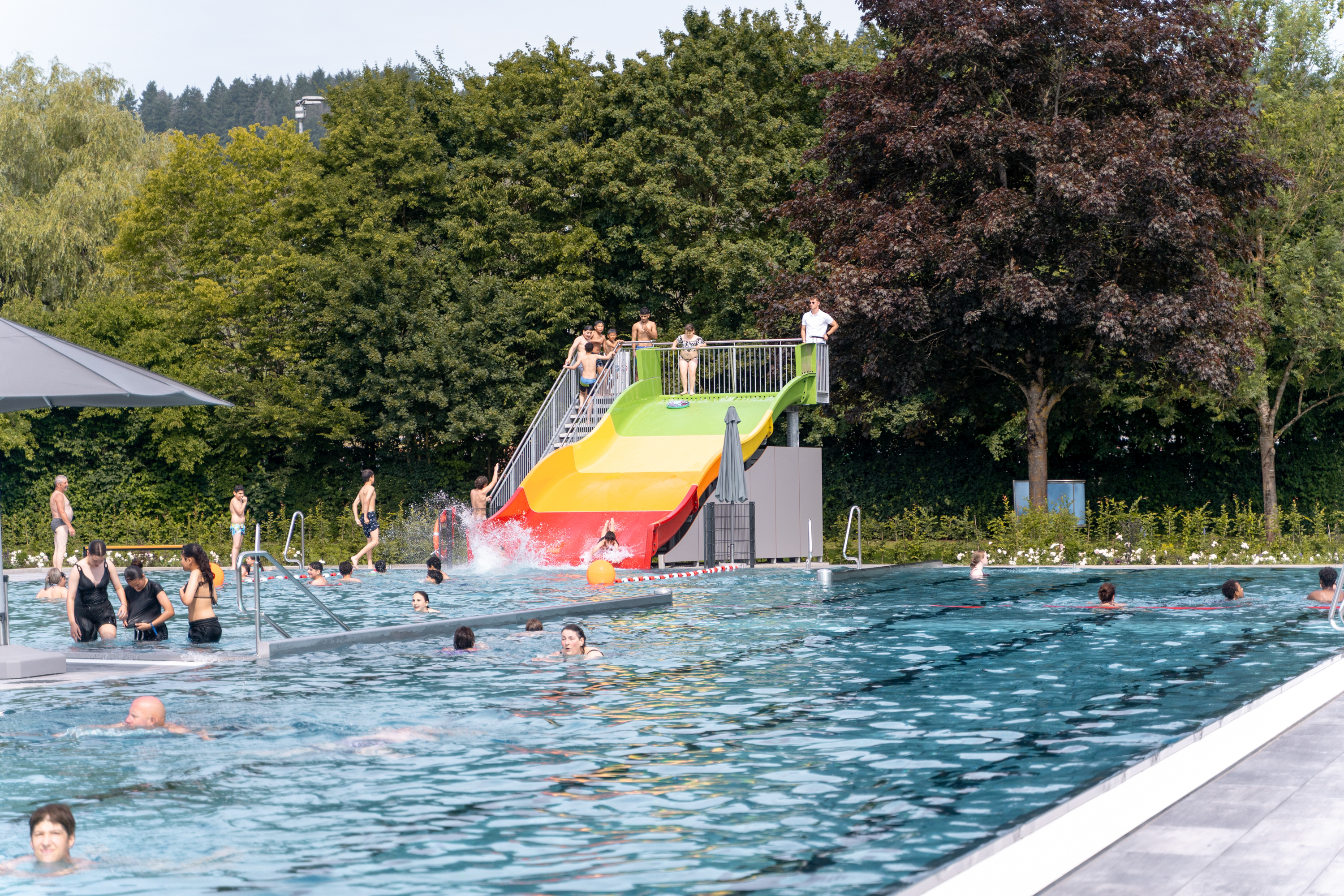 Im Sommer lockt der Freibadbereich mit Aktivbecken, Planschbereich, großer Liegewiese und Beachvolleyballfeld. Ein Kiosk versorgt die Badegäste mit Snacks und Erfrischungen.