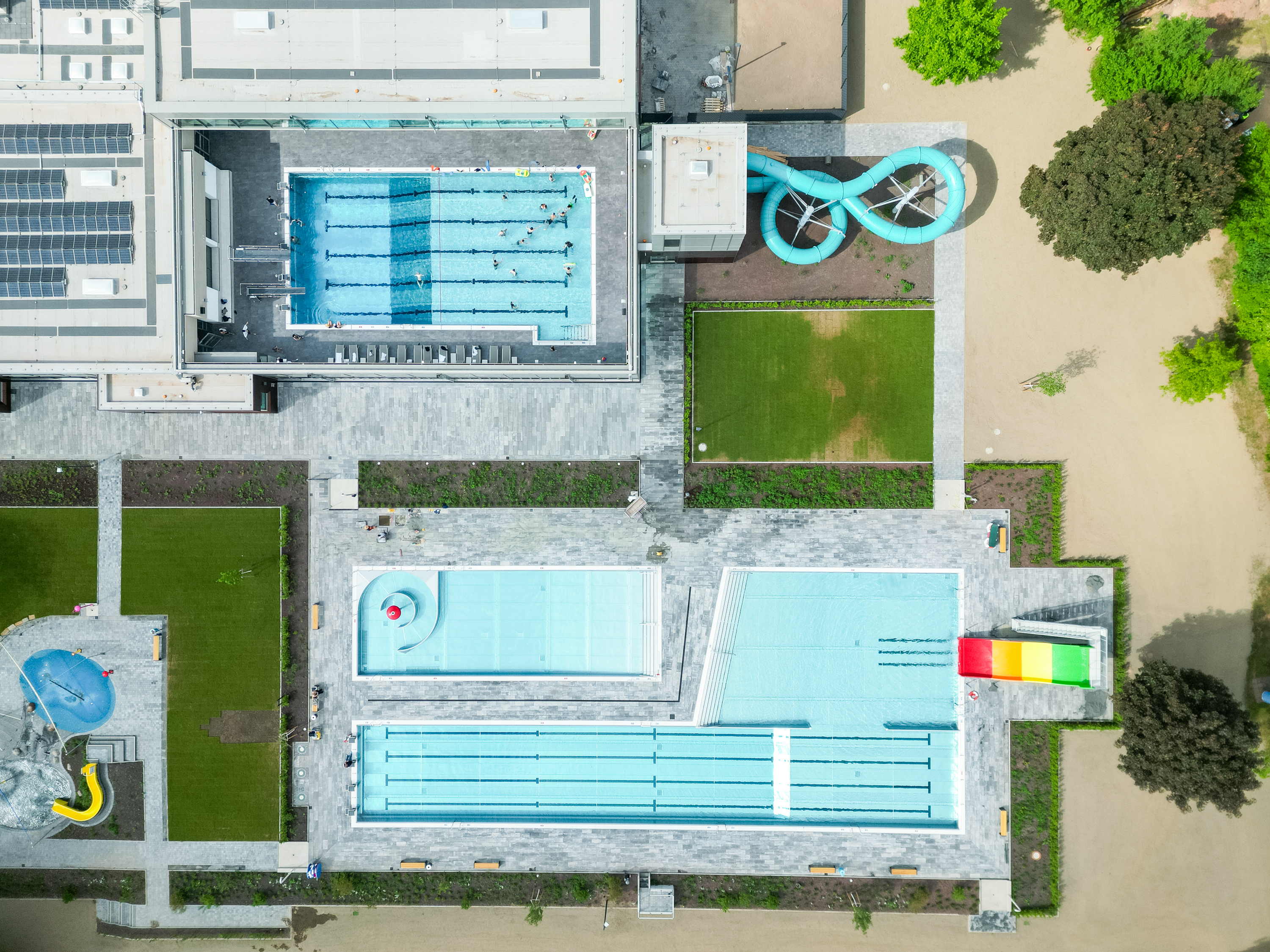 Im Innenbereich steht ein großes Schwimmerbecken mit fünf 25-Meter-Bahnen, Startblöcken sowie einem 1- und 3-Meter-Sprungturm zur Verfügung. Ein besonderes Highlight ist das Cabriodach, das bei schönem Wetter geöffnet werden kann und damit Freibadflair ins Hallenbad bringt. Ergänzt wird das Angebot durch ein Kursbecken mit Hubboden, das sich ideal für Aquafitness und Schwimmkurse eignet. Für die Kleinsten gibt es ein liebevoll gestaltetes Kleinkinderbecken mit Rutsche, Wasserpilz und weiteren Spielgeräten. Actionfans kommen auf der 60 Meter langen Riesenrutsche auf ihre Kosten.