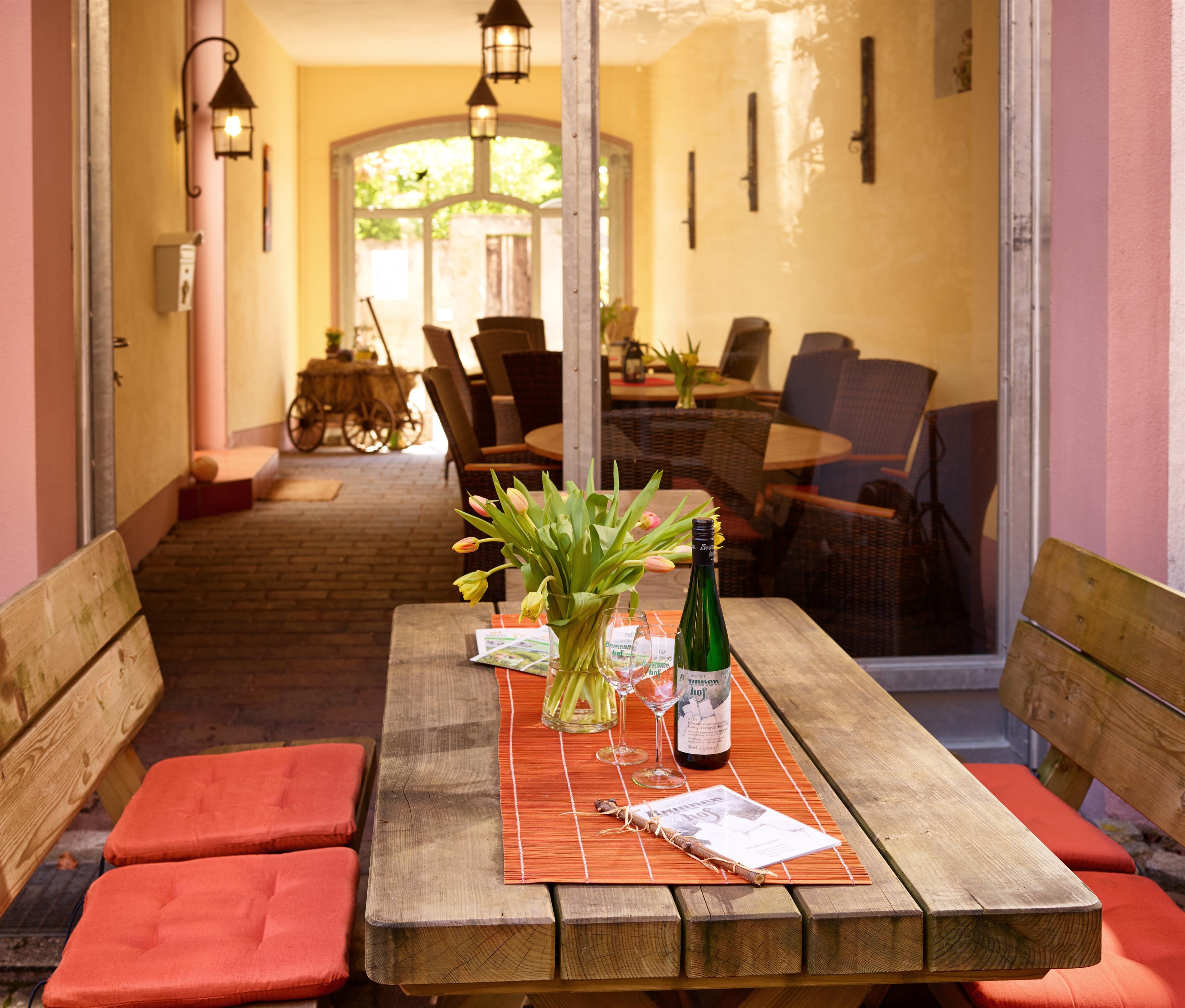 Gästehaus und Straußwirtschaft mit Weinprobierstube mit altem idyllischem Innenhof, Weinprobe im Gewölbekeller, Weinbergswanderung mit Weinprobe, Fackelwanderung, Sektempfang, Imbiss im Weinberg, Spanferkelessen, Flammkuchen, Gulasch im Brottopf, sonstige Attraktivitäten rund um den Wein nach Ihren Wünschen. 1 Glas Wein zur Begrüßung, Parkplatz, Garage für Motorrad und Fahrrad gratis