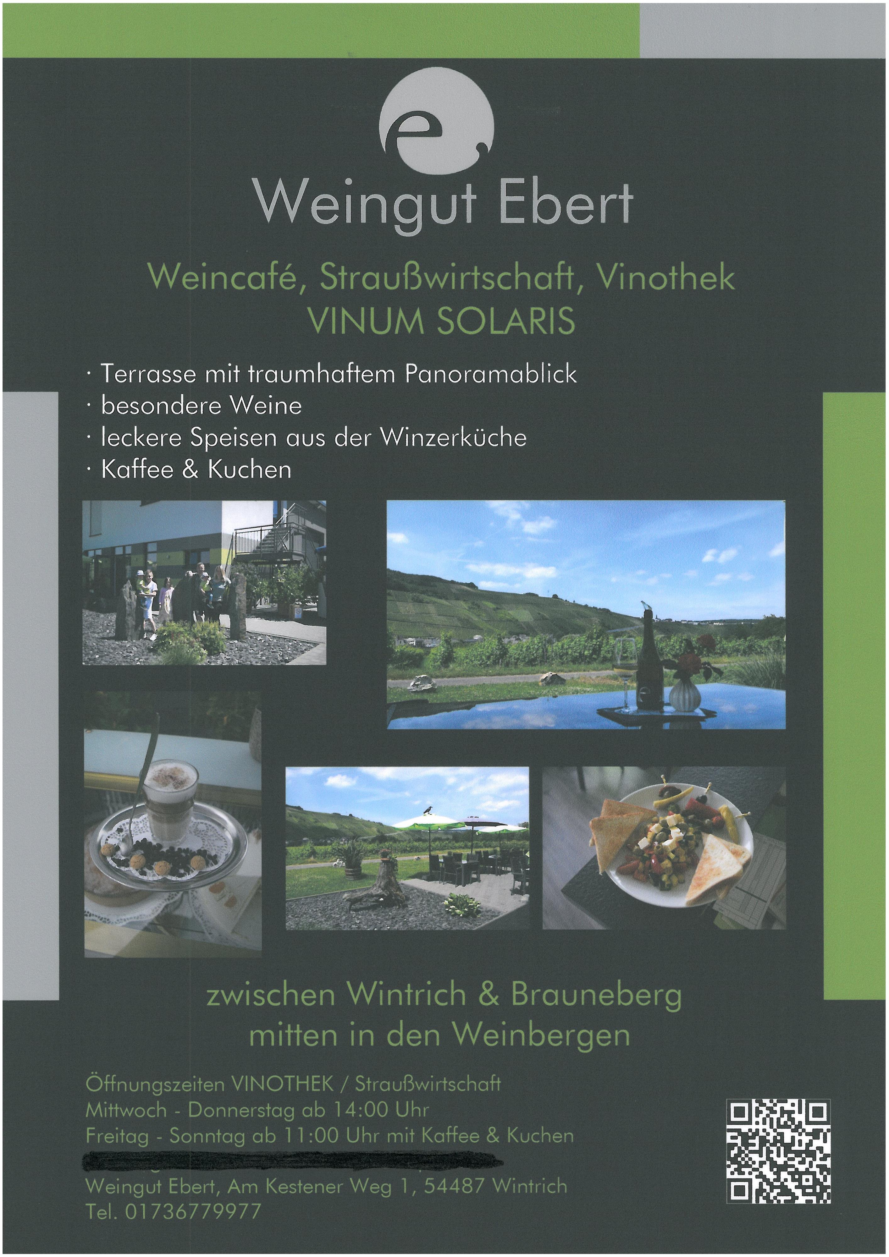 Das Weingut Ebert finden Sie im Moselort Wintrich. Das familiengeführte Weingut hat eine Weinbautradition, die bis ins 18. Jahrhundert zurückreicht. Seit dem Erwerb einer Edelobstbrennerei im Jahr 1982 werden auch Edelbrände und Liköre hergestellt. Bis zum Jahr 2003 wurden die Weine in Holzfässern ausgebaut. Diese wurden danach durch Edelstahltanks ersetzt. Angebaut werden Riesling, Kerner, Rivaner, Grauburgunder sowie Spätburgunder und Dornfelder. Probieren können Sie die Weine bei einer Weinprobe im Weinkeller des Weingutes oder Sie verbringen Ihren Moselurlaub in den Ferienwohnungen des Weinhofes.