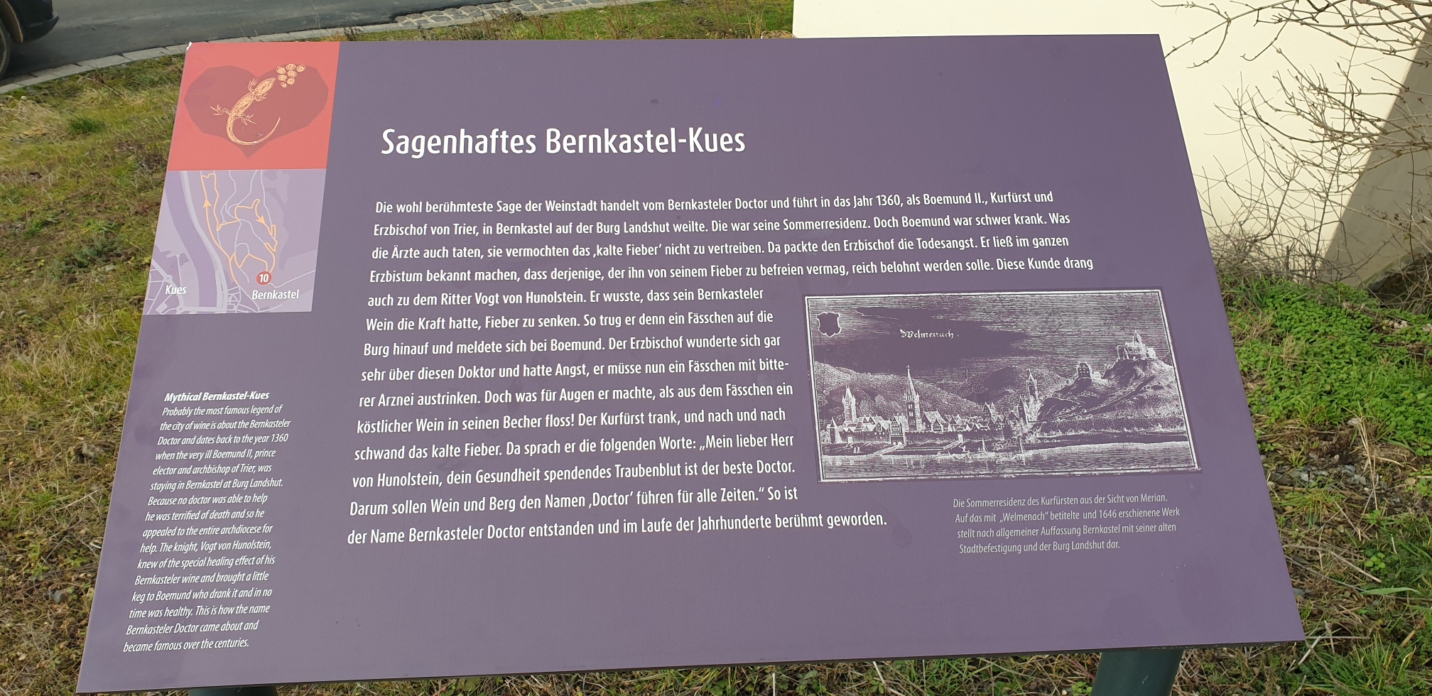 Der berühmte Doctorweinbergs: "Hier ward ein Kurfürst am Weine gesund." Wäre diese Aussage wissenschaftlich belegbar, wäre die 3,25 Hektar umfassende Weinlage "Bernkasteler Doctor" unbezahlbar. Denn dem Wein aus dieser Lage eilt der Ruf voraus im Jahr 1360 Kurfürst Boemund geheilt zu haben, der zu dieser Zeit krank auf der Burg Landshut daniederlag und dem scheinbar nichts helfen konnte. Seither heißt der Wein aus der Lage so. Gesichert ist aber, dass Geheimrat Julius Wegeler, Mitinhaber der Sektkellerei Deinhard, im Jahr 1900 eine Parzelle zum Preis von 100 Goldmark pro Rebstock erwarb. Seither gilt der Doctor als teuerster Weinberg Deutschlands.
