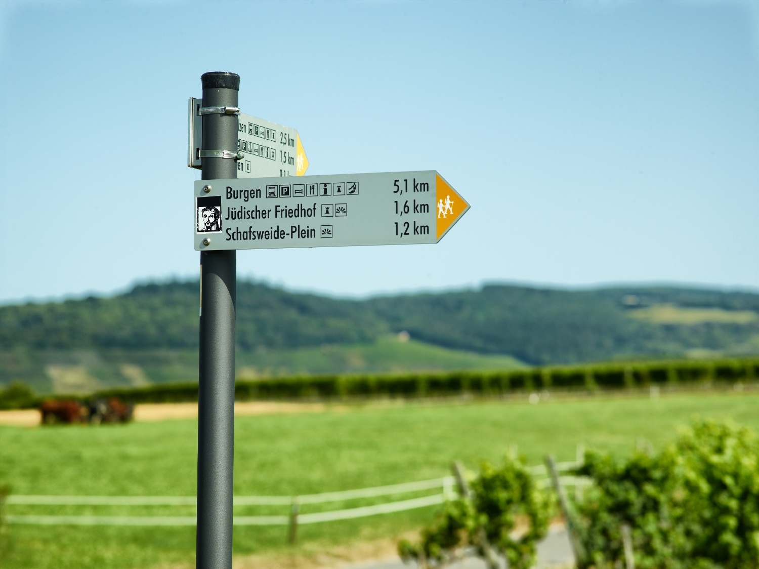 Bedeutende Zeugnisse und spannende Geschichten entdecken und erleben von Grafen, Bürgern und dem Schwarzen Peter, von Territorien und Dörfern, von Glaubenskämpfen und Kriegen, vom Leben und Arbeiten sowie von Baukunst und Wein: das ist der Grafschafter Wanderweg "Grafen, Gold und Schwarzer Peter".