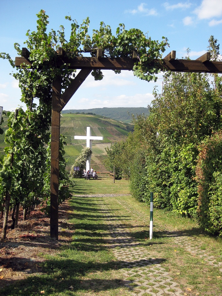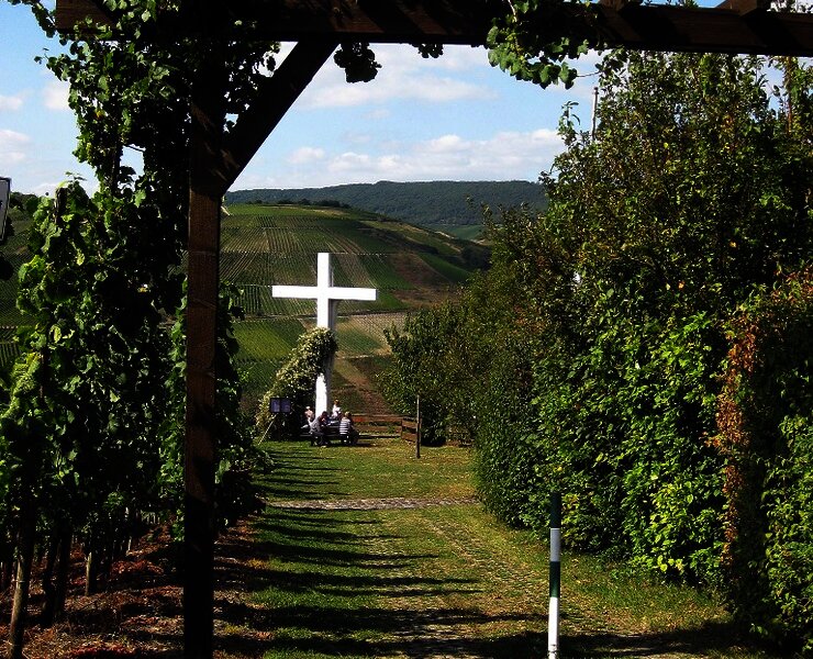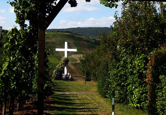 Die Wanderung führt über Weinbergswege hinauf zum Wahrzeichen von Wintrich, dem besagten "Großen Herrgott". Von hier oben eröffnet sich ein herrlicher Blick auf das Moseltal und die Staustufe von Wintrich. Am Aussichtspunkt stehen zudem Bänken und Stühle zum Rasten.