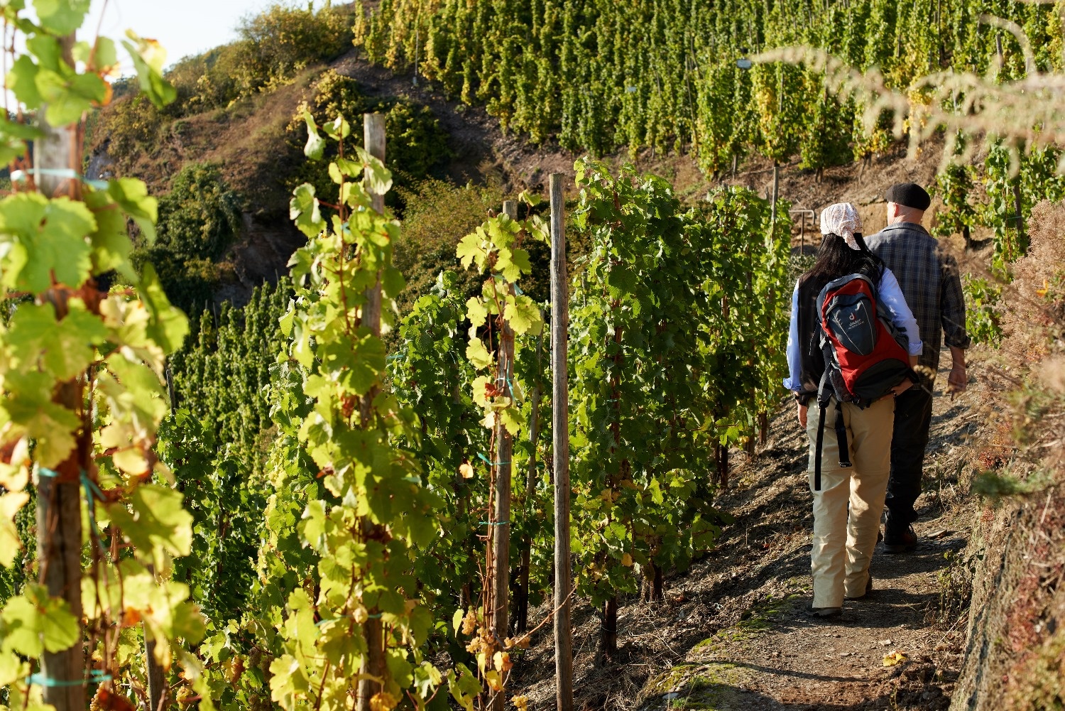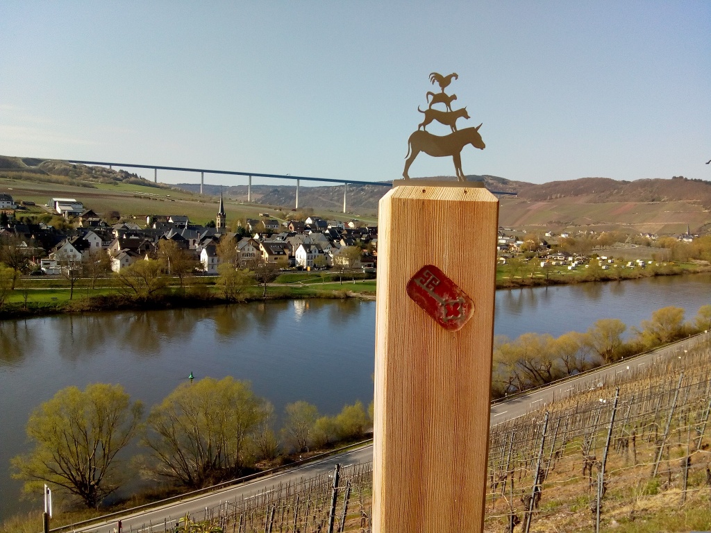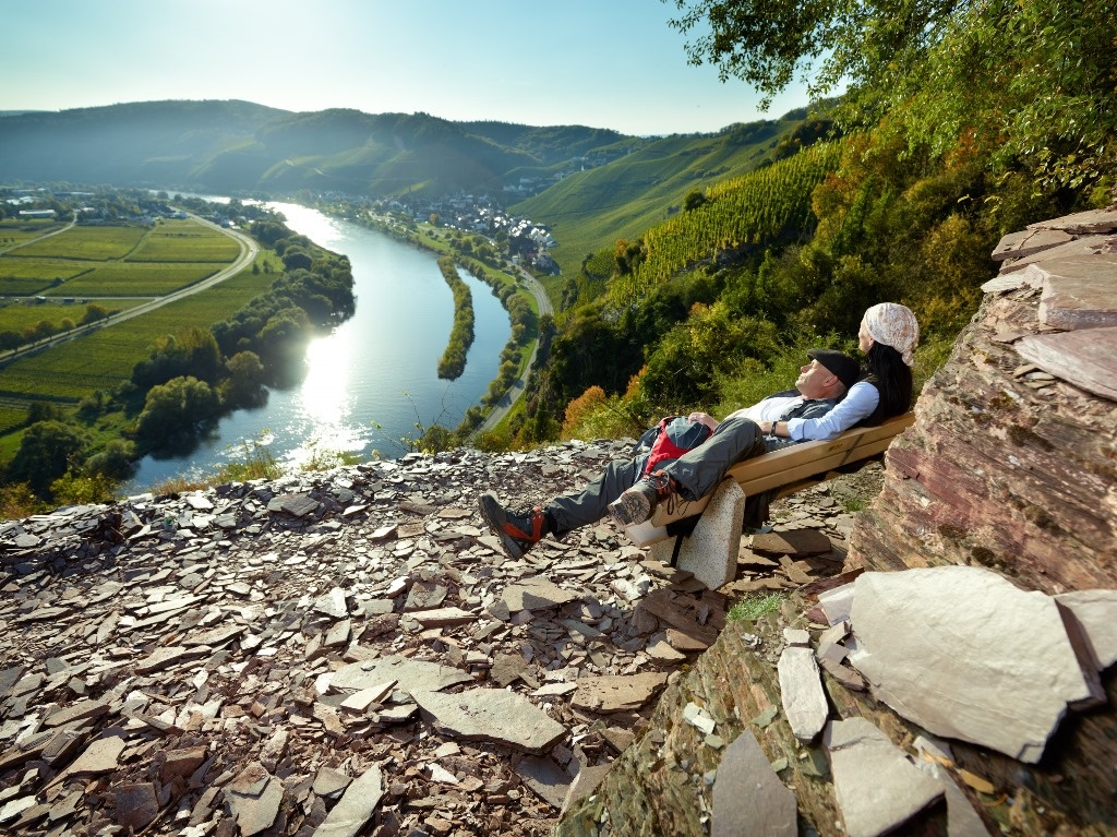 Von einer Sitzbank im Wald aus bietet sich ein toller Ausblick ins Tal und die Moselschifffahrt. Auf den nächsten Metern ist der Weg von hohen Sträuchern gesäumt und führt Sie zu einem Aufschluss, welcher die Formen des im Sonnenlicht rötlich leuchtenden Schiefergesteins erkennen lässt. Vorbei an einer Felswand können Sie die vielfältigen Schiefertafeln lesen, welche vorherige Wanderer mit ihren Namen eingraviert haben. Sie passieren ein schmales und einsames Metalltor und wandern auf einem von grünem Dickicht umgebenen Weg weiter. Über wenige Stufen und eine erneute Metalltreppe überwinden Sie weitere Höhenmeter. Am Gipfel angekommen haben Sie die Kletterpartie beendet und spazieren nun gemütlich weiter auf einem schmalen Waldpfad. Der Weg bringt Sie zur hölzernen Schutzhütte auf dem Burgberg. Der Abstieg ist weit weniger anstrengend, dennoch sollte Sie ihn mit Vorsicht laufen. Von rechts fließt ein schmaler Bach, welchen Sie vorsichtig überqueren müssen. Nur wenige Meter später gibt der dichte Wald den Blick auf die Weinterrasse oberhalb von Erden wieder frei. Ein letztes Mal erwarten Sie talabwärts Stufen. Auf dem breiten Weg durch die Weinberge verlieren Sie weitere Höhenmeter, an der nächsten Gabelung rechts passieren Sie neben Rebstöcken auch Obstwiesen. Die Wegweiser entlang der Serpentinen leiten Sie zurück ins Tal und zurück zur Brücke.