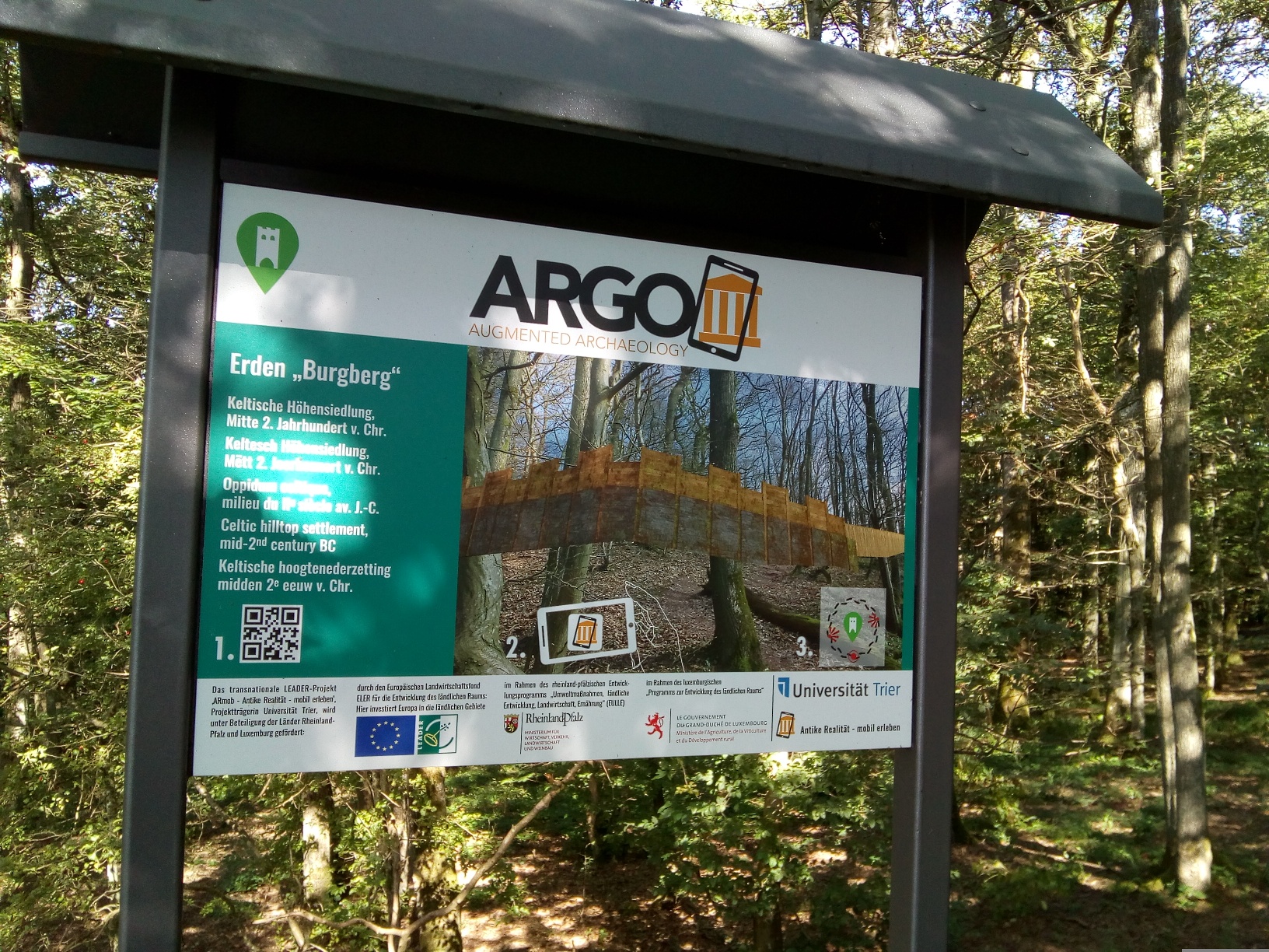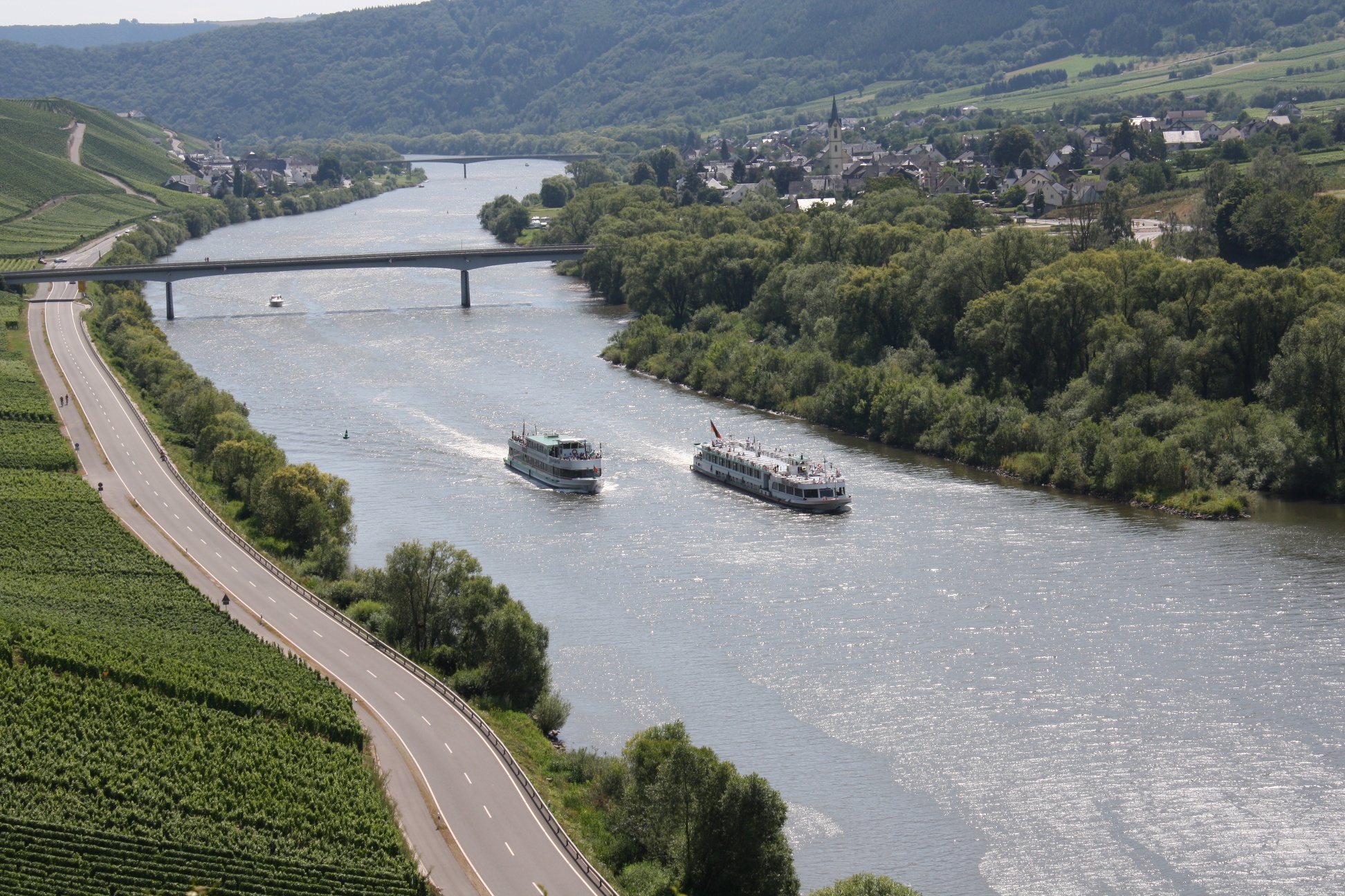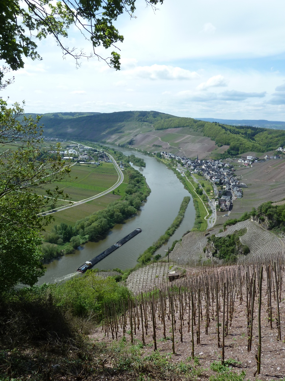 Von einer Sitzbank im Wald aus bietet sich ein toller Ausblick ins Tal und die Moselschifffahrt. Auf den nächsten Metern ist der Weg von hohen Sträuchern gesäumt und führt Sie zu einem Aufschluss, welcher die Formen des im Sonnenlicht rötlich leuchtenden Schiefergesteins erkennen lässt. Vorbei an einer Felswand können Sie die vielfältigen Schiefertafeln lesen, welche vorherige Wanderer mit ihren Namen eingraviert haben. Sie passieren ein schmales und einsames Metalltor und wandern auf einem von grünem Dickicht umgebenen Weg weiter. Über wenige Stufen und eine erneute Metalltreppe überwinden Sie weitere Höhenmeter. Am Gipfel angekommen haben Sie die Kletterpartie beendet und spazieren nun gemütlich weiter auf einem schmalen Waldpfad. Der Weg bringt Sie zur hölzernen Schutzhütte auf dem Burgberg. Der Abstieg ist weit weniger anstrengend, dennoch sollte Sie ihn mit Vorsicht laufen. Von rechts fließt ein schmaler Bach, welchen Sie vorsichtig überqueren müssen. Nur wenige Meter später gibt der dichte Wald den Blick auf die Weinterrasse oberhalb von Erden wieder frei. Ein letztes Mal erwarten Sie talabwärts Stufen. Auf dem breiten Weg durch die Weinberge verlieren Sie weitere Höhenmeter, an der nächsten Gabelung rechts passieren Sie neben Rebstöcken auch Obstwiesen. Die Wegweiser entlang der Serpentinen leiten Sie zurück ins Tal und zurück zur Brücke.