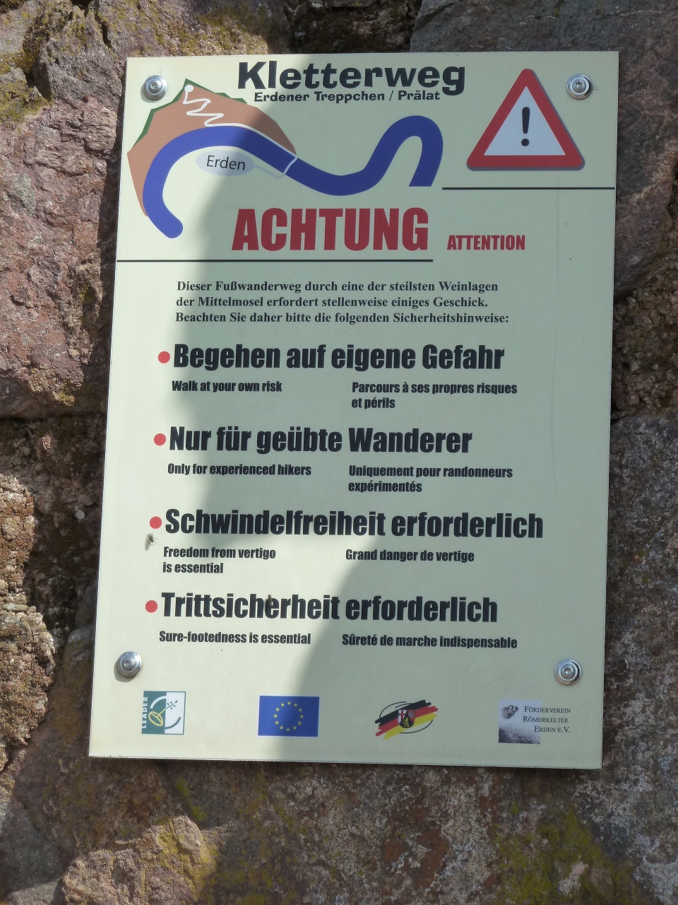 Ein "alpines" Erlebnis: Der anspruchsvolle Verlauf des Kletterwegs führt durch die Spitzenweinlagen "Erdener Treppchen" und "Prälat". Über alte Weinbergspfade und Leitern erklettert man Felsvorsprünge und Weinbergsterrassen. Die Mühen werden mit grandiosen Aussichten über das Moseltal und eine besondes bunte Vielfalt an Flora und Fauna wie Mauerpfeffer, Goldlack oder französischen Ahorn belohnt. Im Rahmen der "Initiative Lebendige Moselweinberge" ist dieser Bereich als "Leuchtpunkt der Artenvielfalt" ausgezeichnet worden.