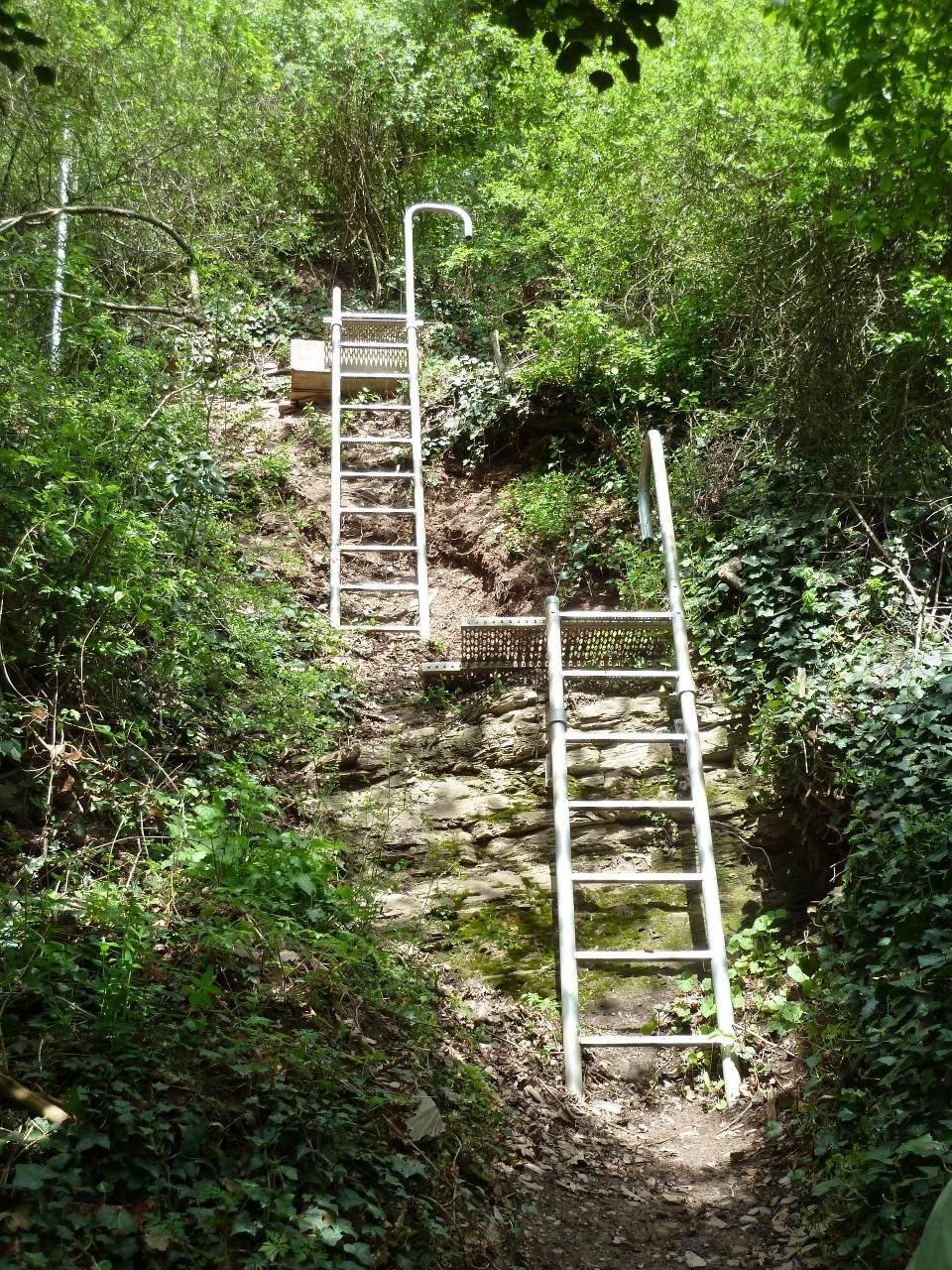 Ab dem Wandererparkplatz am Brückenkopf in Lösnich führt Sie der Weg über die Mosel und verläuft am Ende der Brücke links in die Weinberge. Sie können den Klettersteig auf der grünen, gelben oder roten Route wandern. Die jeweiligen Farben geben den Schwierigkeitsgrad an und sind durchgehend ausgeschildert. Hinter der Brücke weist der Wegweiser in die Weinberge, welche Sie etwas oberhalb der Mosel am Südhang durchwandern. Zur Rechten wird die Mauer mit jedem Meter höher, linker Hand begleiten Sie weiterhin die Rebstöcke. Der Weg endet in einer Sackgasse, hier nimmt der 2008 eröffnete Klettersteig seinen Anfang. Dem roten Punkt folgend, ergibt sich folgende Wegbeschreibung: Sie folgen der Treppe, welche am rechten Weinberg beginnt und gelangen auf einen schmalen Pfad. Zunächst führt Sie der Steig noch einfach an einem Geländer entlang und überquert das Gleis einer Einschienenbahn, der Monorackbahn. Diese Bahn ist eine Sonderform der Einschienenbahn, welche auch als Zahnradbahn bezeichnet werden kann und wird besonders in den Steilhängen der Mosel genutzt. Der Weg führt Sie auf losem Schiefergestein steil aufwärts. Sie überqueren wieder die Schiene der Bahn, bevor es heißt: gut festhalten! Die Sprossen einer metallenen Leiter erfordern Schwindelfreiheit, kurz darauf geht es etwas leichter auf Betontreppen weiter. Sie überwinden weitere Höhenmeter auf Schieferboden und einer erneuten im Fels angebrachten Steigleiter. Oben angekommen lädt ein gemütlicher Picknickplatz mit stabilen Holzmöbeln zu einer Verschnaufpause ein. Der Ausblick ins Moseltal ist überwältigend. Sie gehen weiter - der Beschilderung folgend - eine Betontreppe herauf, welche abermals vor einer hohen Wand mit Treppenstufen endet. Nach dem Erklimmen der Felswand wandern Sie in einem Rechtsbogen um eine Felsnase herum. Der Berg lässt den Blick auf die Moselschleife und den Weinort Ürzig frei. Neben der Schiene der Monorackbahn führt Sie der Weg weiter auf eine steil aufragende Schieferwand zu. Ein am Felsen montiertes Seil dient als Geländer. Die in den Fels geschlagenen Stufen werden dann in einer mit Efeu berankten Felswand wieder von Leitern abgelöst. In diesem urigen Wald bietet sich eine prächtige Flora und Fauna. Sie sollten die Bäume einen Moment betrachten und auch nach Eidechsen Aussicht halten. Diese können hier, wie auch auf dem restlichen Stück des Klettersteigs, in großer Vielfalt und Vielzahl erblickt werden.