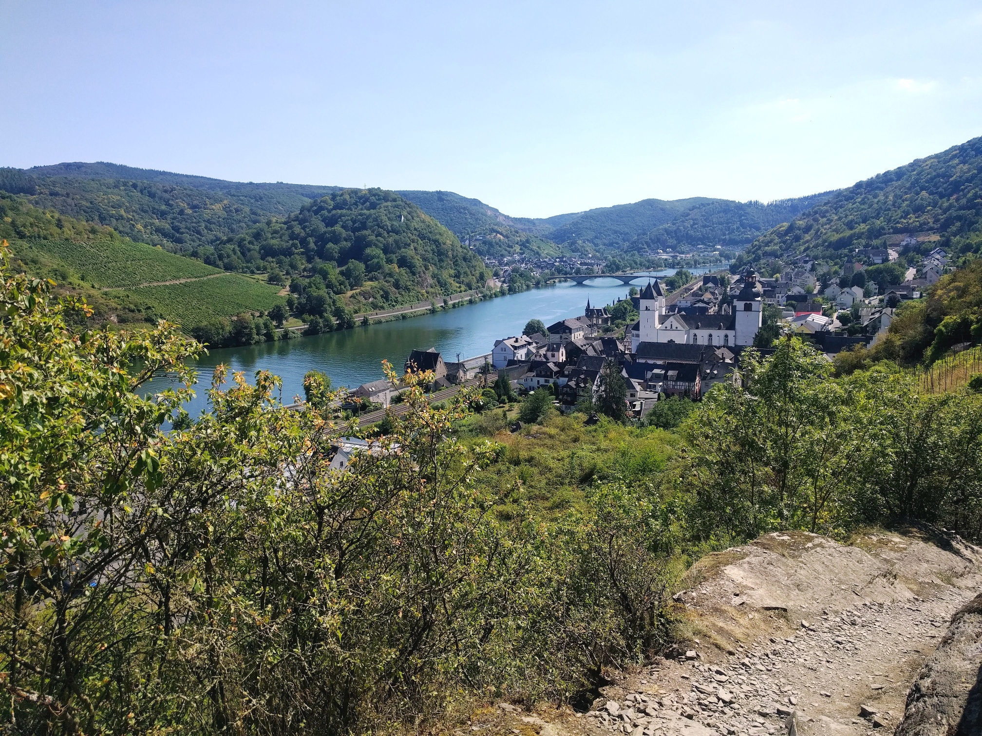 Erneut wird hier die Moselseite gewechselt. Am Ende der Brücke nach links, dann nach wenigen Metern die Straße überqueren und über einen Serpeninenpfad hinauf zur Marienburg (Jugendbildungsstätte des Bistums mit Kapelle) mit toller Aussicht. Anschließend in südöstliche Richtung zu einer Straße, die auf den Zeller Stadtteil Barl führt . Dieser aber nur ein kurzes Stück folgen, dann links ab und immer geradeaus, an der Ruine Marienthaler Hof vorbei nach Zell-Kaimt (Abstecher zur Pfarrkirche St. Jakobus!). Über eine Fußgängerbrücke wieder auf die rechte Moselseite nach Zell. Dort am Moselufer entlang zum Ortsteil Notenau. Hier einbiegen und rechts hoch, an der ehemaligen Wassertretanlage vorbei, zum Aussichtspunkt „Beinter Kopf“, danach zur „Schönen Aussicht“ und schließlich auf den Bummkopf. Dort die K 52 überqueren und durch den Wald, später durch die Weinberge, hinab nach Enkirch (Rundgang einplanen). Hier geht es wieder bergauf zum ‚Rottenblick‘, von dort auf prächtigem Panoramaweg („Kirst“) nach Starkenburg mit der wunderschönen evangelischen Kirche. Beim „Pavillon“ führt der Camino linkerhand zur Ruine Grevenburg, von dort hinab nach Traben-Trarbach mit seinen beeindruckenden Jugendstilhäusern (Pilgerherberge ‚Alte Lateinschule!).