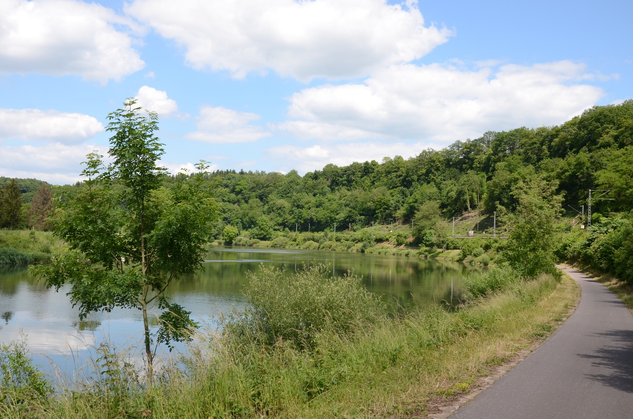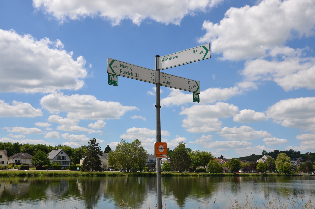 Am Bahnhof vorbei und links unter den Gleisen hindurch zur Mosel. Nach rechts auf den Uferradweg und diesem asphaltierten Weg folgen bis nach Besch. Am Ortsende führt die Route rechts von der Mosel weg um einen Industriebetrieb herum an renaturierten Kiesgruben vorbei. Schließlich wieder links zur Mosel hin und dem Leinpfad entlang der Mosel folgen durch ein Vogelschutzgebiet, vorbei am Campingplatz bis zur Moselbrücke, die nach Remich führt. Unter der Brücke hindurch weiter auf dem asphaltierten Uferradweg links der Bahngleise nach Palzem. Hinter Palzem verläuft die Route zunächst moselfern durch die Weinberge, dann durch Uferwiesen bis nach Wehr. Zwischen Mosel und Bahngleisen geht es vorbei an Wincheringen und Rehlingen bis zum Etappenziel Nittel.