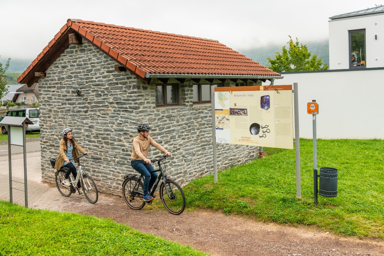 Ganz im Zeichen der alten Römer präsentiert sich die dritte Etappe des Mosel-Radwegs. Startpunkt ist Trier - eine wahre Schatzkammer römischer Baukunst, die noch heute entscheidend das Stadtbild prägt. Über die Kaiser-Wilhelm-Brücke führt der Radweg am linken Moselufer entlang zunächst in den Stadtteil Pfalzel, der lange Zeit die Sommerresidenz der römischen Kaiser war, und schließlich nach Schweich mit seinem barocken Fährturm. Hier wechselt der Radweg auf die rechte Moselseite und das Landschaftsbild verändert sich langsam vom offenen zum enger werdenden Tal. Am Etappenziel in Mehring wartet die Villa Rustica - ein rekonstruiertes römisches Landgut - darauf, vom luxuriösen Alltag der römischen Siedler zu erzählen.