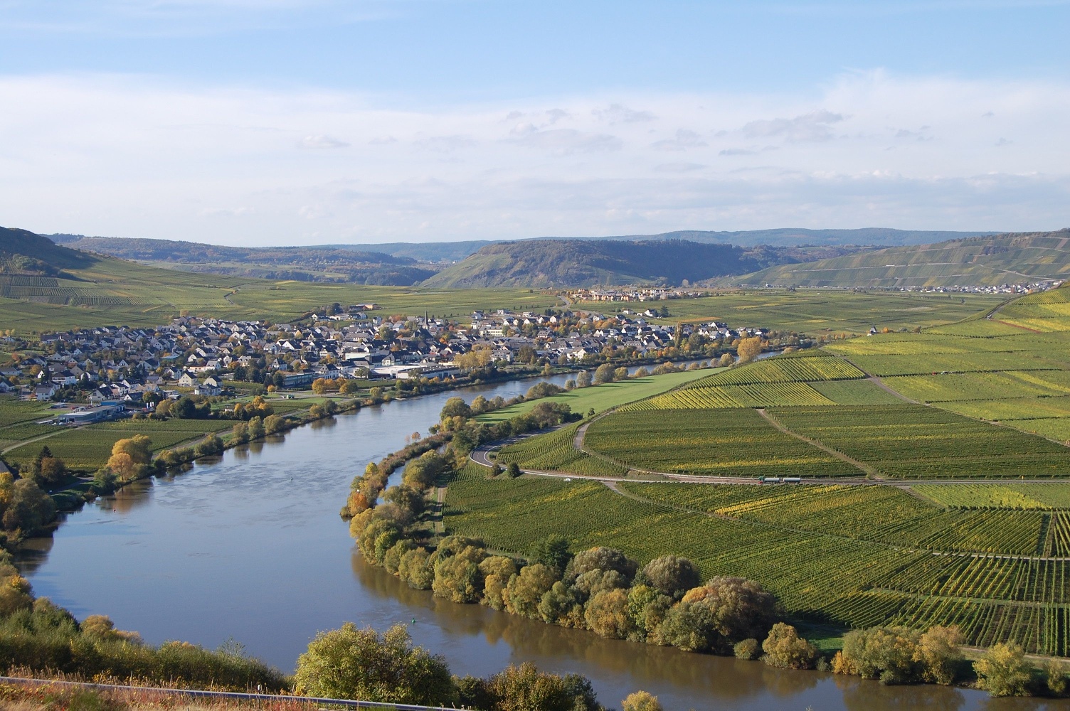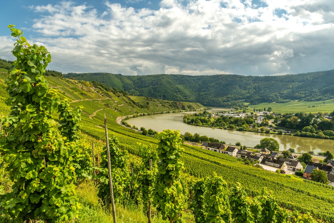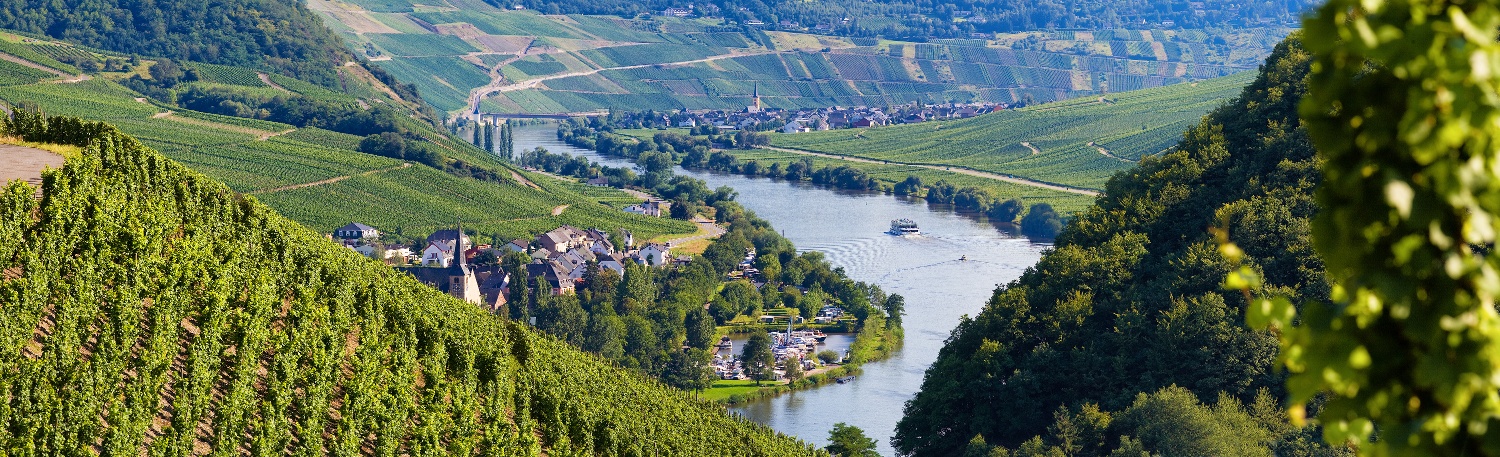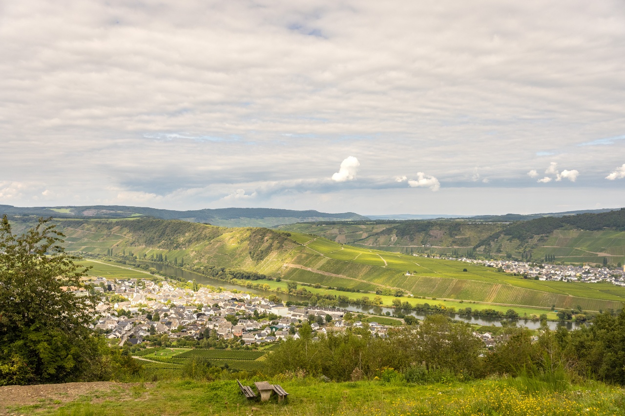 Der weitere Anstieg hinter der Kapelle führt zunächst noch durch Weinberge, die aber etwas höher durch niedrigen Wald abgelöst werden. Bei einer Streuobstwiese wird der Blick ins Moseltal wieder frei. Eine Schutzhütte bietet auch Rastmöglichkeiten, damit du die Aussicht etwas länger genießen kannst. Durch niedrigen Wald geht es weiter zum Rand des Ferienparks Sonnenberg, zuletzt auch richtig steil. Hier, oberhalb des Wildgeheges, solltest du dich unbedingt umdrehen und beim Verschnaufen die wunderbare Aussicht in Richtung Mosel bewundern. Der Moselsteig führt jetzt abwärts in den Wald hinein und bleibt auch auf dem weiteren Weg bergab noch im Wald. Nach einigen Häusern des Ortsteils Zummethöhe erreichst du am Parkplatz die Kreisstraße. Nach der Überquerung stehst du oberhalb der Weinberge und siehst vor dir die Trittenheimer Moselschleife – eine der ganz typischen, von Weinbergen gesäumten Schleifen der Mittelmosel. Trittenheim mit seiner Kirche, das inmitten der Schleife liegt, rundet dieses wunderschöne Bild ab. Ein Zuweg führt von hier in den bekannten Weinort.