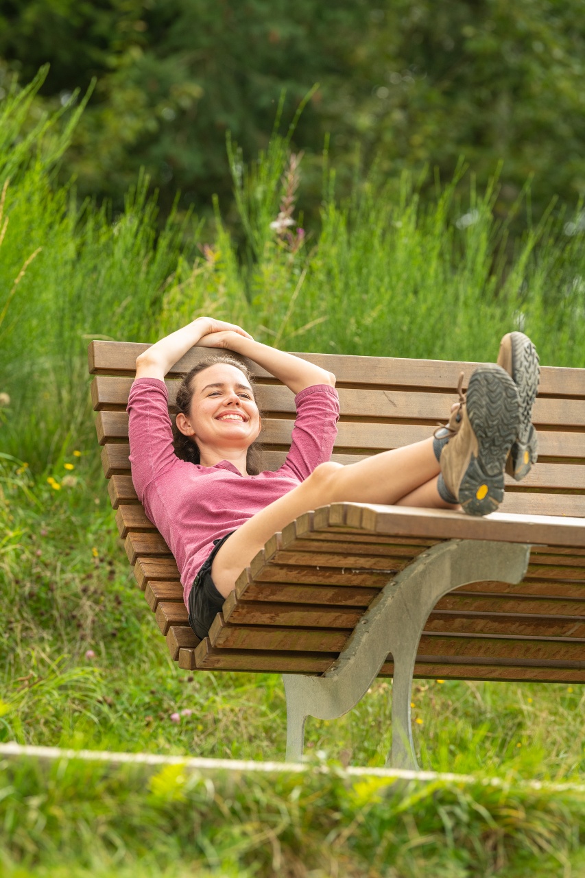 Über eine Treppe erreicht der Moselsteig den Bergrücken, und nun verlässt der Weg kurz das Moseltal, um im Seitental der Kleinen Dhron durch ehemalige Weinbergsflächen anzusteigen. Oft scheint auf dieser Seite des Berges schon die Sonne, während im Moseltal noch Nebel hängt. Und so ist der Blick frei ins Tal auf die wenigen Häuser des Ortsteils Dhrönchen, in dem der Schriftsteller Stefan Andres geboren wurde. Ihm begegnet der Moselsteig Wanderer auch in Schweich. An der Grillhütte Vogelsang erreichst du wieder die Hangkante des Moseltals, und nach wenigen Metern stehst du am Aussichtspunkt Vogelsang, der einen Ausblick auf die Trittenheimer Moselschleife aus einer anderen Perspektive ermöglicht. Eine kleine Kanzel unterhalb des Weges steht als Ausguck nahezu senkrecht über der Mosel.