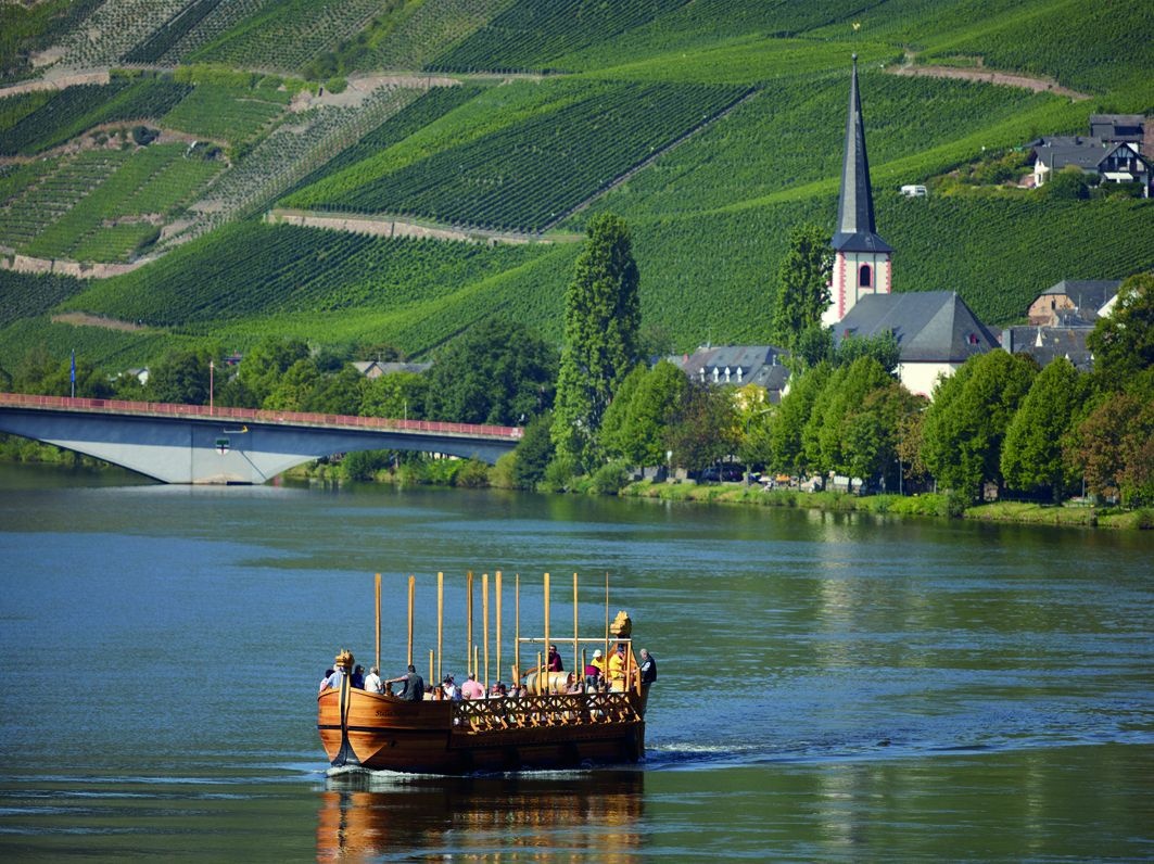 Zwischen Straße und Weinbergen führt der Moselsteig nun entlang des Kreuzweges weiter in Richtung Neumagen. Noch ein kurzes Stück über den Radweg, dann ist der Ortsrand erreicht. Über einen Wiesenweg (die ehemalige Bahntrasse der Moselbahn) gelangst du an Yachthafen und Campingplatz vorbei ins Zentrum von Neumagen-Dhron. In den Sommermonaten liegt der Nachbau eines römischen Weinschiffs, die , im Hafen und bietet einen würdigen Abschluss dieser Moselsteig Etappe!