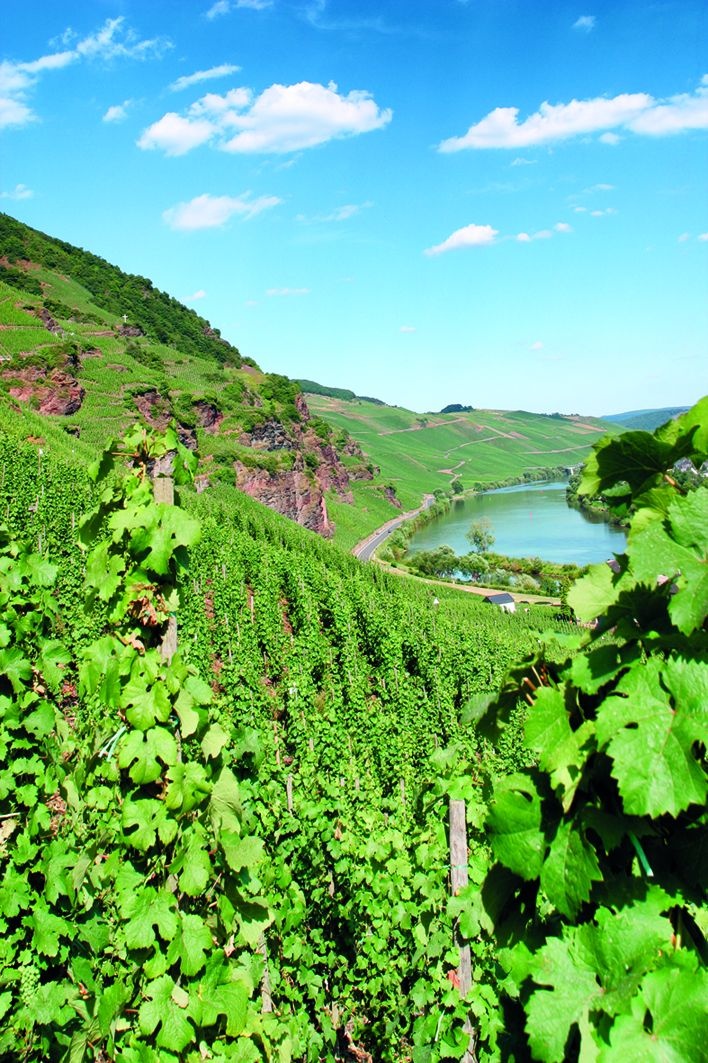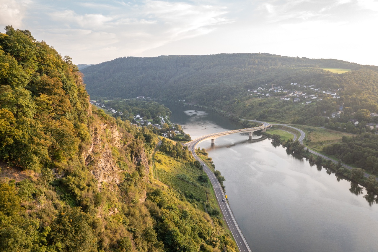 Die folgende Passage führt abwärts durch den Wald. Vor allem der pfadige Abschnitt durch den Buchenhochwald ist im Frühjahr und Herbst besonders schön. Am Ausgang des Waldes gibt dir ein Schieferaufschluss Einblick in den Aufbau des Untergrundes. Außerdem führt von hier ein Zuweg bis zu den Orten Erden und Lösnich auf der anderen Moselseite. Weiter verläuft der Weg relativ eben oberhalb der Weinberge, bis der Moselsteig zur L 58 aufsteigt. In engen Serpentinen geht es bergab an einem Aussichtspunkt mit Rastmöglichkeit vorbei und zurück in die Weinberge. Nach einem kurzen bergauf Abschnitt ist die Landstraße wieder erreicht. Hier bietet sich die Möglichkeit, über einen Zuweg nach Kinheim abzusteigen. Der Moselsteig quert die Straße. Wieder geht es kurz steil bergauf zwischen Weinbergen und Waldrand. Im Wald durchquerst du das Klingelbachtal, teils auf einer wunderschön pfadigen Passage. Am Ende des Waldes wird der Blick auf die Weinberge und bis zur Mosel frei. Hier gibt es zum ersten Mal eine Sicht auf Kröv, den weltbekannten Weinort, den du im weiteren Verlauf dieser Moselsteig Etappe noch aus unterschiedlichen Blickwinkeln erleben wirst! Nun führt der Moselsteig wieder in den Wald, der diesmal von Eichen geprägt ist. Falls du Lust auf einen Abstecher hast: Über Zuwege kannst du zum Kröver Freizeitzentrum auf- oder nach Kröv selbst absteigen. Der Weg folgt jetzt ein ganzes Stück dem Waldrand. Unterhalb des Waldrandes gibt es Weinberge und damit freien Blick auf die gesamte Moselschleife bei Kröv. Ein interessanter Lehrpfad zum Schiefer zeigt, wie wichtig das Gestein für den Weinanbau hier ist. Die Grillhütte Hänchens Born mit tollem Blick auf Kröv liegt direkt oberhalb des Wegs. Etwas weiter auf dem Panoramaweg erreicht der Moselsteig die Kröver Bergkapelle. Werf einen Blick in die Kapelle und gönne dir nun eine erholsame Rast mit schönem Blick auf Kröv!