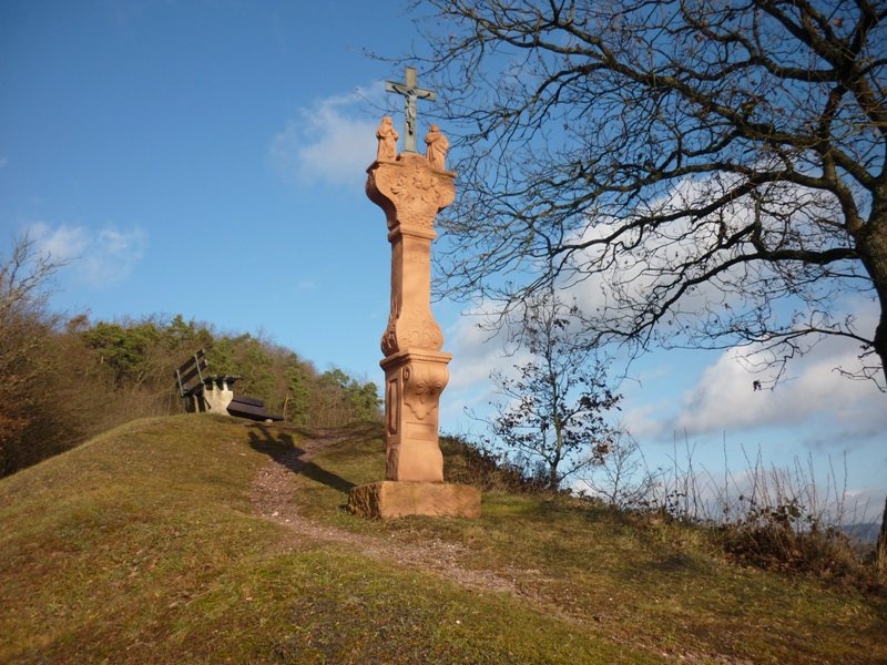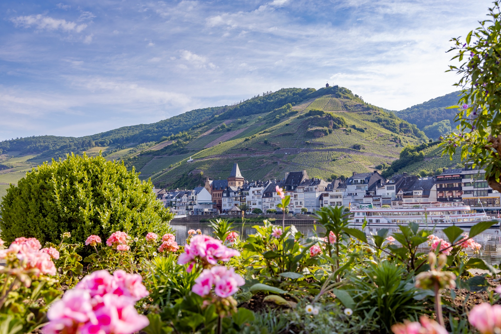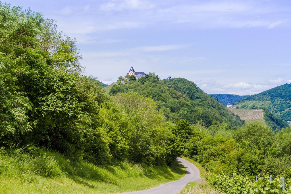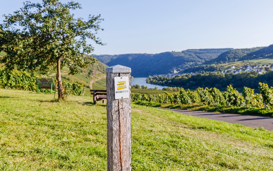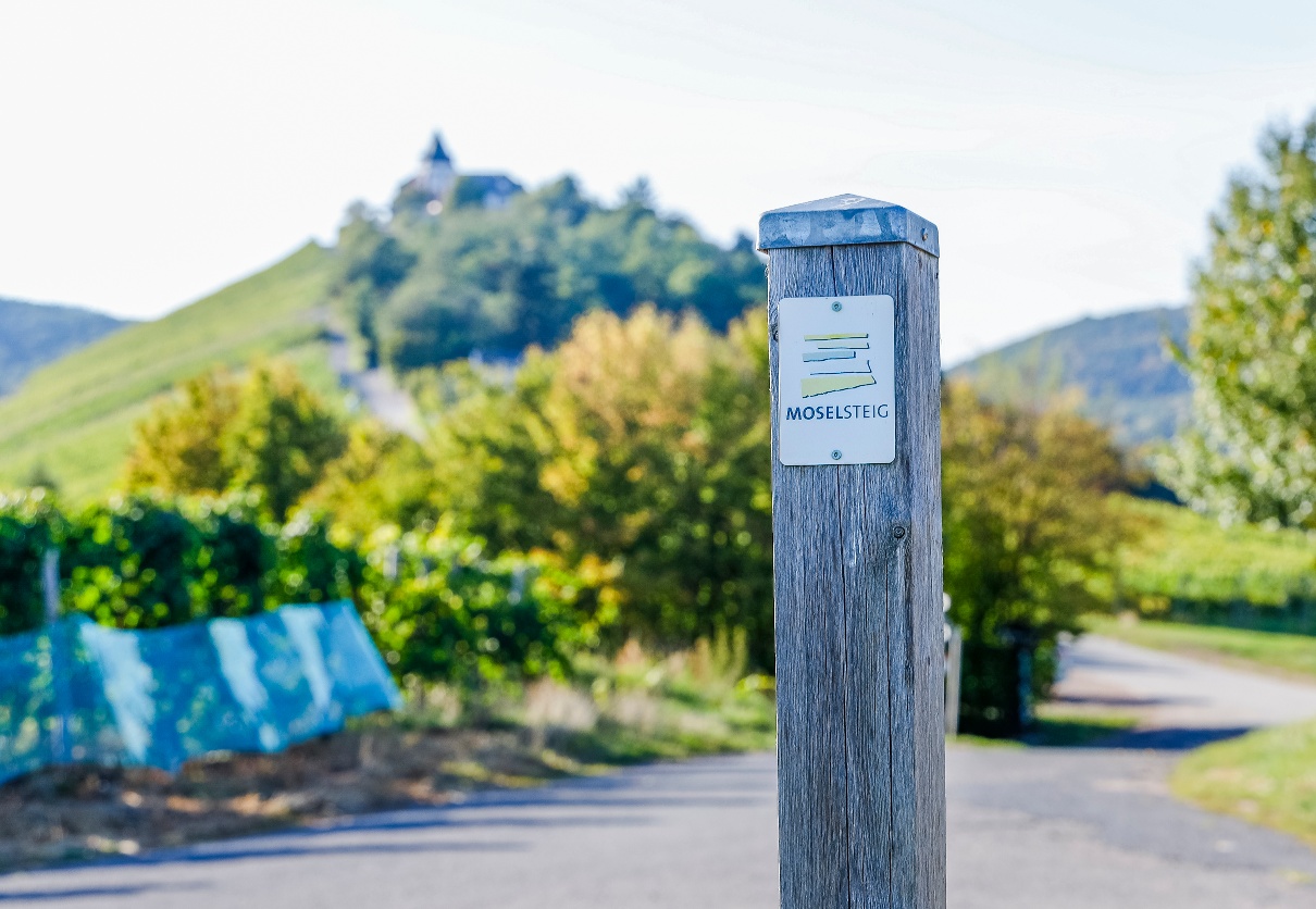 Am Reiler Bahnhof in der Kaiserstraße startet die Etappe. Die ersten Meter verläuft der Moselsteig auf der gleichen Trasse wie der Kanonenbahnweg, über das Gelände des Bahnhofs in eine ruhige Wohnstraße. Die führt dich zum Ortsrand, und nachdem du die Gleise überquert hast, geht es durch die Weinberge bergauf. Kreuzweg-Stationen begleiten den Weg. Auf dem Sattel des Reiler Halses erreicht der Moselsteig dann am Parkplatz eine Kapelle und ein Wegekreuz. Bänke laden hier nach dem Anstieg zu einer kurzen Verschnaufpause ein, und der Blick zurück auf Reil lohnt sich! Flussabwärts kannst du schon viele Zwischenziele der heutigen Etappe erkennen, etwa den Aussichtsturm auf dem Prinzenkopf oder die Marienburg.