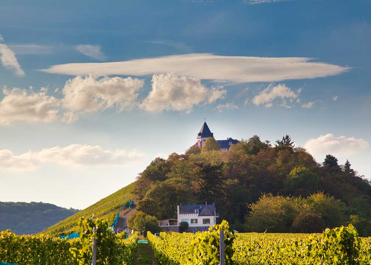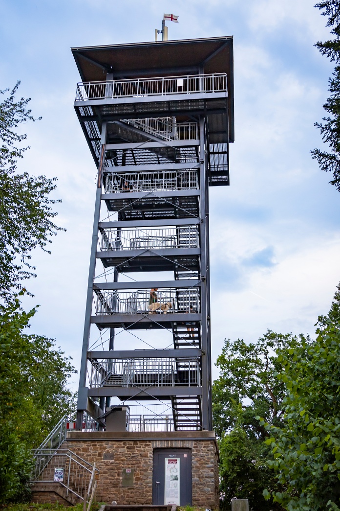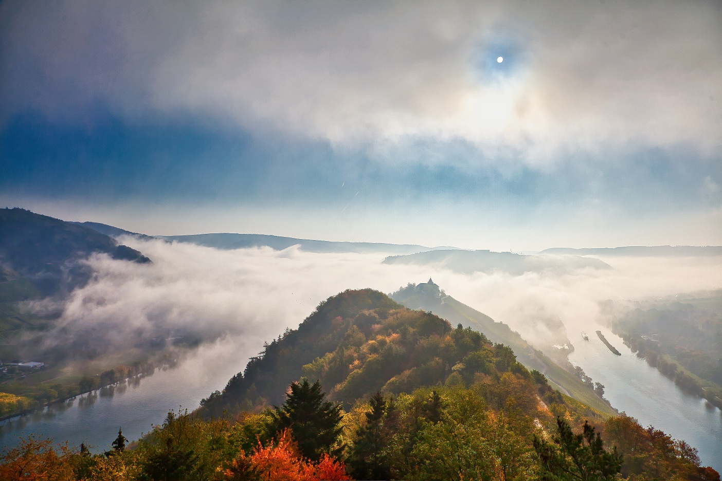 Doch der Weg bietet noch bessere Aussichten, die nicht lange auf sich warten lassen. Der Ehrenfriedhof ist auf dem Kammweg schnell erreicht. Von hier gelangst du über einen Zuweg nach Alf. Der Moselsteig führt nun steil aufwärts zum Aussichtsturm Prinzenkopf. Den solltest du nicht unbestiegen lassen, denn die Aussicht von hier oben ist wirklich atemberaubend! Die beiden Arme der Zeller Moselschleife sind so dicht benachbart, dass du die Mosel mehrfach sehen kannst! Der Blick reicht über Reil, Pünderich, Briedel bis nach Bullay, Alf, St. Aldegund und Neef. Und in Richtung Zell thront die Marienburg auf dem von Reben bestandenen Sattel. Die Aussicht von hier oben ist so schön, dass es nicht verwundert, dass der eiserne Turm nicht der erste an diesem Platz ist. Er hatte auch schon hölzerne Vorgänger.
